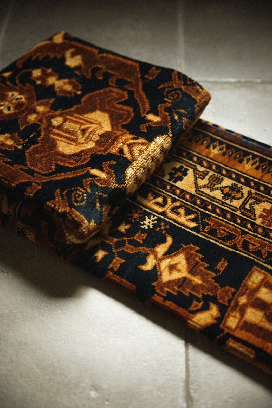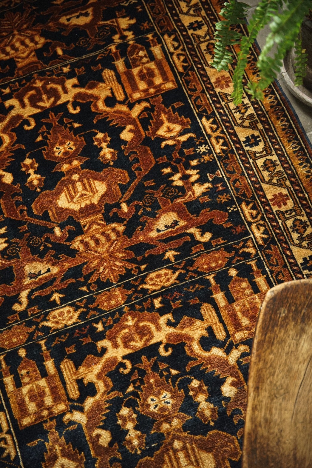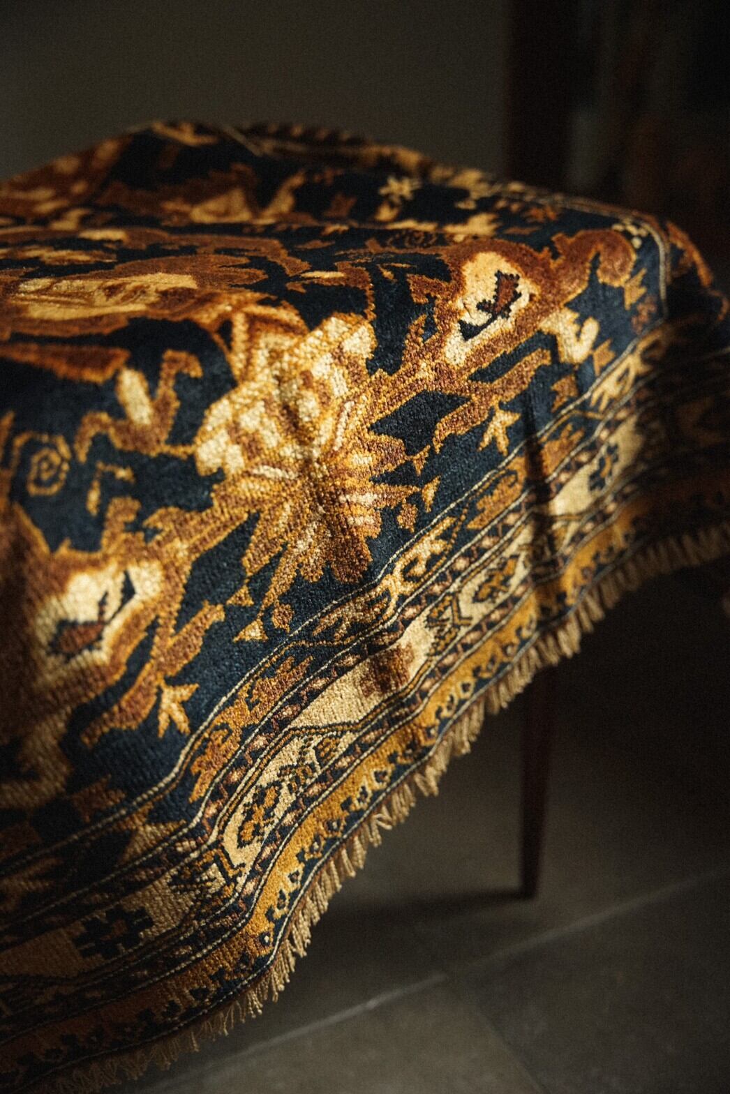 ブラウンとネイビーがベースの渋めの色合いがとても魅力的なアリホジャラグ。フィールドに大きく描かれているのはキャンドルモチーフです。周りにはミフラーブや炎のようなモチーフが幾何学的に描かれています。華やかなデザインですが、落ち着いた色味でまとまっているため、お部屋に敷いてもしっくりと馴染んでくれます。パイルは短めですがトルクメン族特有の細かい打ち込みでしっとりと滑らか。ダメージもなくコンディションも良好です。使いやすいサイズ感ですので、お気に入りの場所にどうぞ!