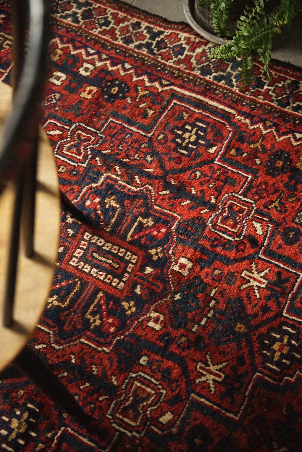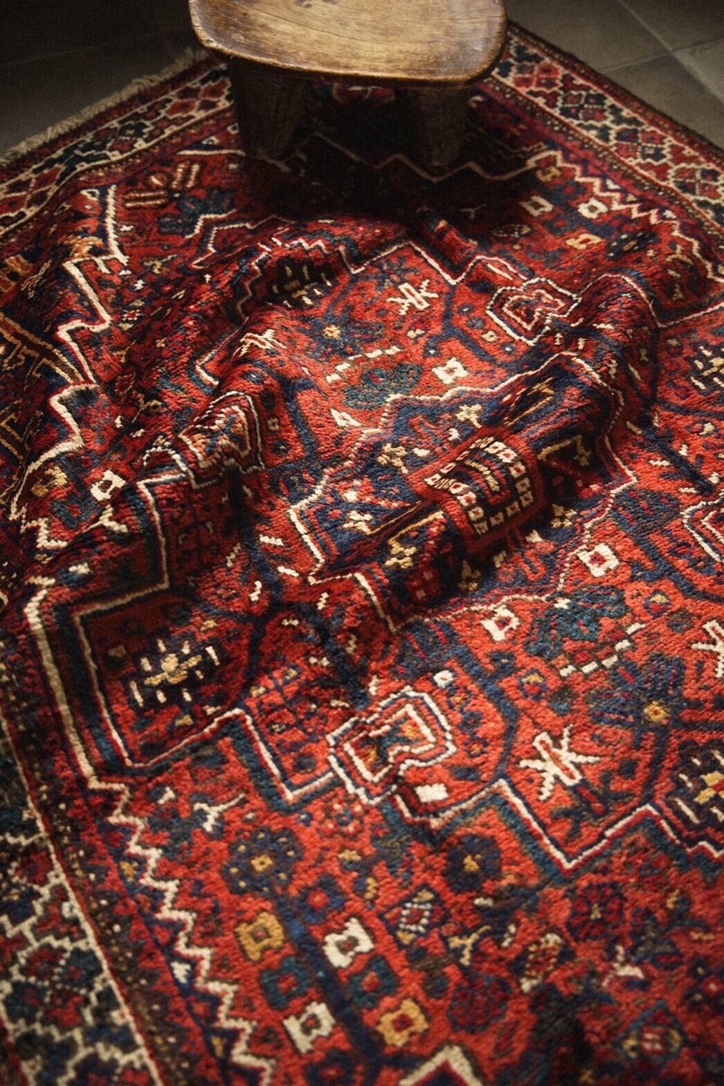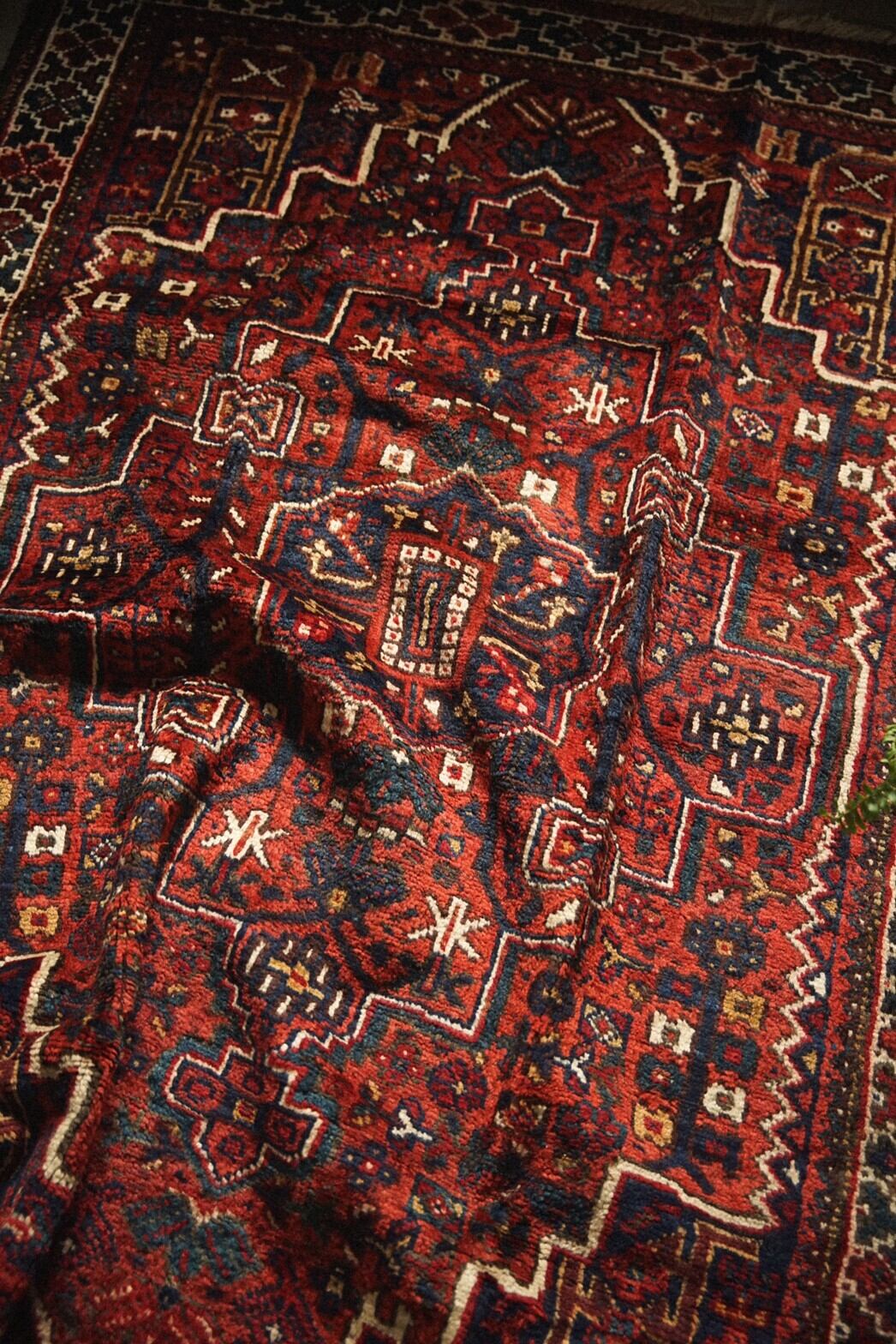 1940年代に織られた深い赤がとても美しいセミアンティークのカシュガイラグ。よく見るタイプの可愛らしいデザインのカシュガイラグとはちょっと違い、草花や木が幾何学的に描かれた力強いデザイン。深みのある赤とネイビーをベースにシックな色でまとめられていて、統一感があるまとまり感のある一枚。パイルも綺麗に残っており、柔らかで油分を含んだ上質な羊毛は肌触りもとても良いです。リビングやソファ前、デスクの下や書斎などにピッタリな存在感のある赤いラグ。男性の方のお部屋にもおすすめです!
