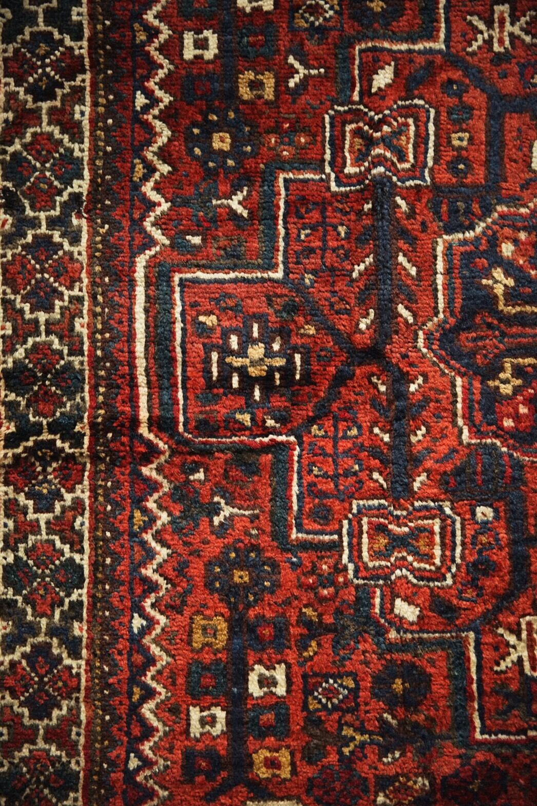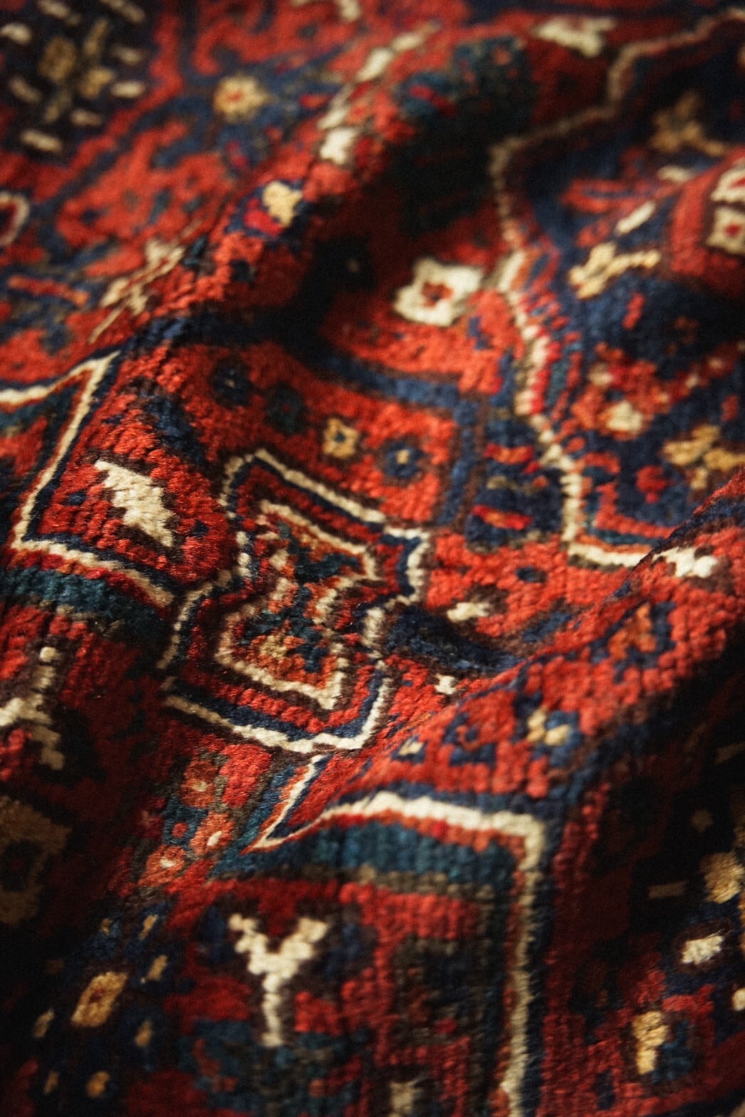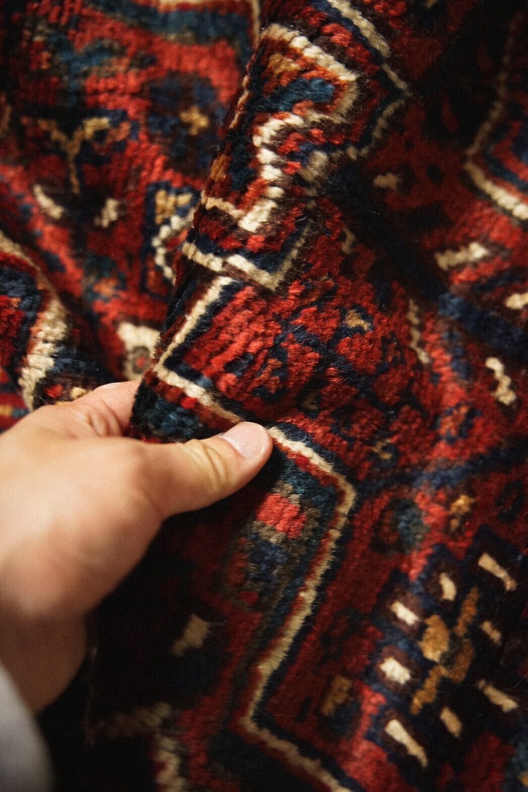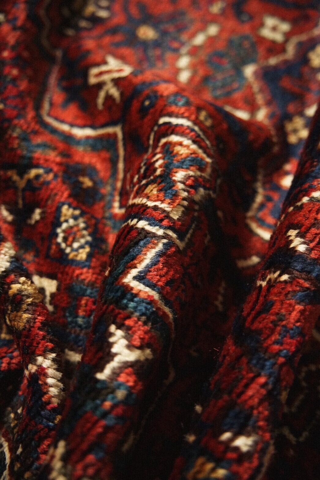 1940年代に織られた深い赤がとても美しいセミアンティークのカシュガイラグ。よく見るタイプの可愛らしいデザインのカシュガイラグとはちょっと違い、草花や木が幾何学的に描かれた力強いデザイン。深みのある赤とネイビーをベースにシックな色でまとめられていて、統一感があるまとまり感のある一枚。パイルも綺麗に残っており、柔らかで油分を含んだ上質な羊毛は肌触りもとても良いです。リビングやソファ前、デスクの下や書斎などにピッタリな存在感のある赤いラグ。男性の方のお部屋にもおすすめです!