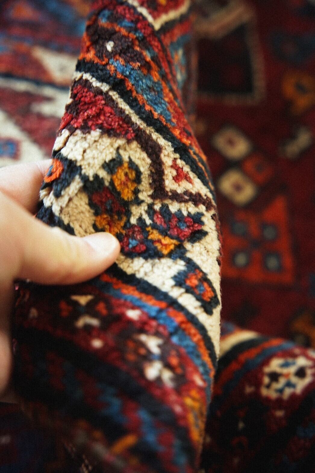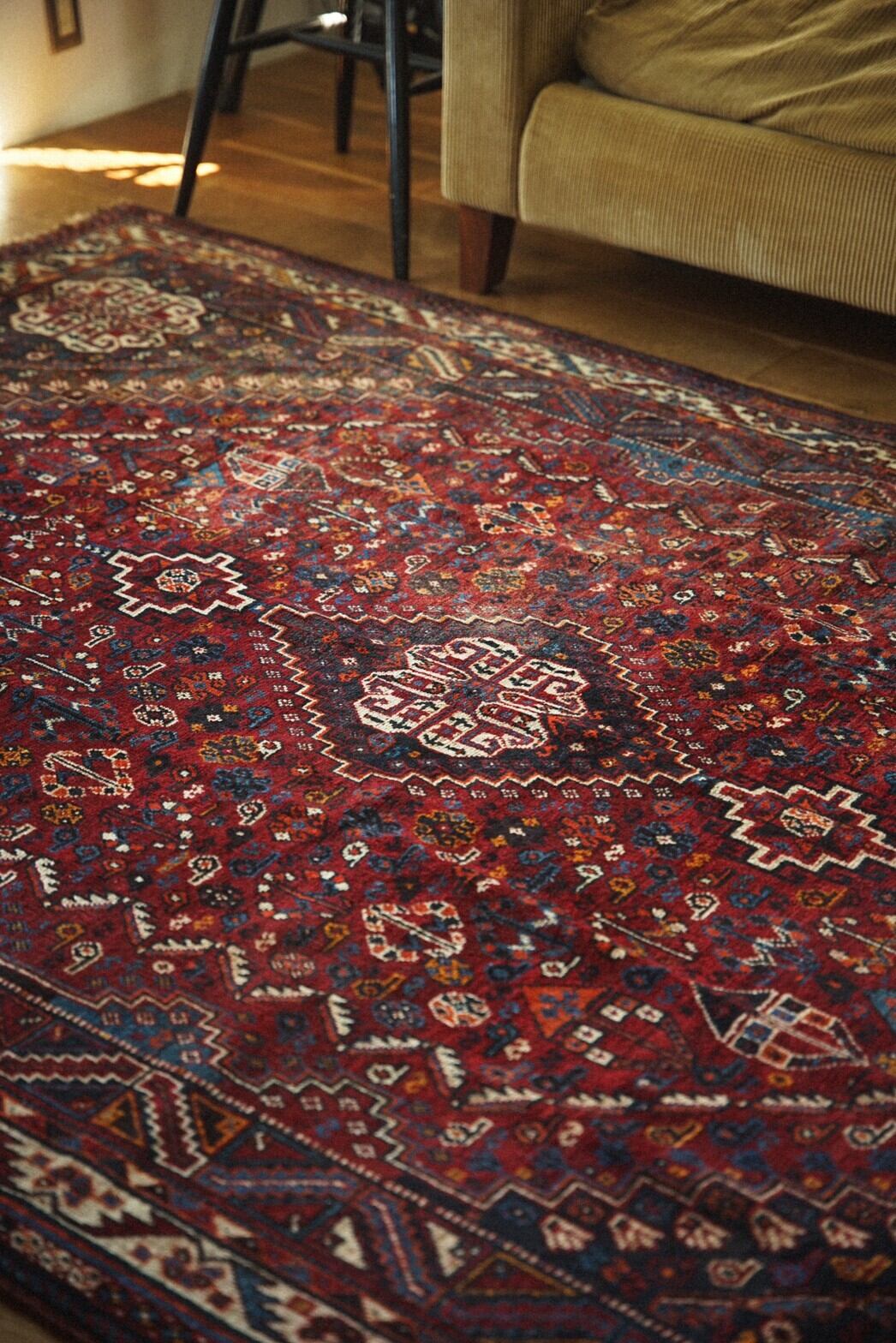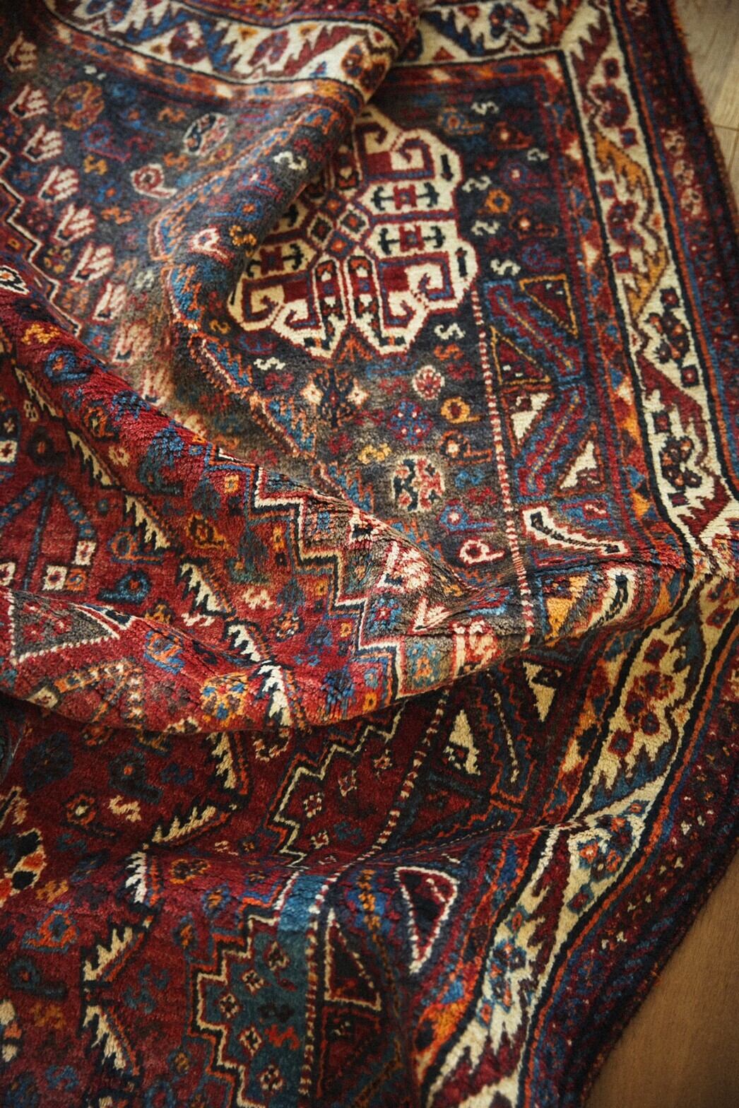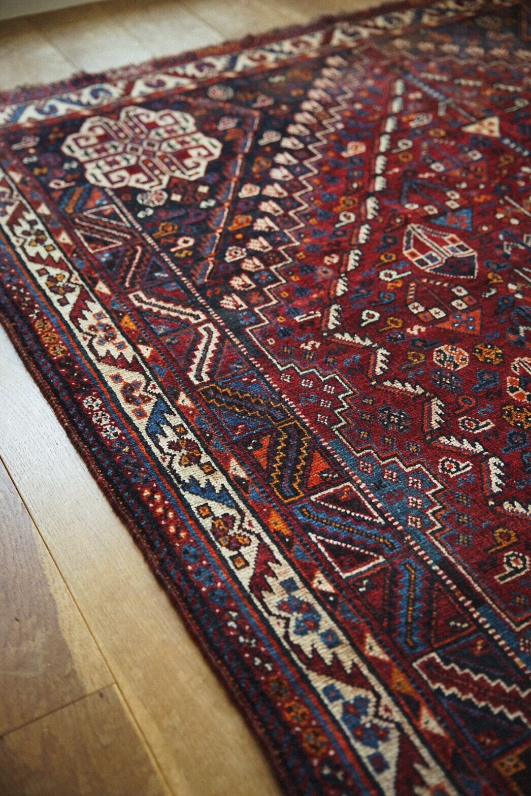 カシュガイ族は単一民族ではなく5つの民族で構成されており、その中のカシュクリ族によって織られたラグです。ボルドー系の深みのあるレッドとネイビーがベースで全体的に落ち着いたトーン。ラグ全体には草花や木、ボテなど眩いばかりに散りばめられたカシュガイ族の伝統的なモチーフが並ぶ華やかな一枚。目立ったダメージもなく、パイルは程良い厚みもあってグッドコンディション。リビングやソファ前、書斎や和室にも相性の良いジャンルレスな魅力を持っているラグです。お部屋の主役になってくれそうなカシュガイラグ。これからも大切に受け継いでご使用いただける方へお譲りしたいです。