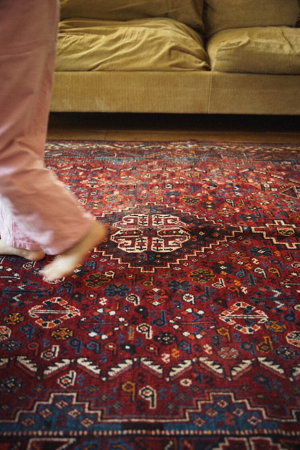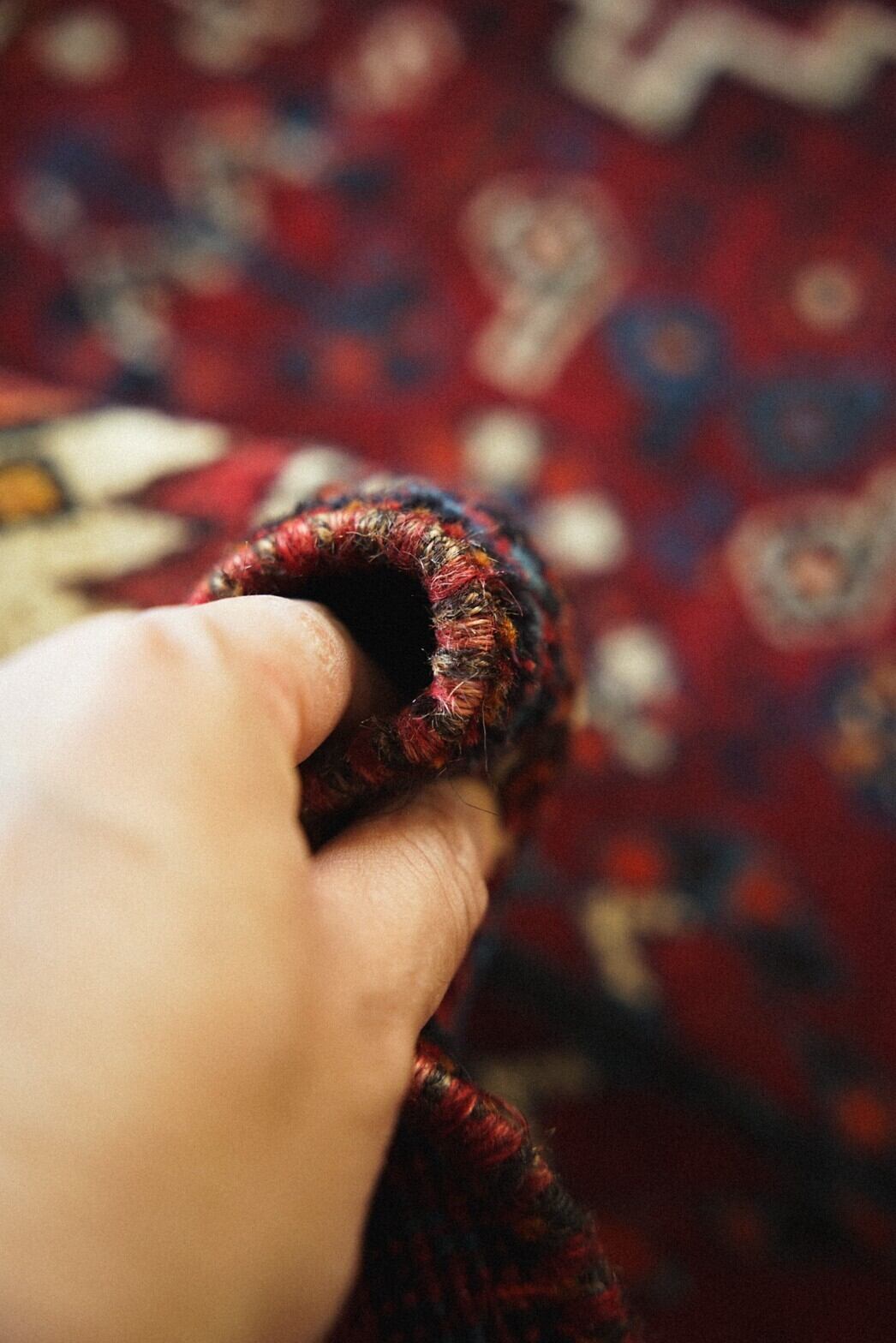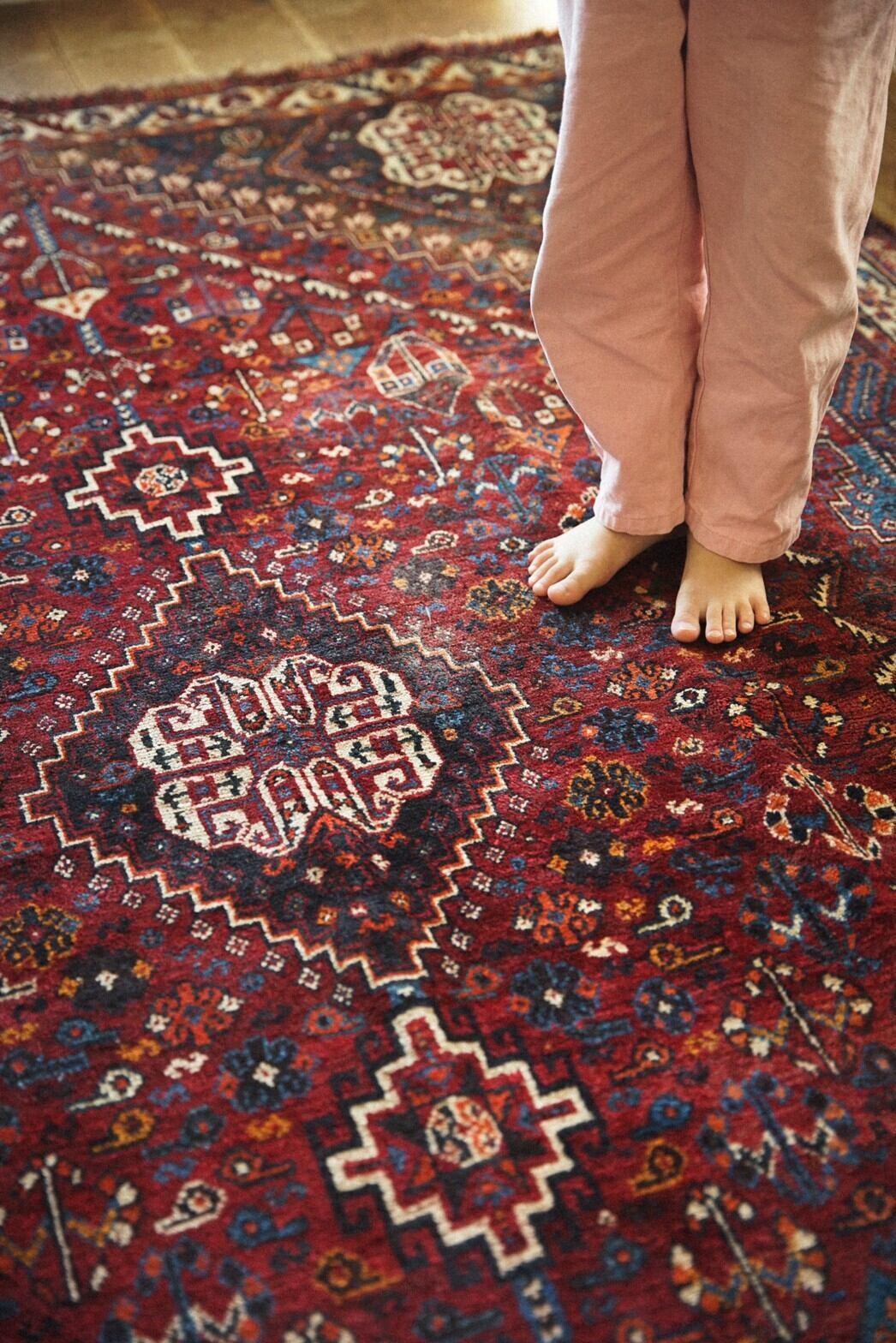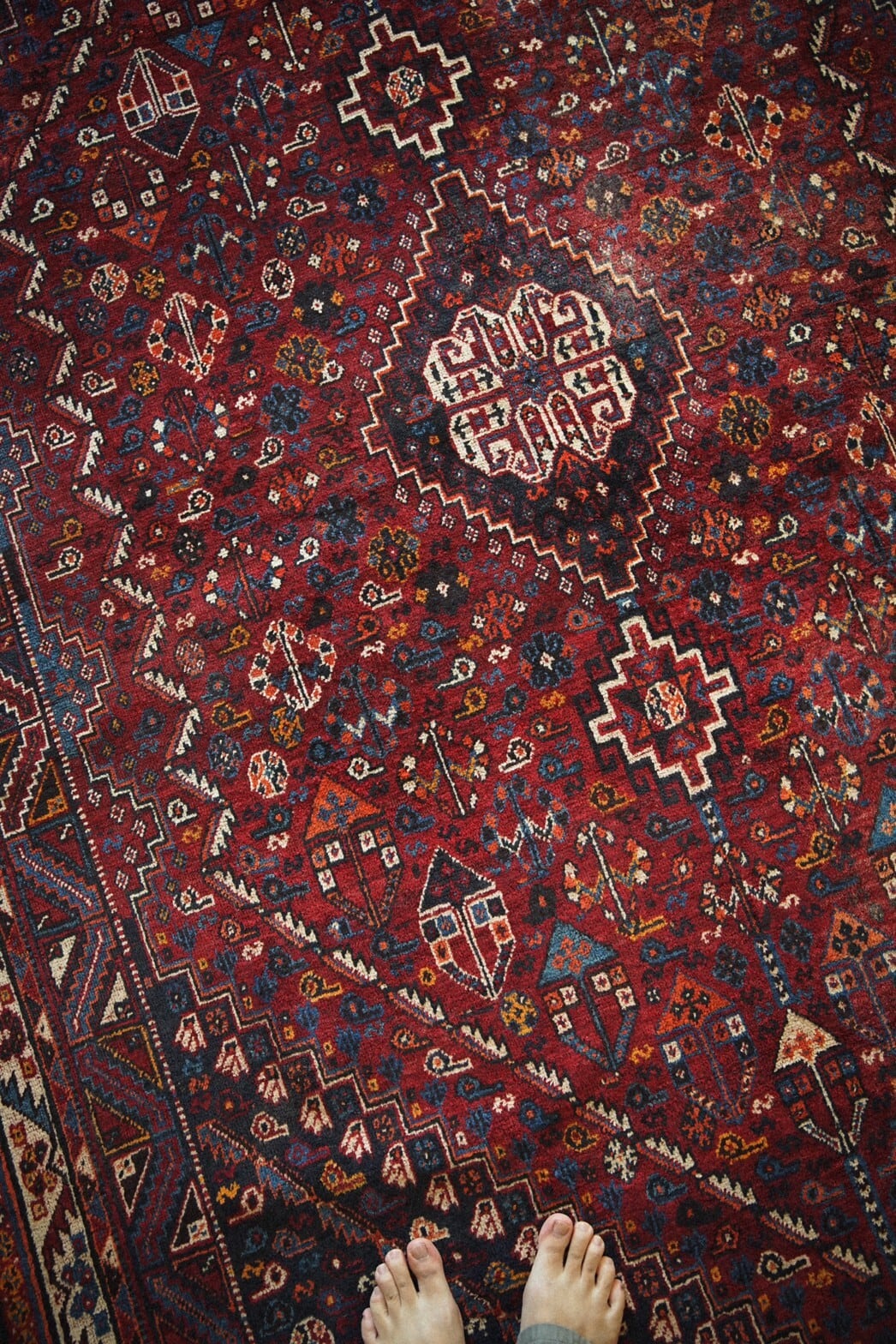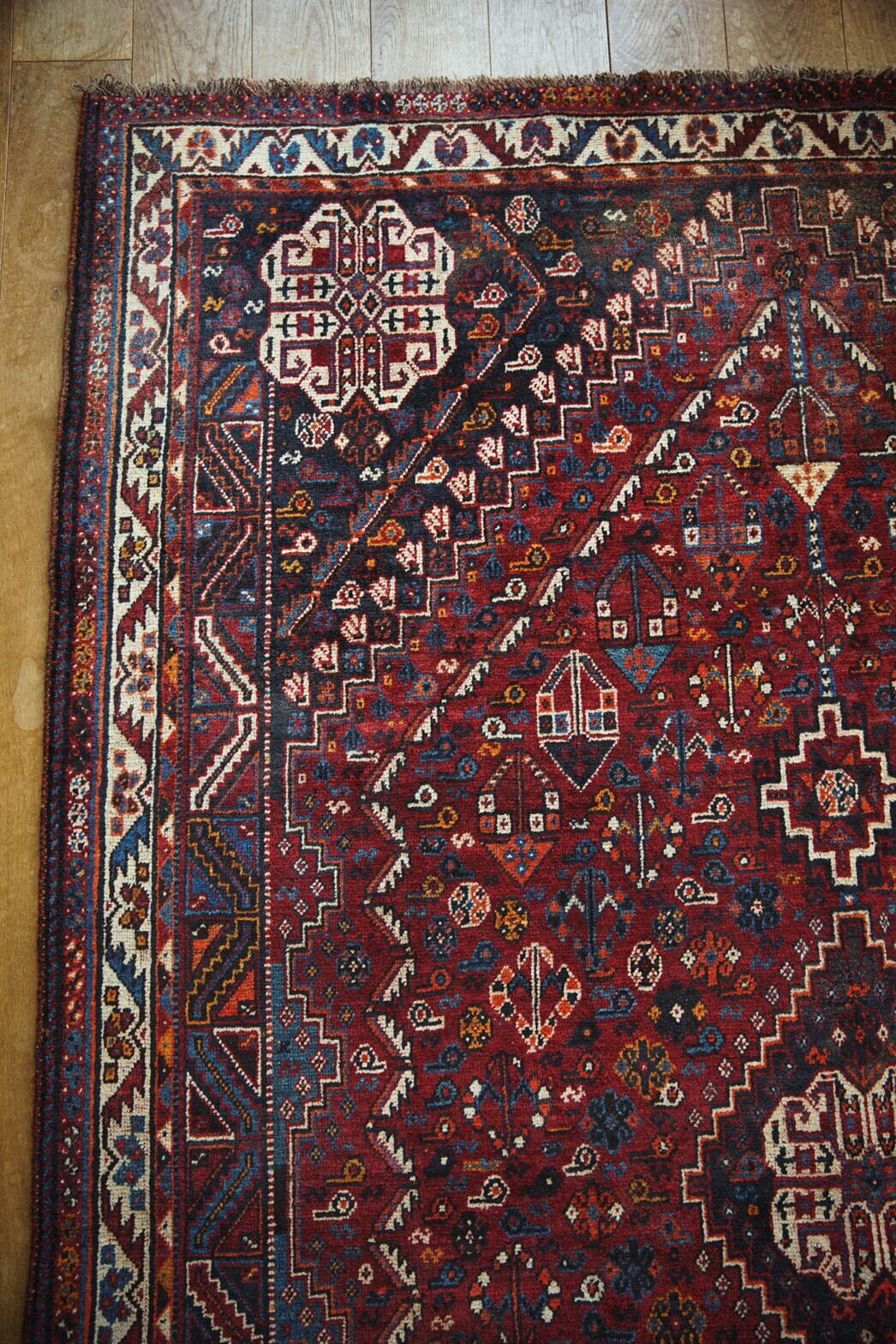 カシュガイ族は単一民族ではなく5つの民族で構成されており、その中のカシュクリ族によって織られたラグです。ボルドー系の深みのあるレッドとネイビーがベースで全体的に落ち着いたトーン。ラグ全体には草花や木、ボテなど眩いばかりに散りばめられたカシュガイ族の伝統的なモチーフが並ぶ華やかな一枚。目立ったダメージもなく、パイルは程良い厚みもあってグッドコンディション。リビングやソファ前、書斎や和室にも相性の良いジャンルレスな魅力を持っているラグです。お部屋の主役になってくれそうなカシュガイラグ。これからも大切に受け継いでご使用いただける方へお譲りしたいです。