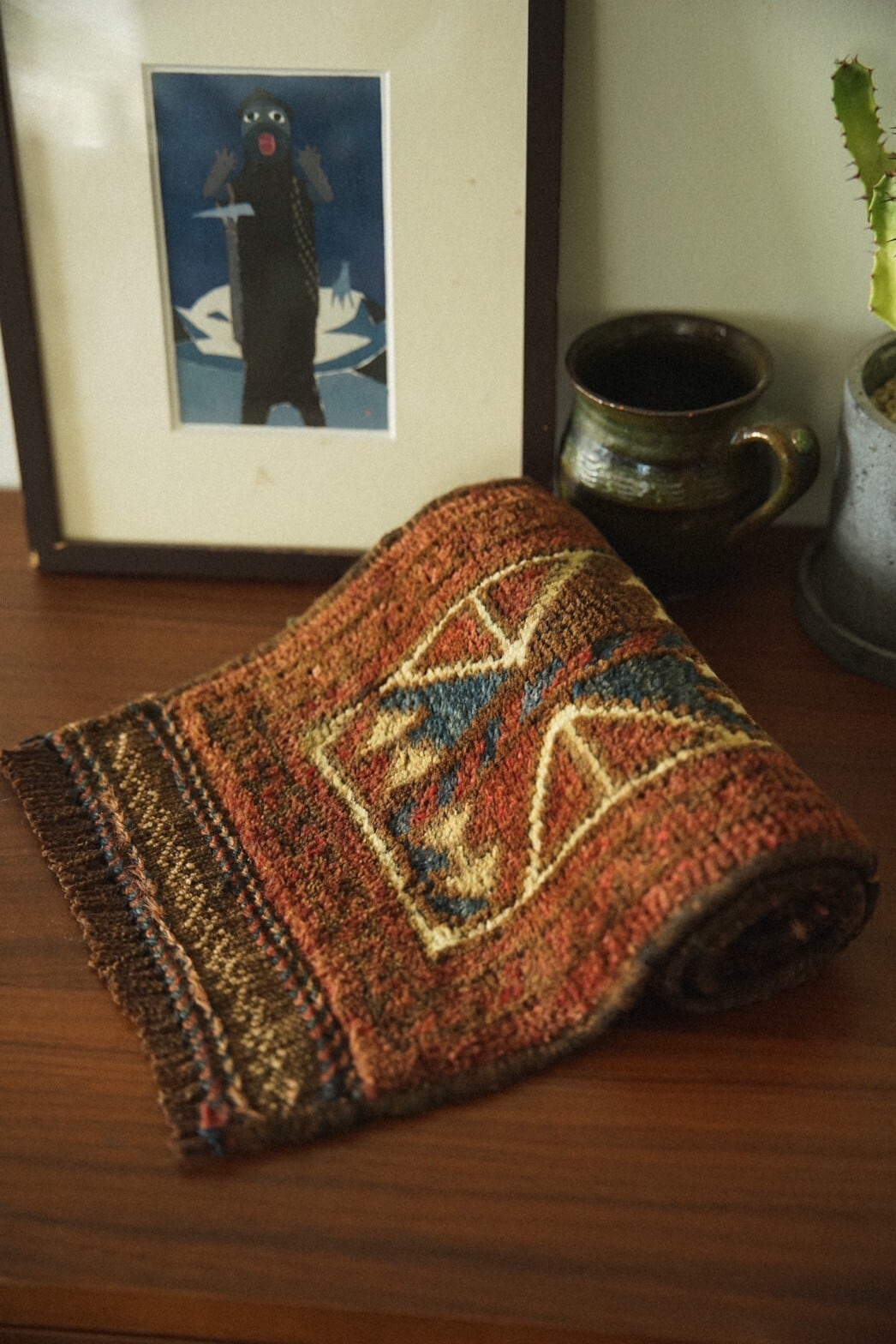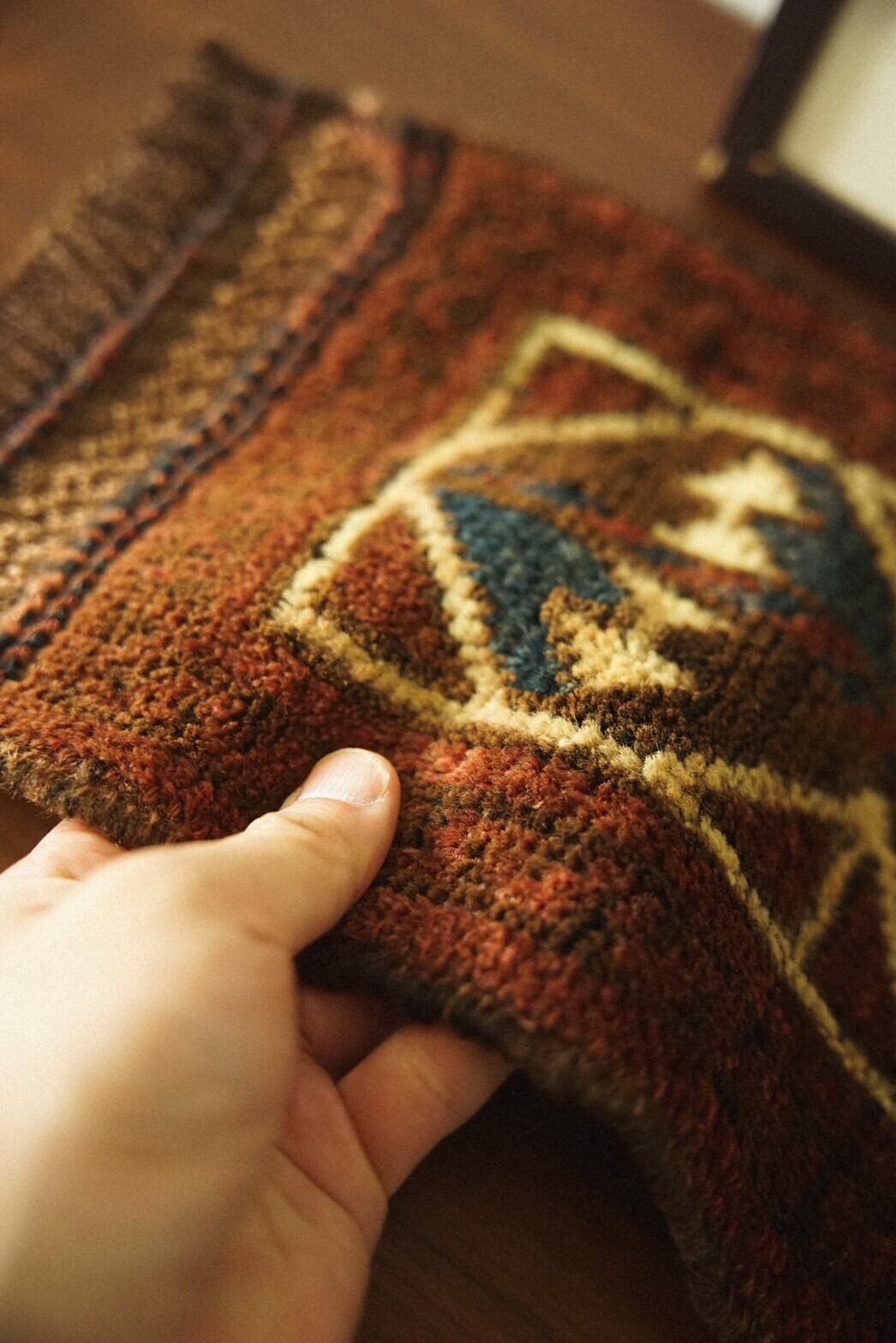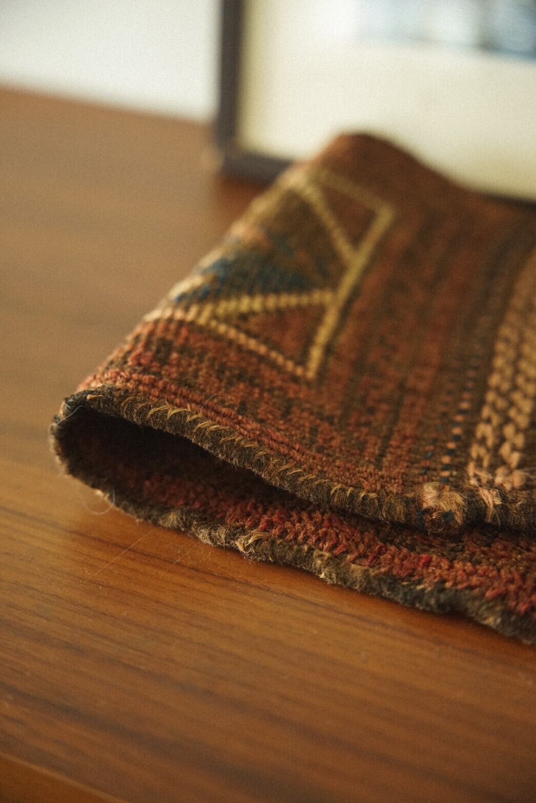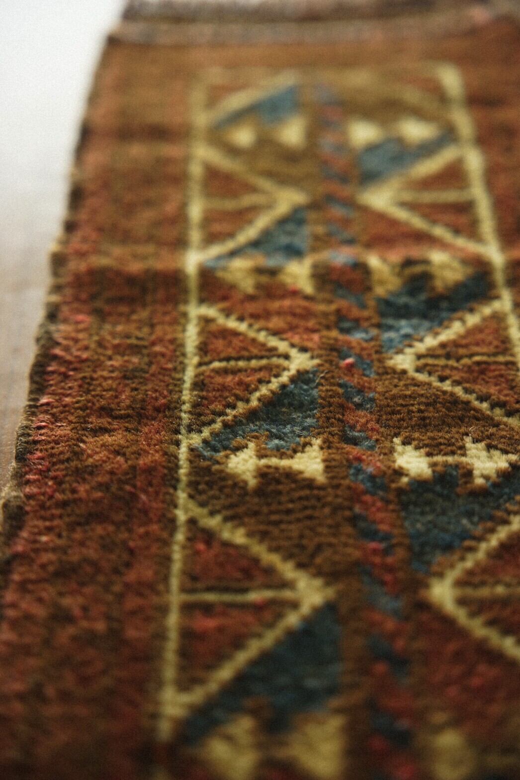 褪色によって温かみのあるブラウンに近い茜色にネイビー、アイボリーの色構成で描かれているのは菱形の連続模様。フリンジ部分はキリムエンドになっています。