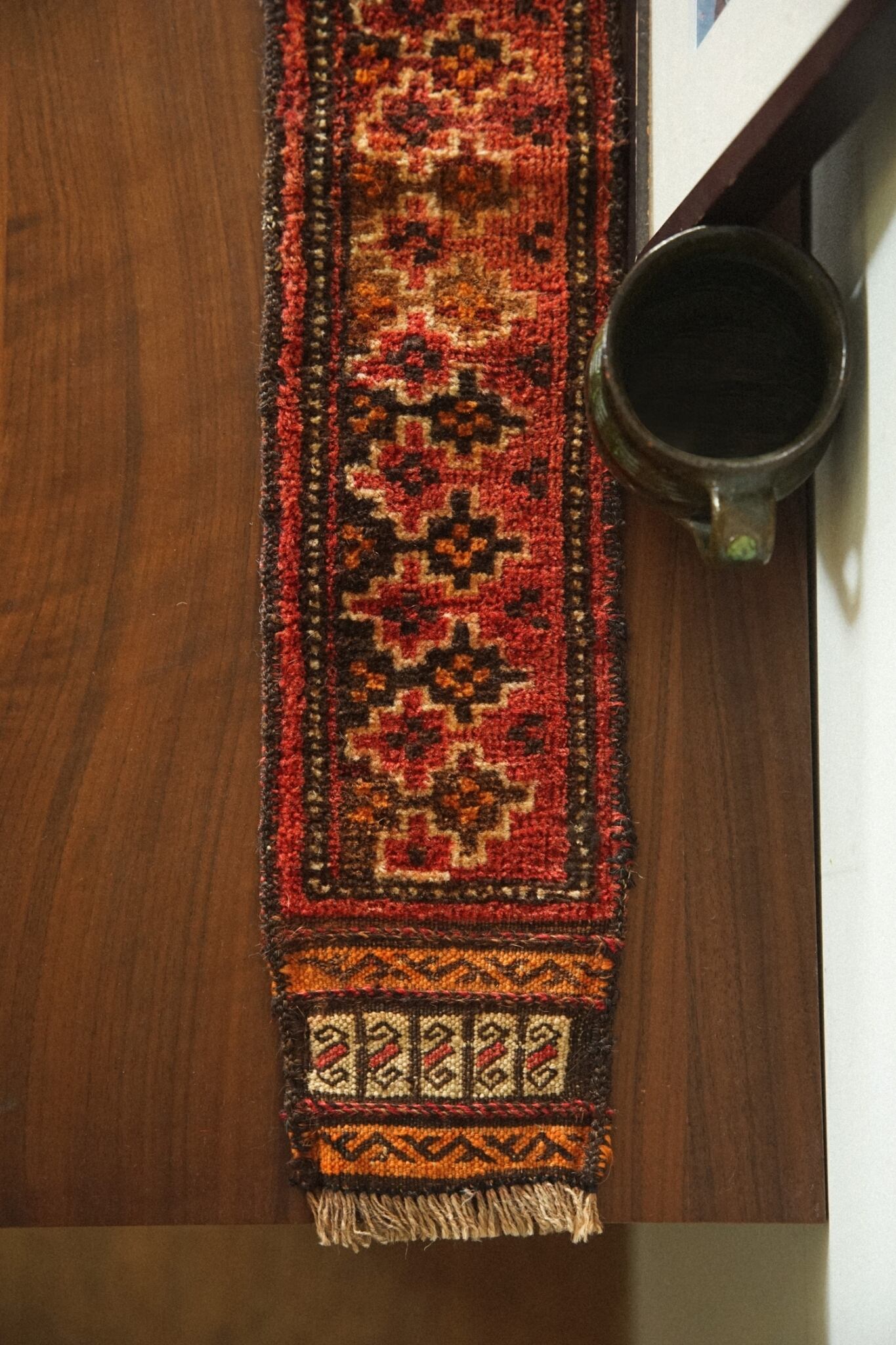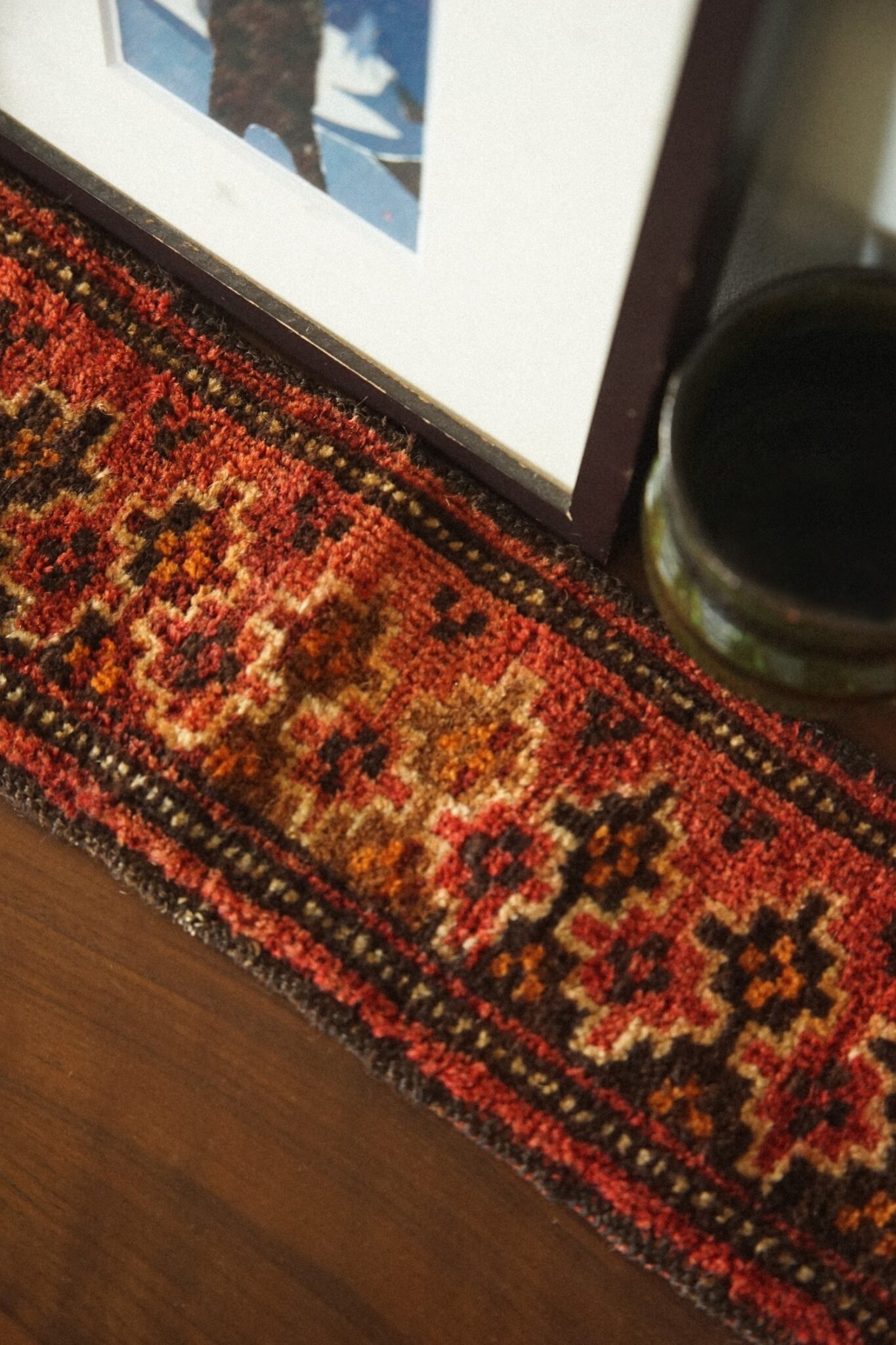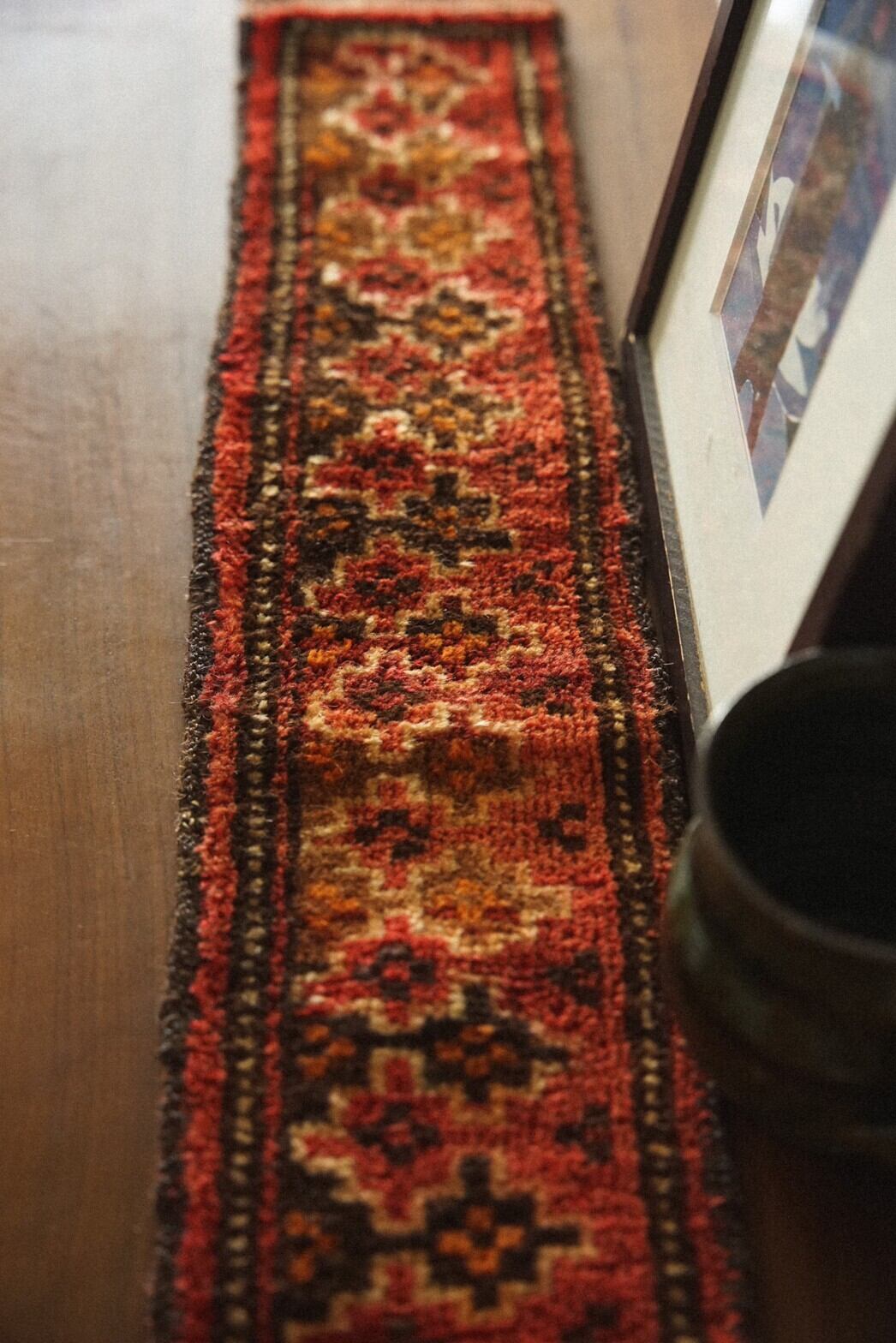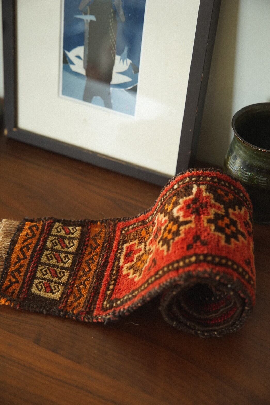 片側のフリンジ部分はキリムエンドになっています。ミニサイズですがテーブルやチェスト、棚の上に置いたり小物を飾ったり。