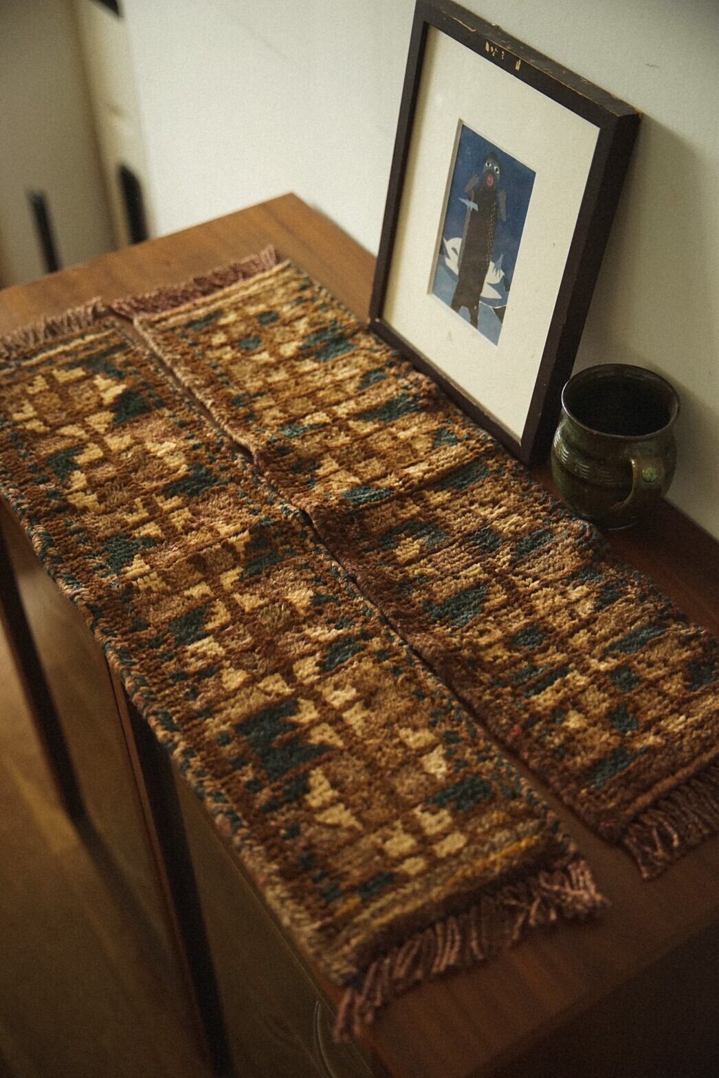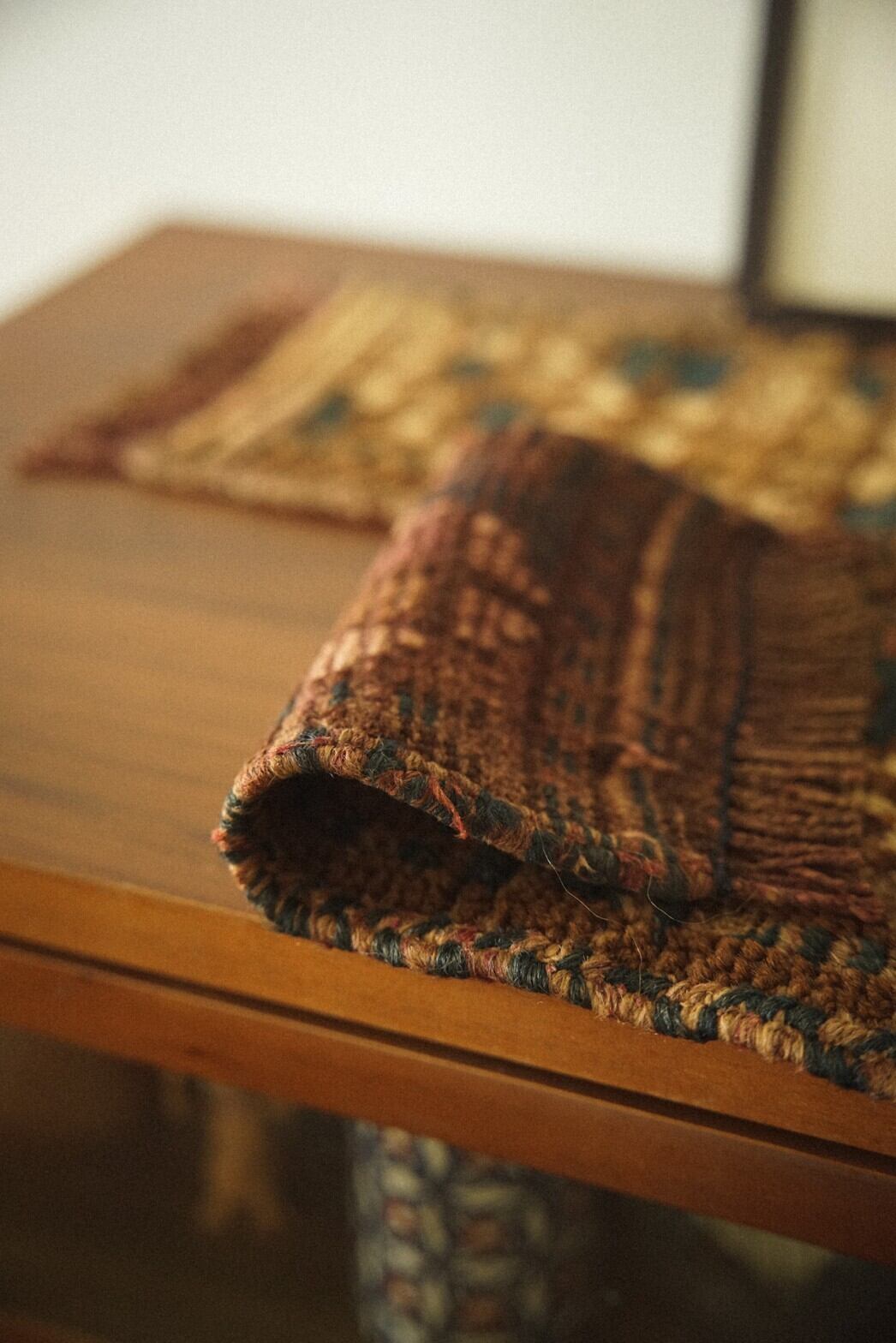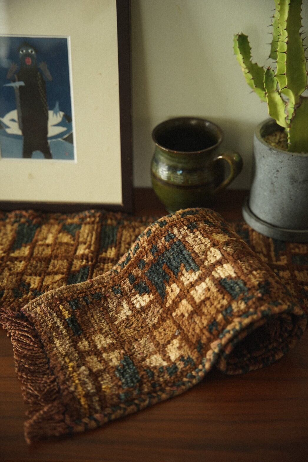 ブラウン、キャメル、ネイビーのシックな色味でまとまっており、織りもざっくりとゆるめの素朴な雰囲気が魅力の一枚。