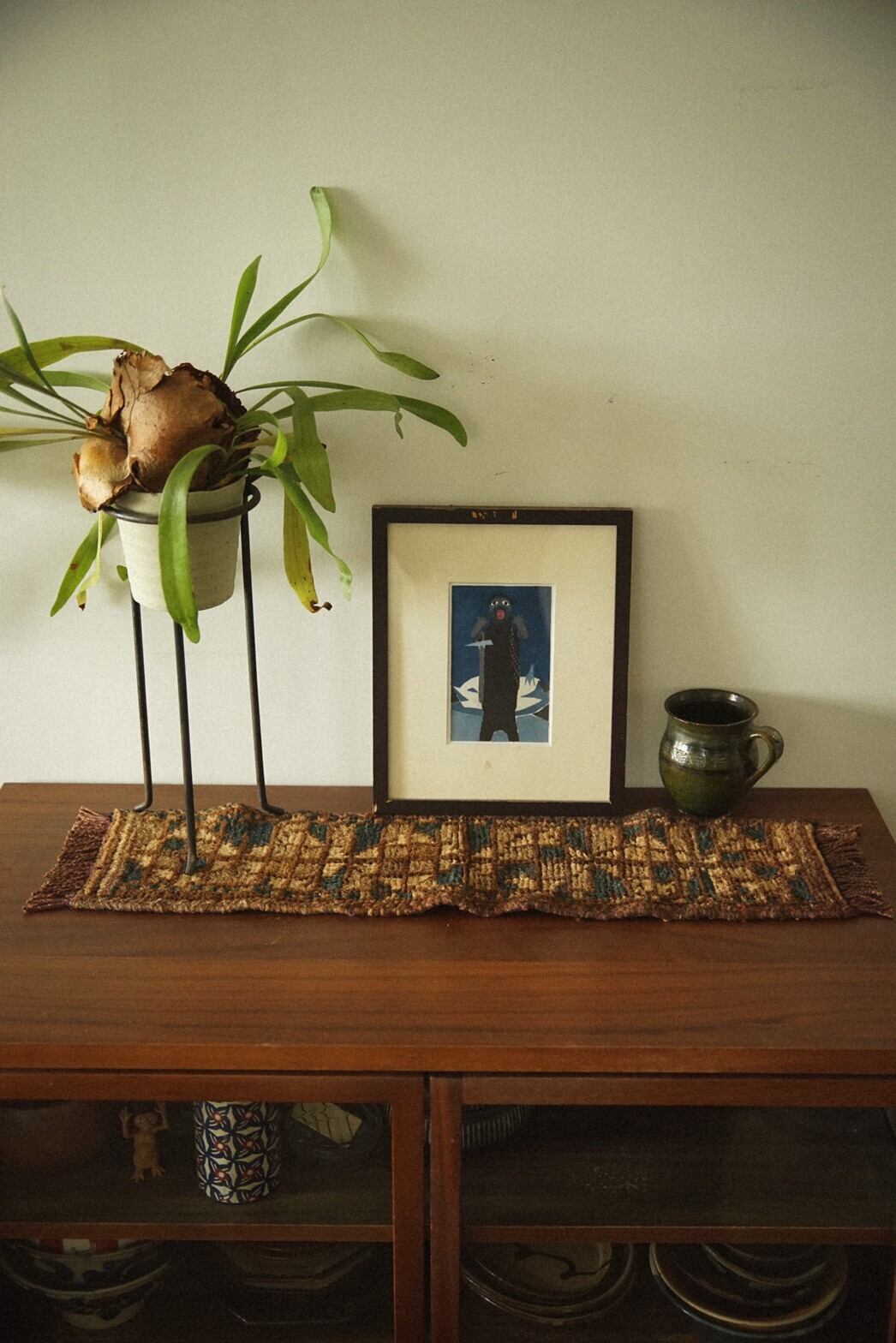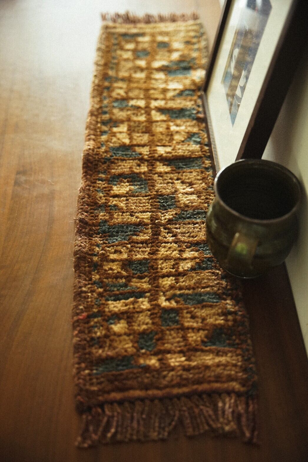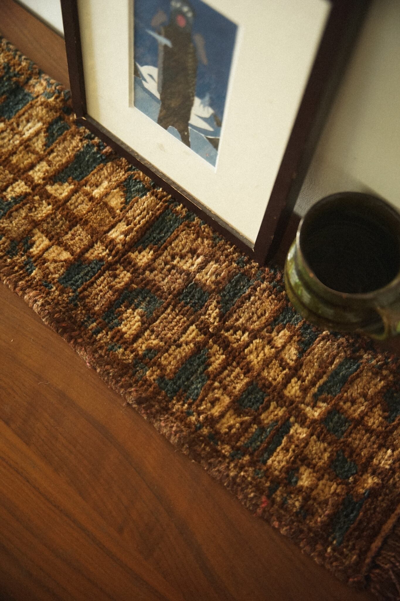 ブラウン、キャメル、ネイビーのシックな色味でまとまっており、織りもざっくりとゆるめの素朴な雰囲気が魅力の一枚。