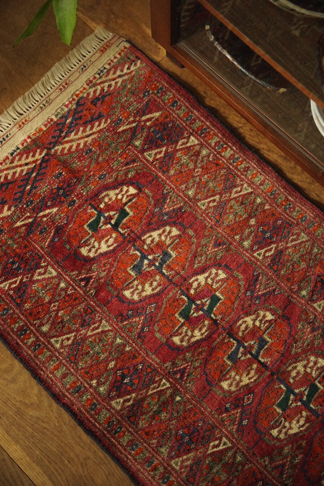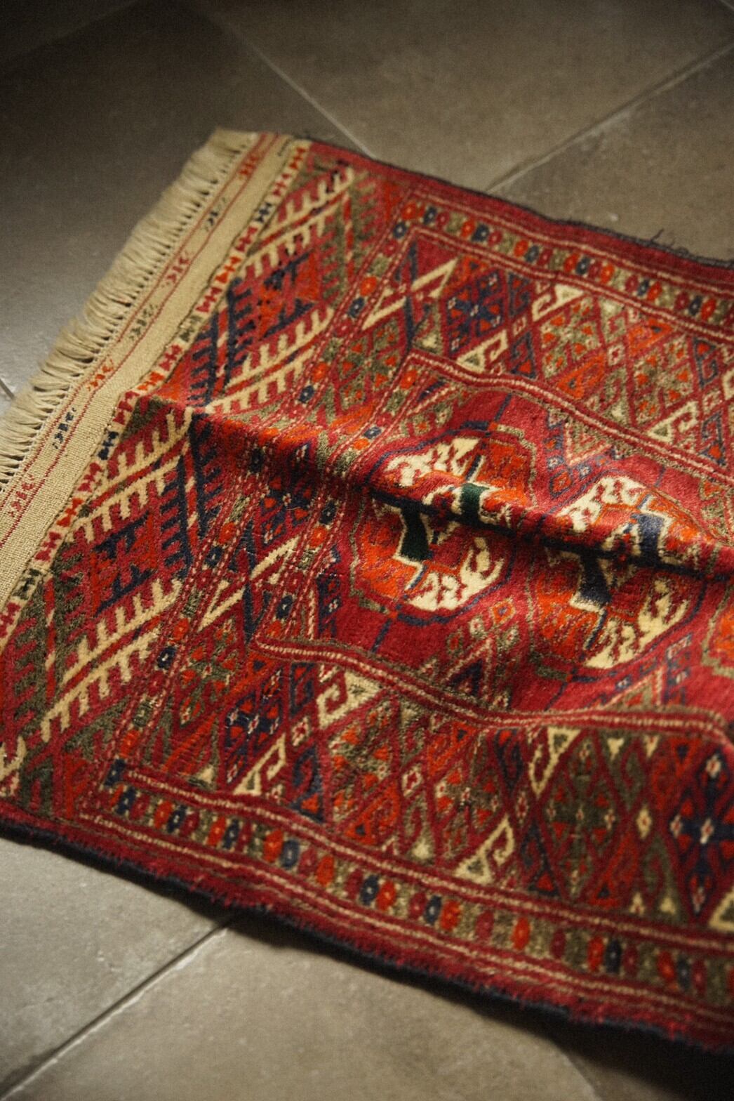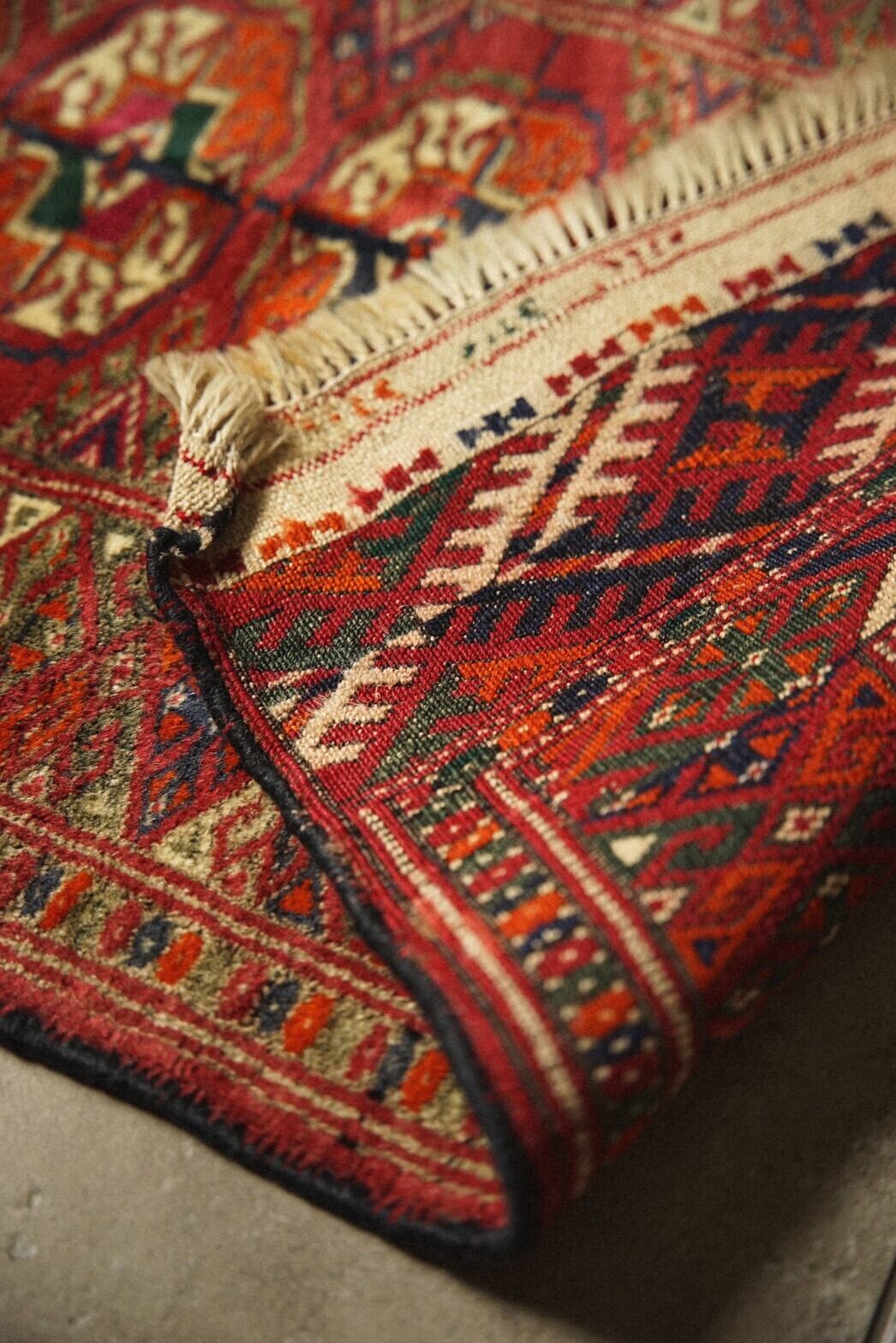 カーキ色がアクセントになっており、全体的に質感、色味共に柔らかな雰囲気が魅力の一枚。バーリシトと呼ばれる家財や食材を入れる袋をラグに仕立ててもらったので、目立ったダメージもなくコンディション良好。