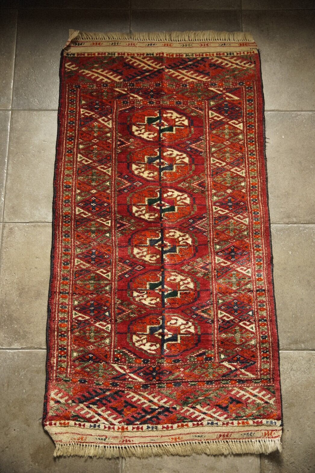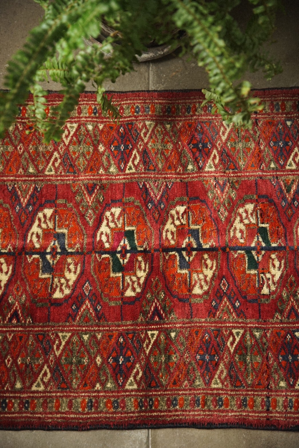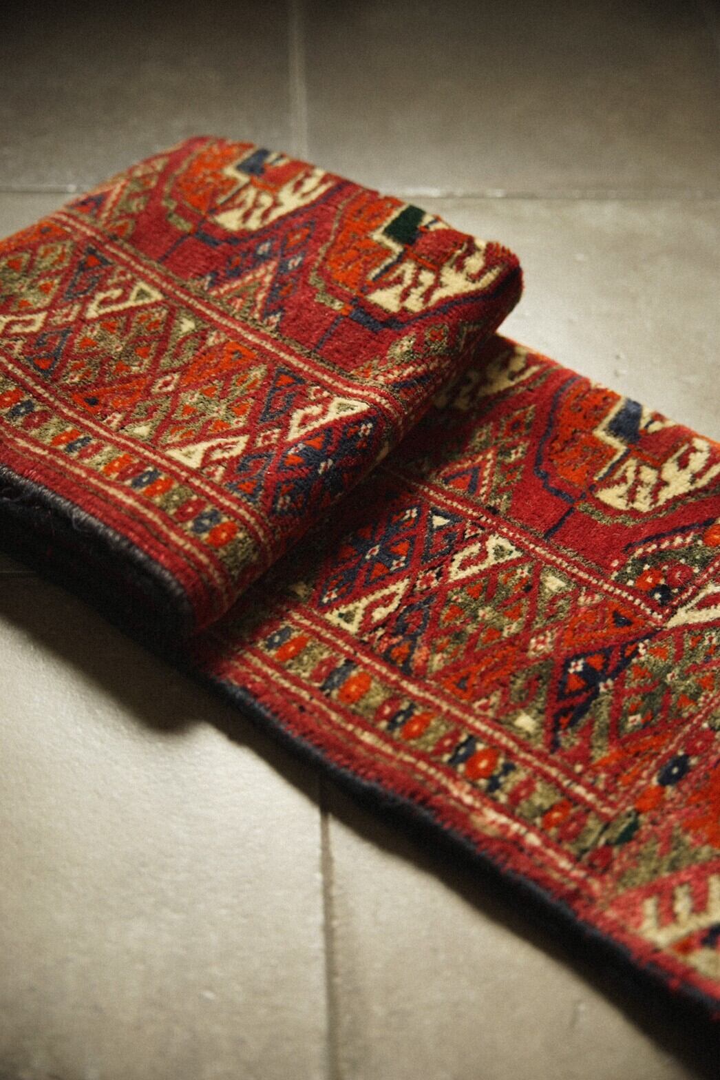 カーキ色がアクセントになっており、全体的に質感、色味共に柔らかな雰囲気が魅力の一枚。バーリシトと呼ばれる家財や食材を入れる袋をラグに仕立ててもらったので、目立ったダメージもなくコンディション良好。
