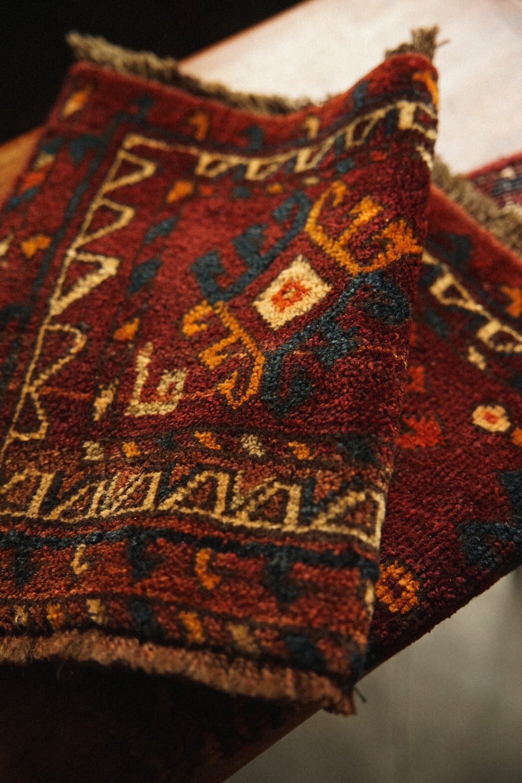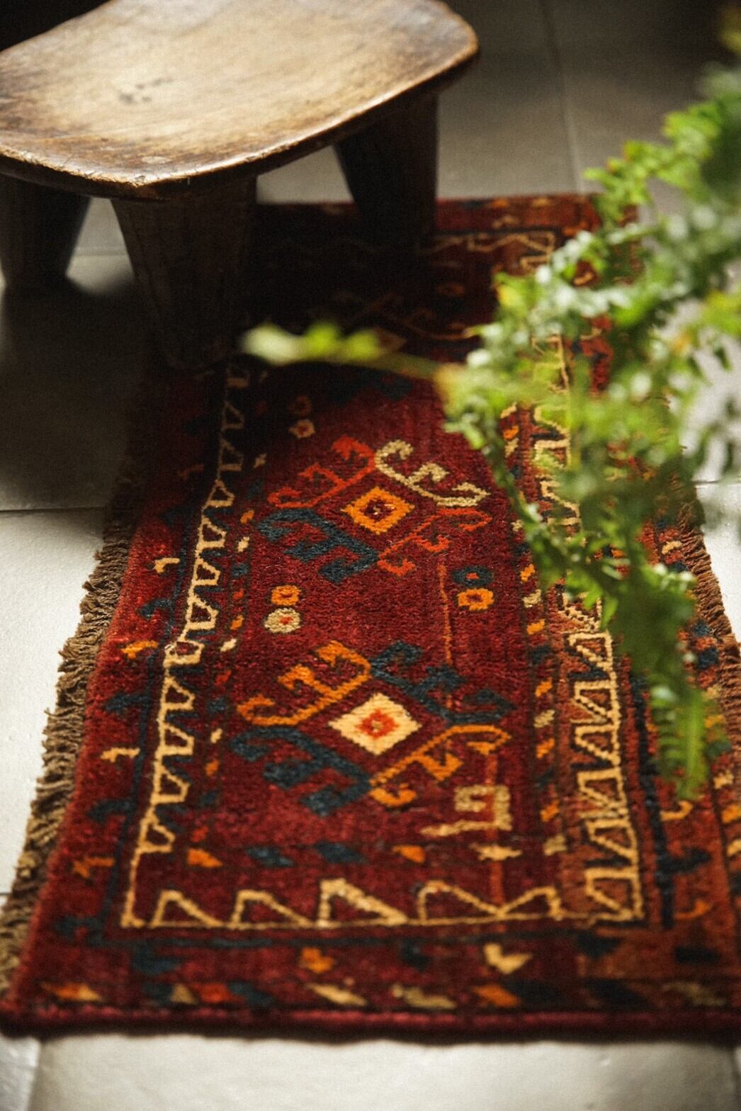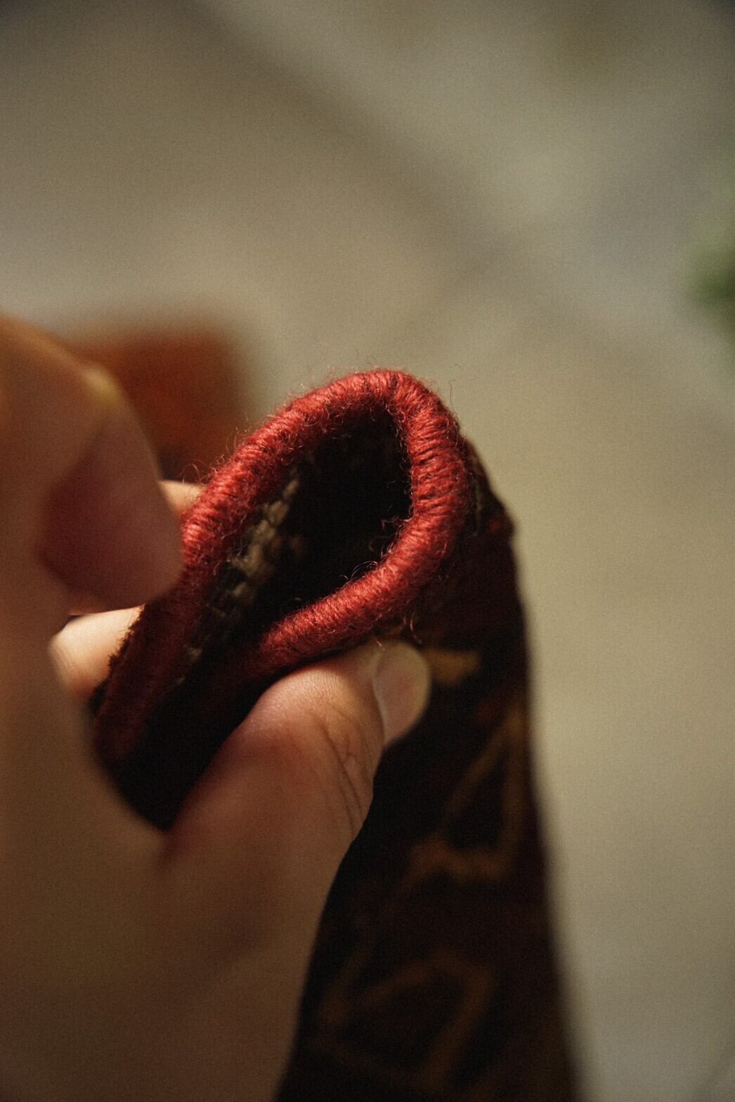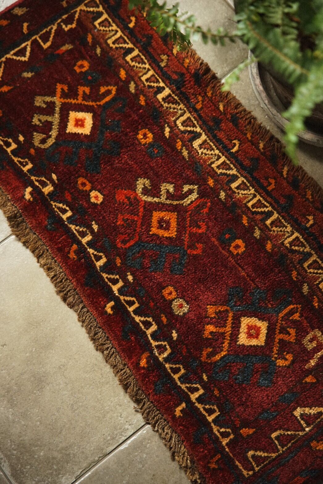 深みのあるボルドー色がとても美しい一枚。3つ並んだメダリオンでも使われている差し色のブルーがかっこいいです。歪みがありますが、そこも含めて手織り絨毯の味わいだとご理解いただける方へ。壁掛けにして楽しんだり、チェストの上や窓辺に敷いての使用もおすすめです♪