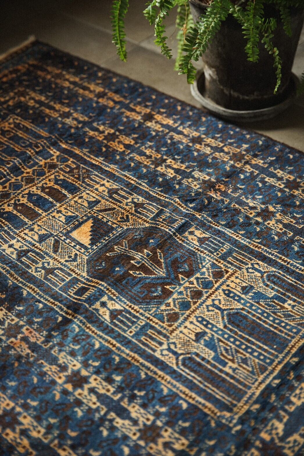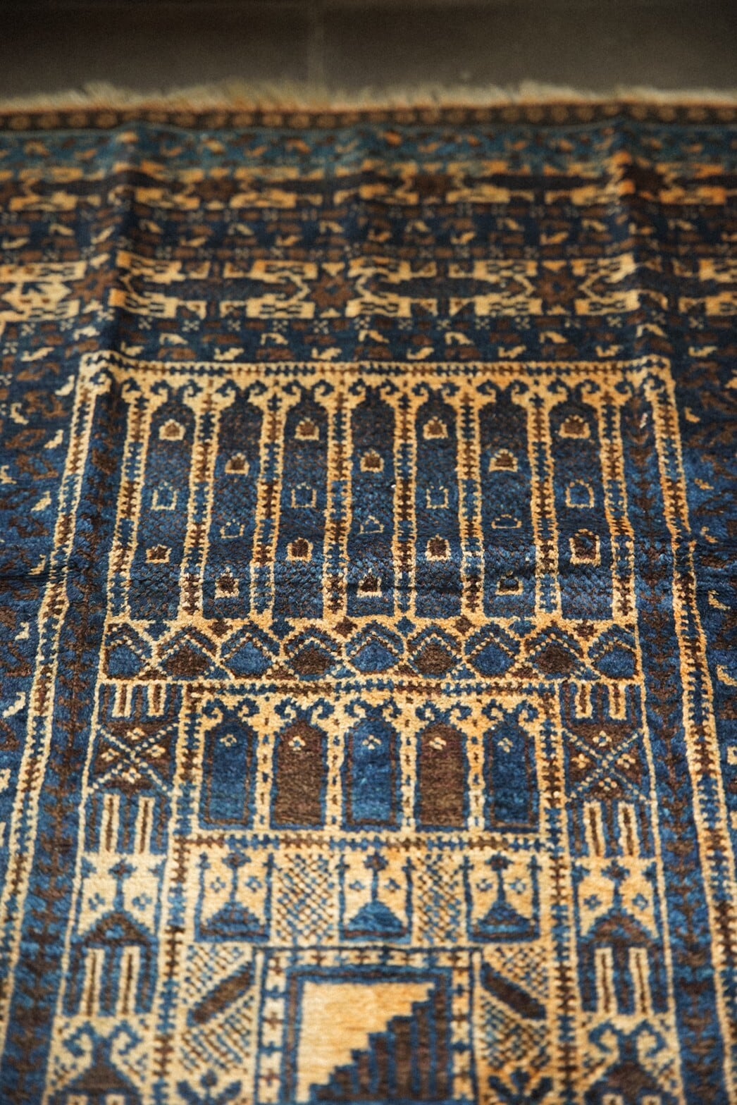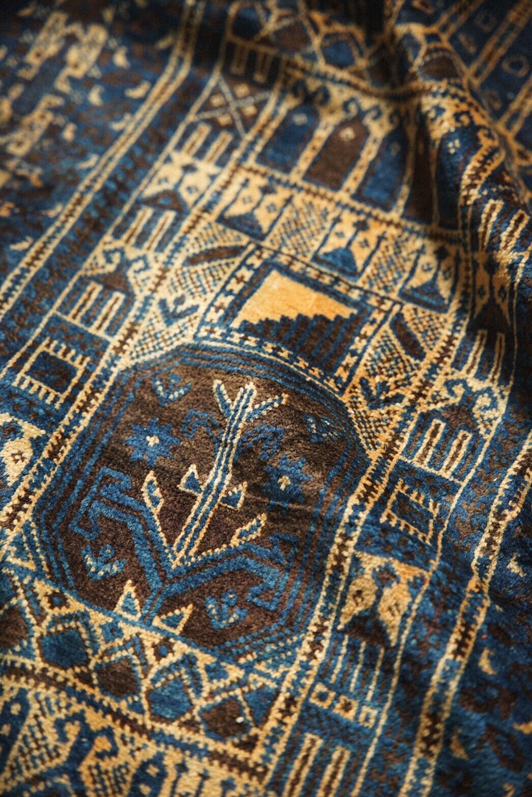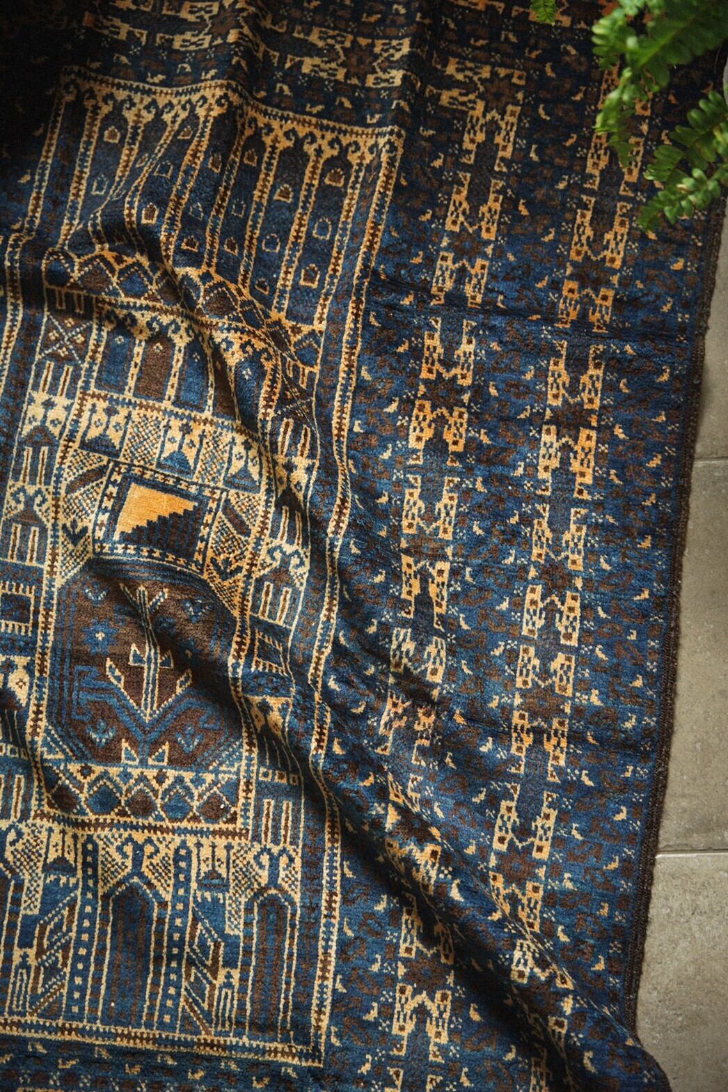 1970年代に織られたアフガニスタン産のバルーチラグ。インディゴ、ダークブラウン、キャメルのシンプルな色構成に、八芒星や雄羊の角を持つミフラーブが描かれた細やかなデザインがとてもかっこいい一枚。フリンジ部分はキリムエンド。短めのパイルですが、程良い厚みもありしっかりと丈夫な作り。目立ったダメージもなくグッドコンディション。サイズ感もどこにでもハマりそうな使いやすい大きさのため、お気に入りの場所に敷いてみてください。ブルー系のラグをお探しの方には是非おすすめの一枚です。