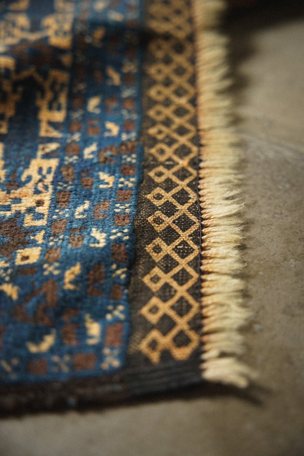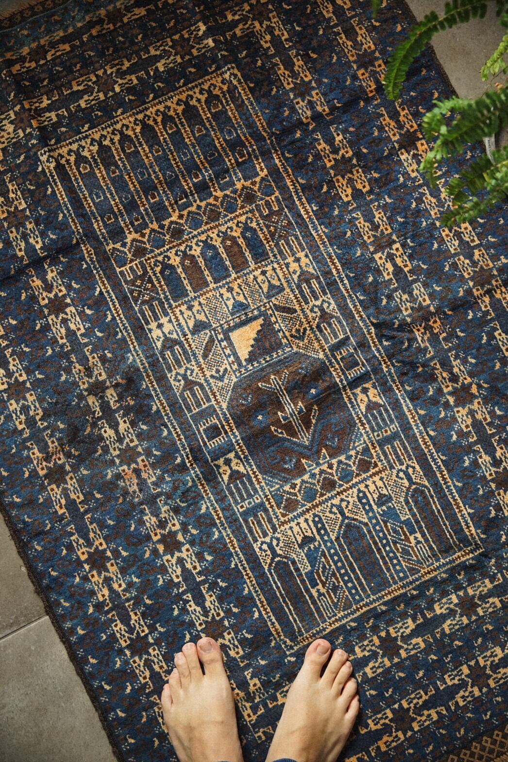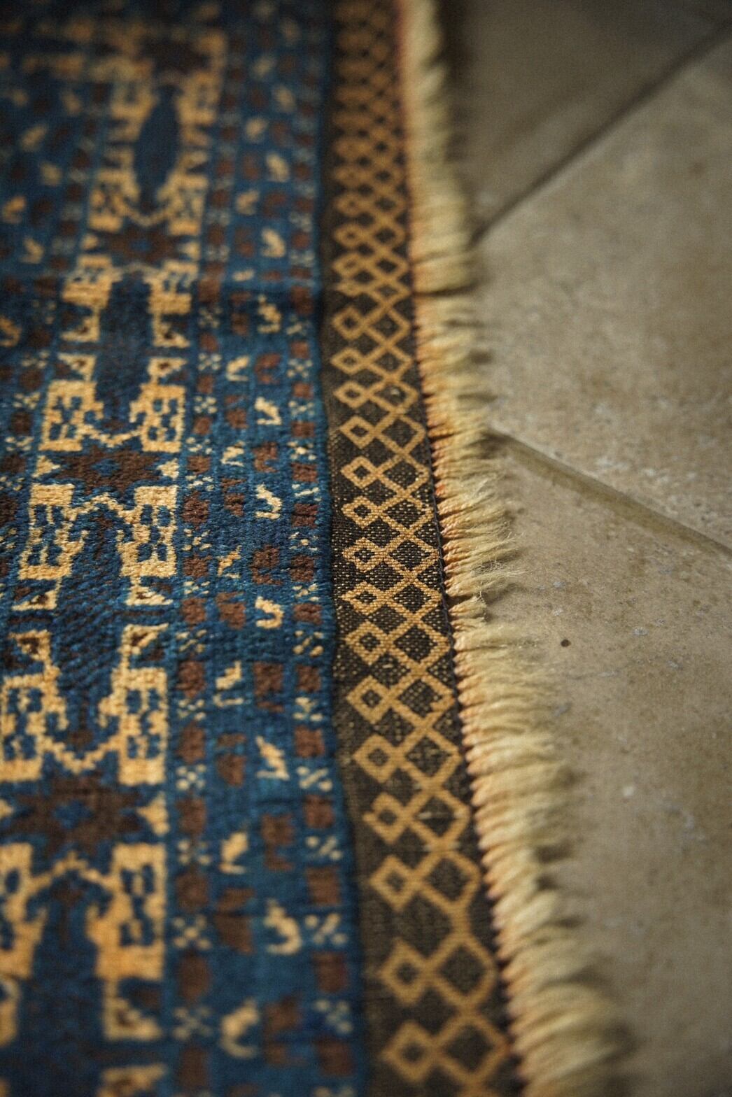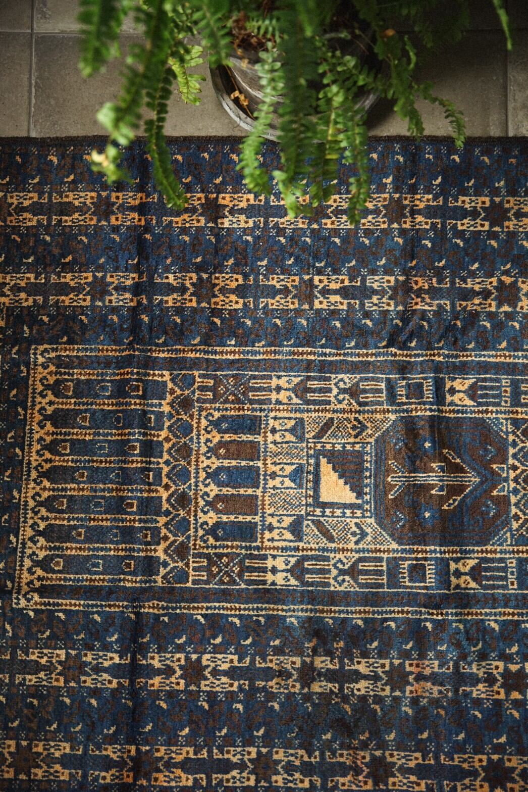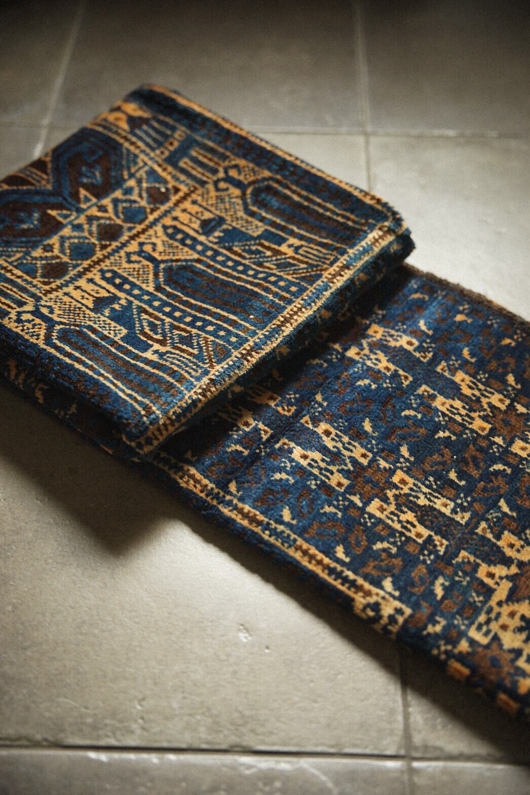 1970年代に織られたアフガニスタン産のバルーチラグ。インディゴ、ダークブラウン、キャメルのシンプルな色構成に、八芒星や雄羊の角を持つミフラーブが描かれた細やかなデザインがとてもかっこいい一枚。フリンジ部分はキリムエンド。短めのパイルですが、程良い厚みもありしっかりと丈夫な作り。目立ったダメージもなくグッドコンディション。サイズ感もどこにでもハマりそうな使いやすい大きさのため、お気に入りの場所に敷いてみてください。ブルー系のラグをお探しの方には是非おすすめの一枚です。