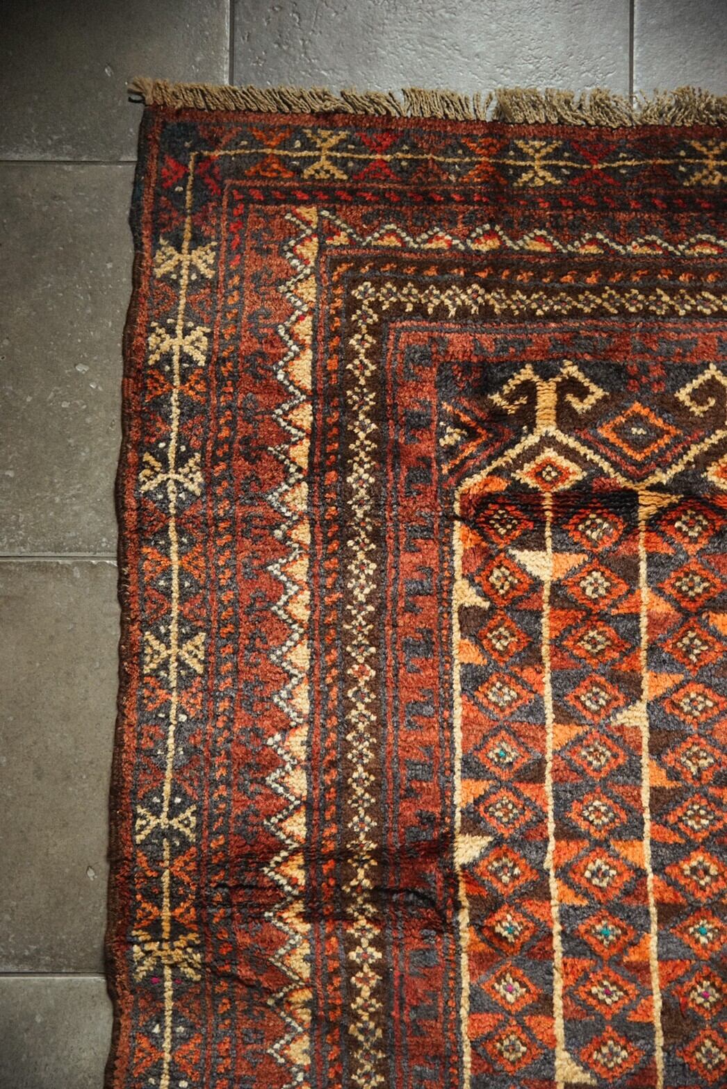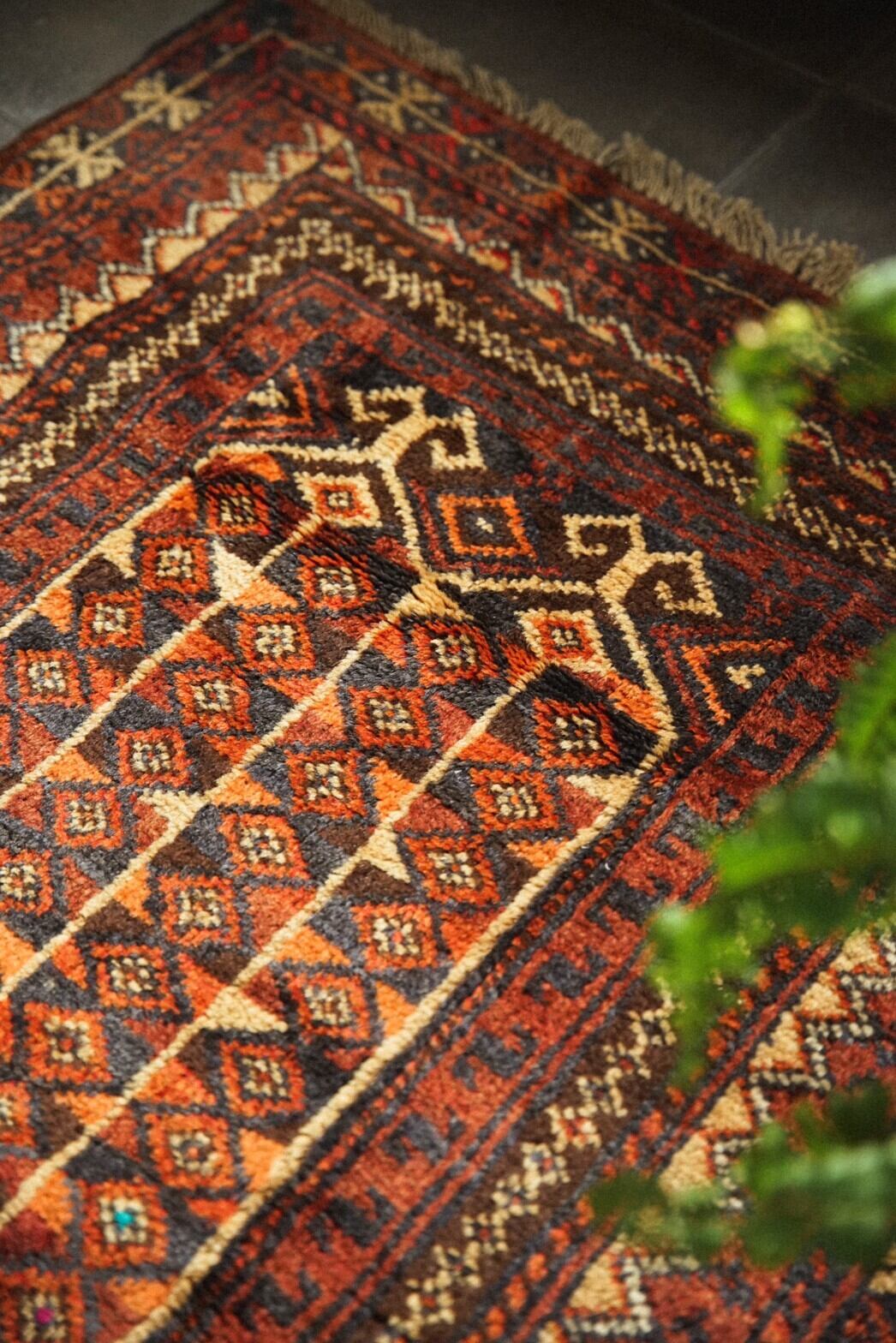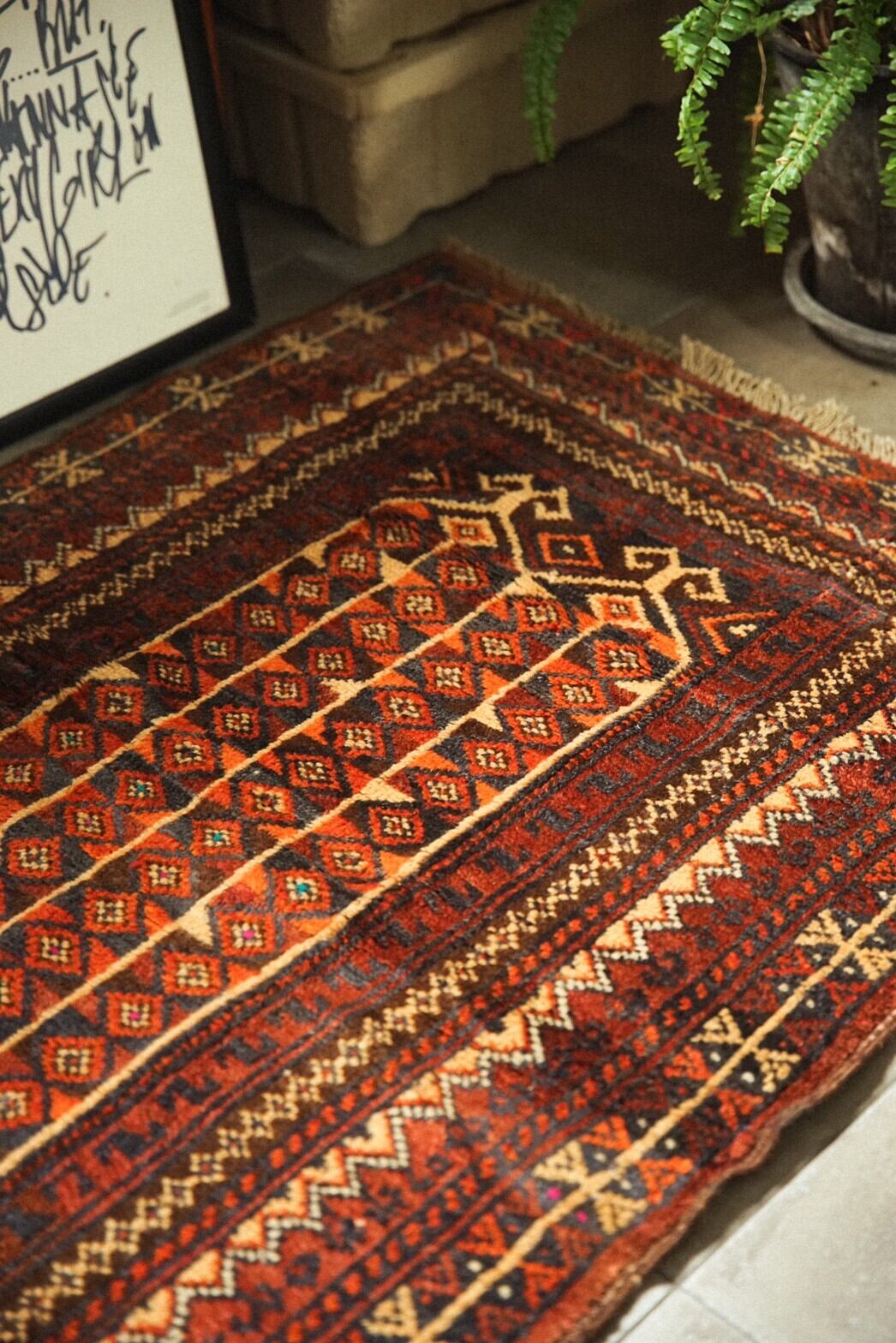 1960年代に織られたタイマニラグ。赤やオレンジ、アイボリーなどの暖色系ベースの色味が優しい雰囲気が魅力的な一枚。真ん中に雄羊の角を持つミフラーブが2つ並んだデザインで、ボーダー部分は幾層にも描かれています。主に菱形やジグザクの連続紋様で、リズミカルな躍動感のある力強さを感じます。パイルは山岳地帯で暮らすタイマニ族ならではの柔らかく良質なウールで、肌触りもとても気持ち良いです。程良い厚みもあり、キッチンや玄関、リビングのソファ前などにもピッタリのサイズ感。重ね敷きにも合わせやすい万能な色味とデザインです。