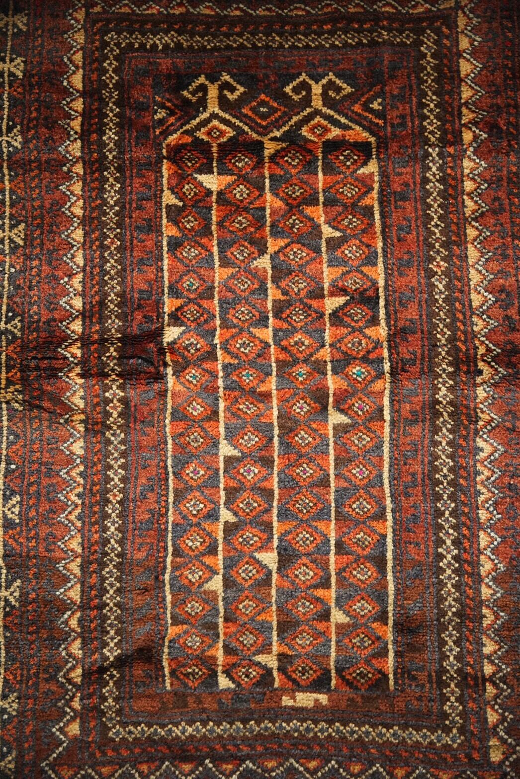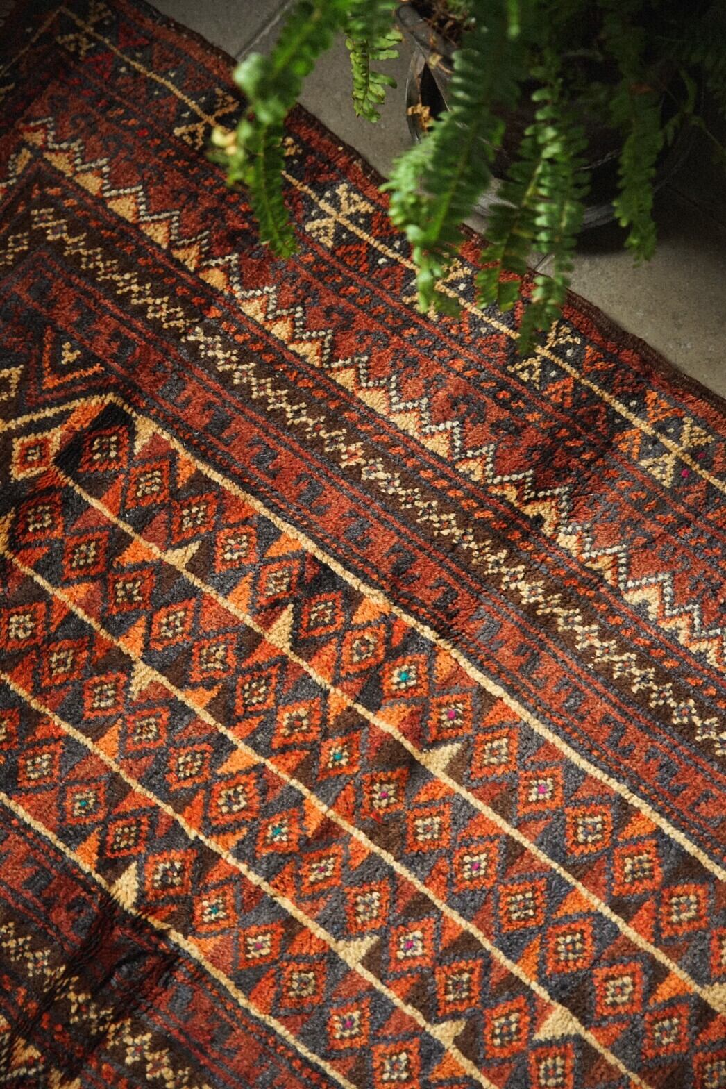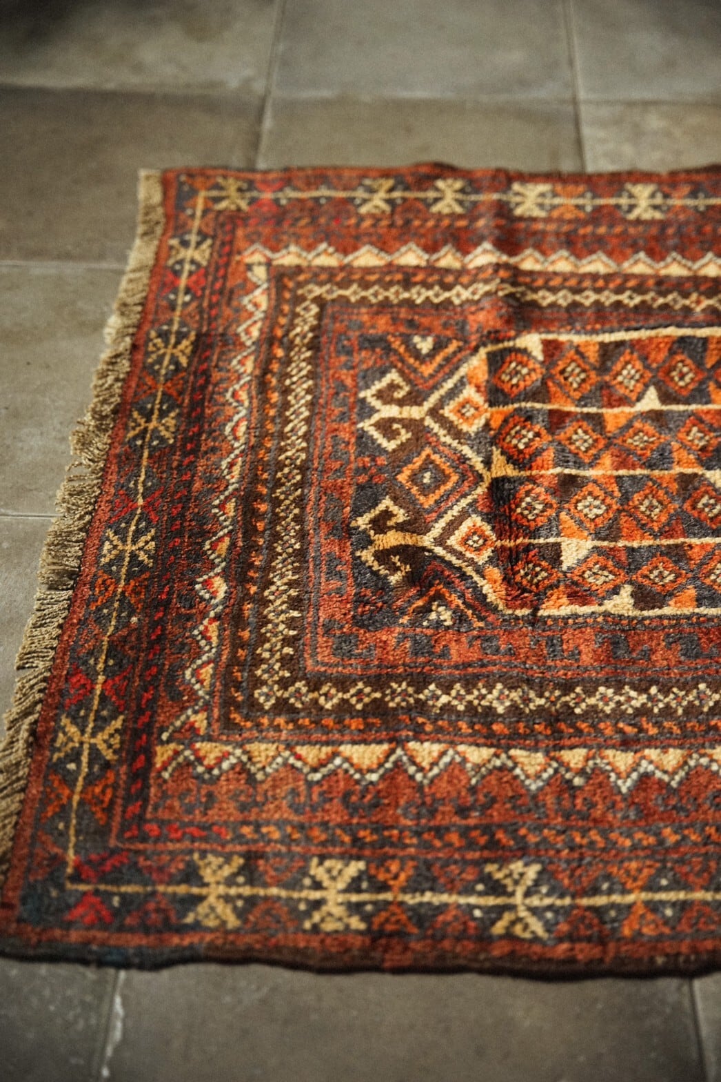 1960年代に織られたタイマニラグ。赤やオレンジ、アイボリーなどの暖色系ベースの色味が優しい雰囲気が魅力的な一枚。真ん中に雄羊の角を持つミフラーブが2つ並んだデザインで、ボーダー部分は幾層にも描かれています。主に菱形やジグザクの連続紋様で、リズミカルな躍動感のある力強さを感じます。パイルは山岳地帯で暮らすタイマニ族ならではの柔らかく良質なウールで、肌触りもとても気持ち良いです。程良い厚みもあり、キッチンや玄関、リビングのソファ前などにもピッタリのサイズ感。重ね敷きにも合わせやすい万能な色味とデザインです。