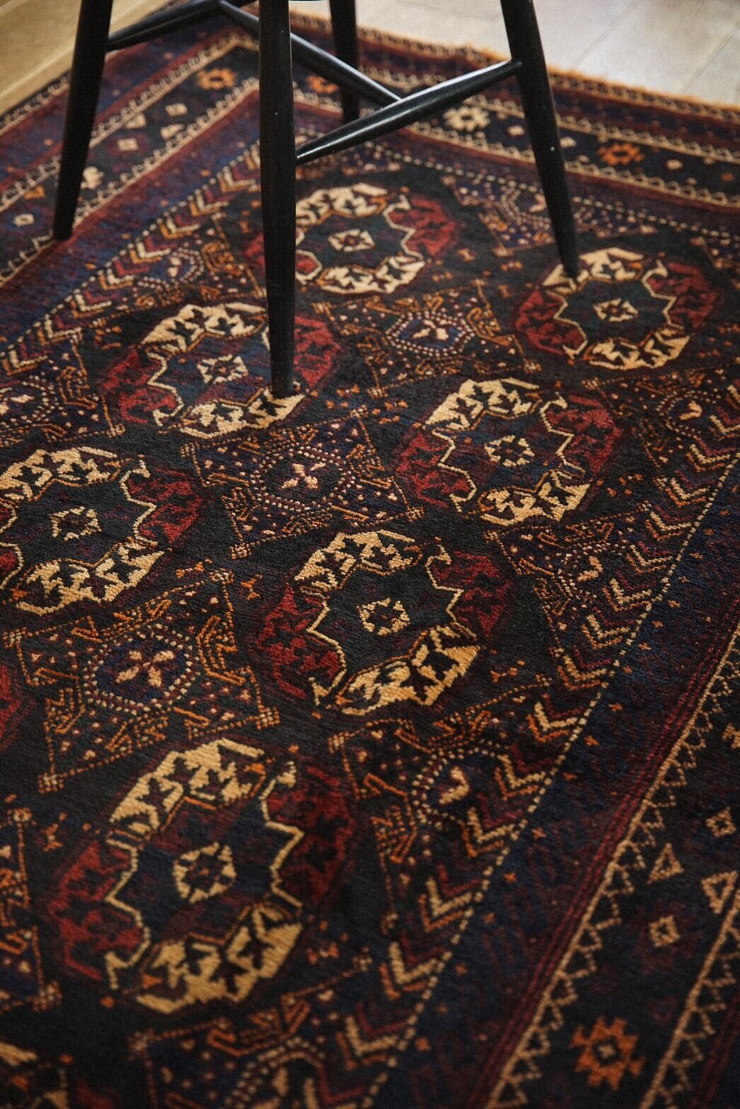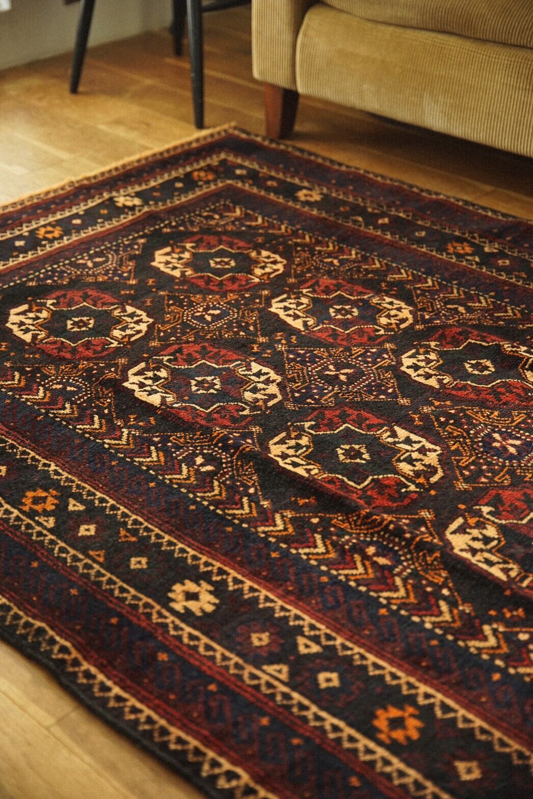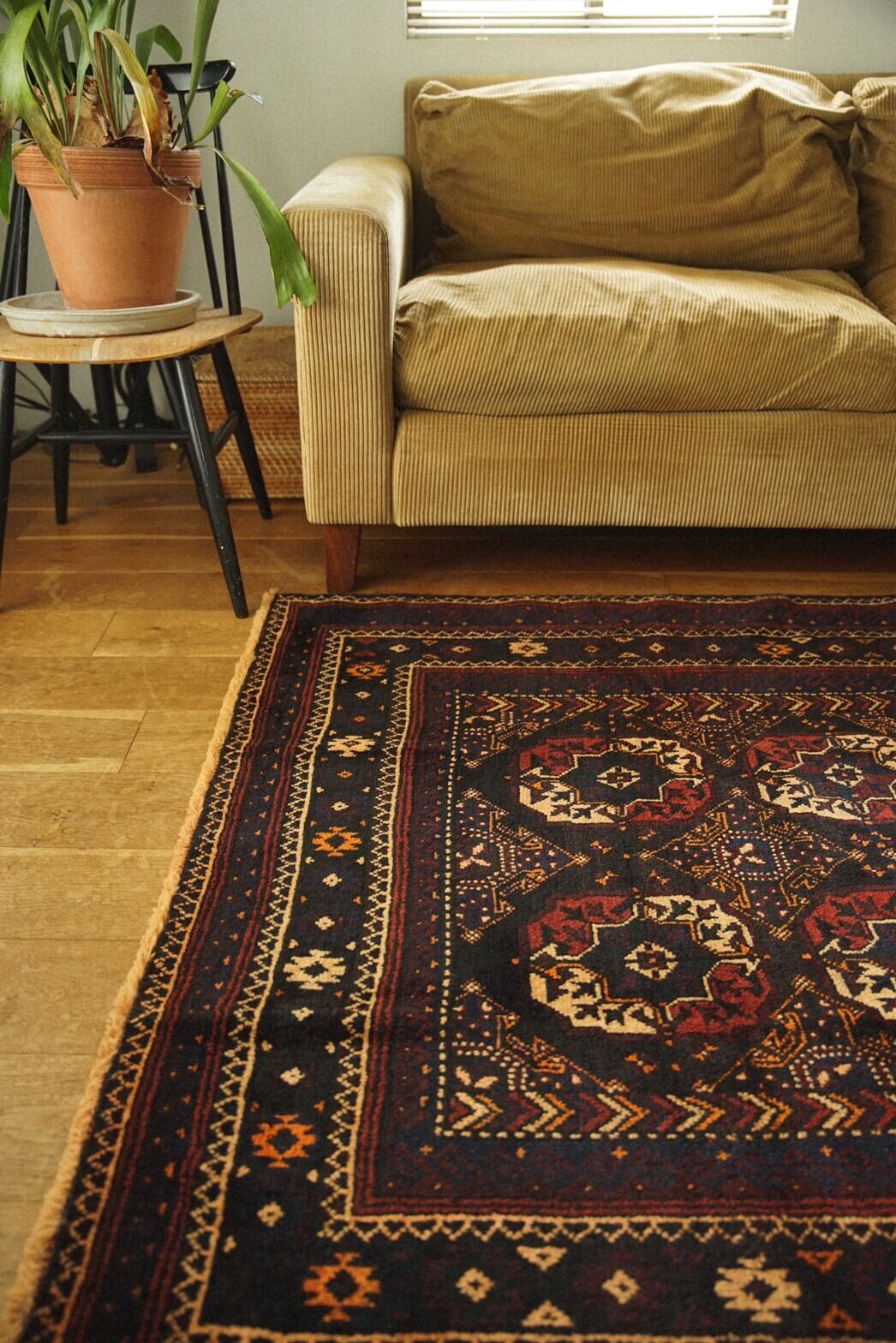 目立ったダメージもなくパーフェクトコンディション。リビングやソファ前、ダイニングテーブルにピッタリのサイズ感。書斎や本棚の前に敷いてもカッコ良さそうですね!若いラグのため、ダメージもなく状態もとても良いので初めてトライバルラグをご検討頂いている方にもおすすめの一枚です。