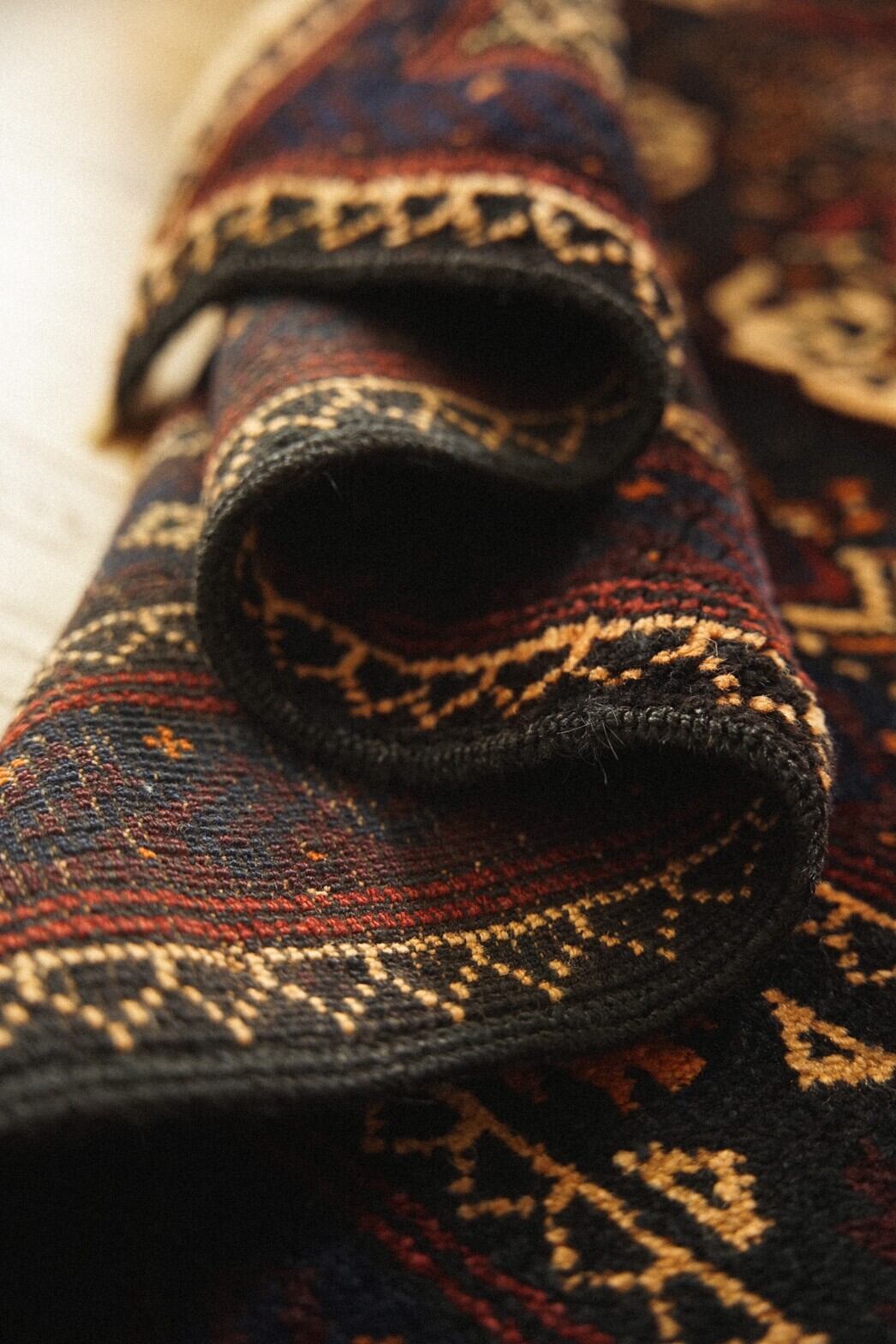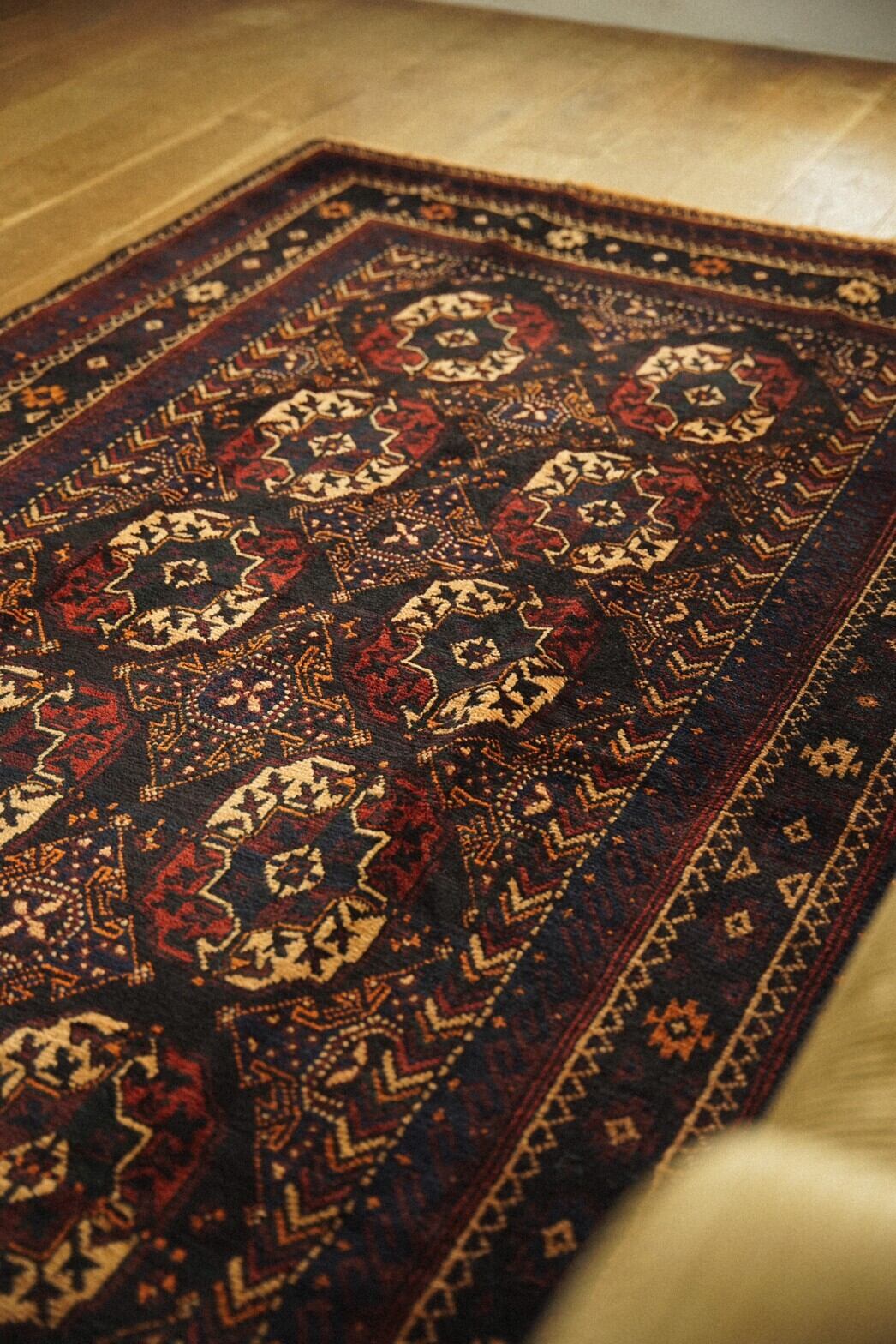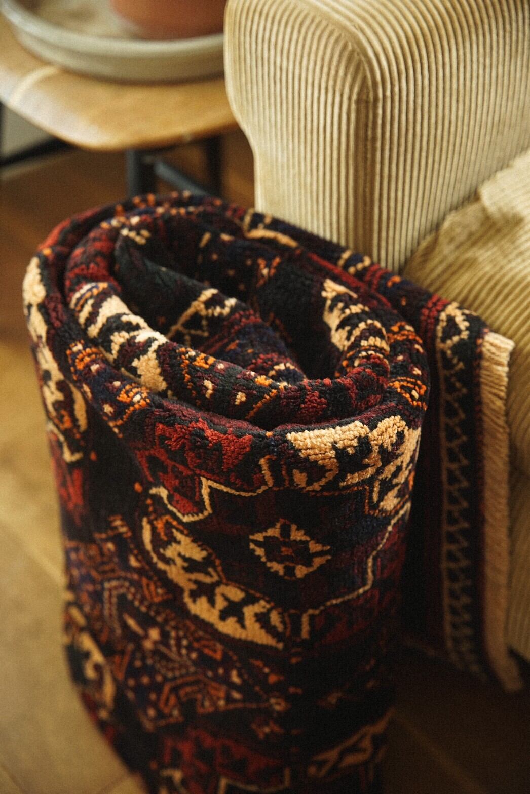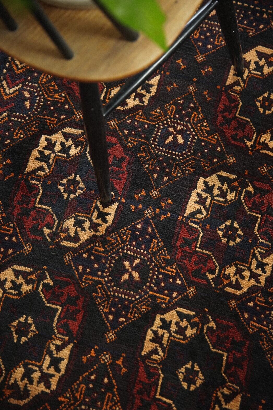 目立ったダメージもなくパーフェクトコンディション。リビングやソファ前、ダイニングテーブルにピッタリのサイズ感。書斎や本棚の前に敷いてもカッコ良さそうですね!若いラグのため、ダメージもなく状態もとても良いので初めてトライバルラグをご検討頂いている方にもおすすめの一枚です。