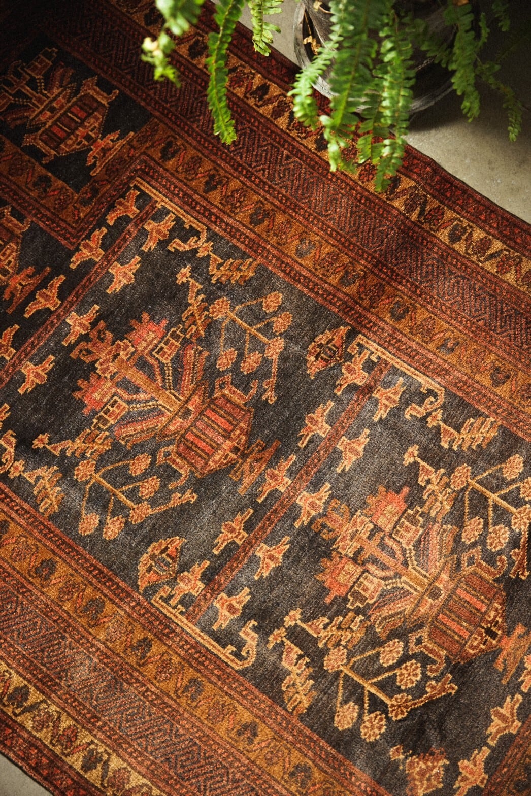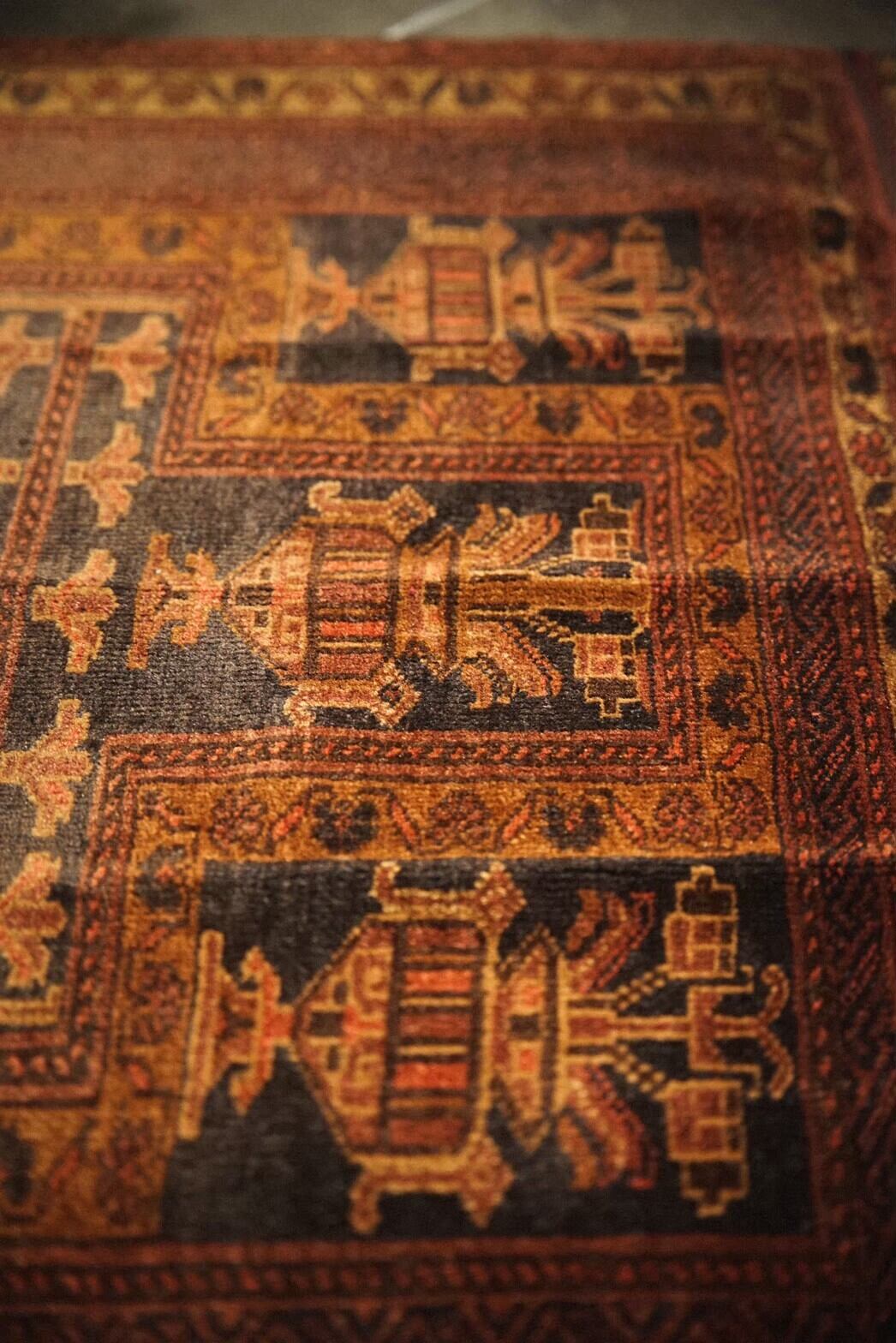 気品を感じるデザインと艶感のあるレンガ色の美しい色合いのバルーチラグ。