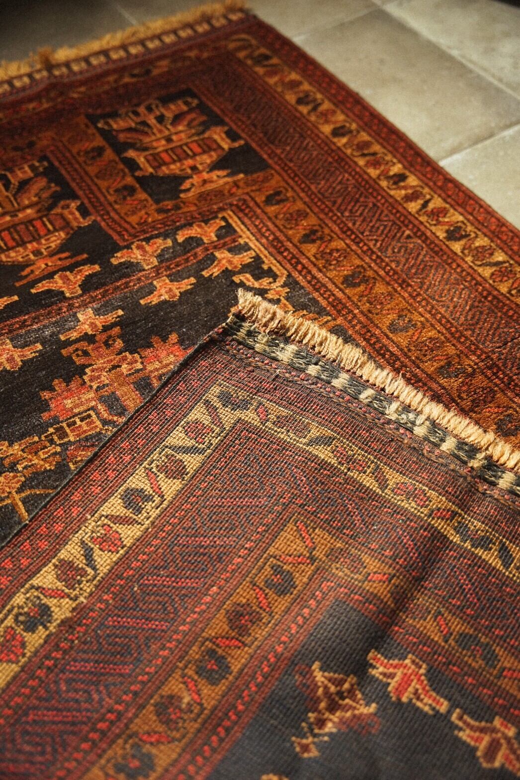 フリンジ部分はキリムエンドになっています。パイルは短めですが、細かい織りで手触りはとても滑らか。