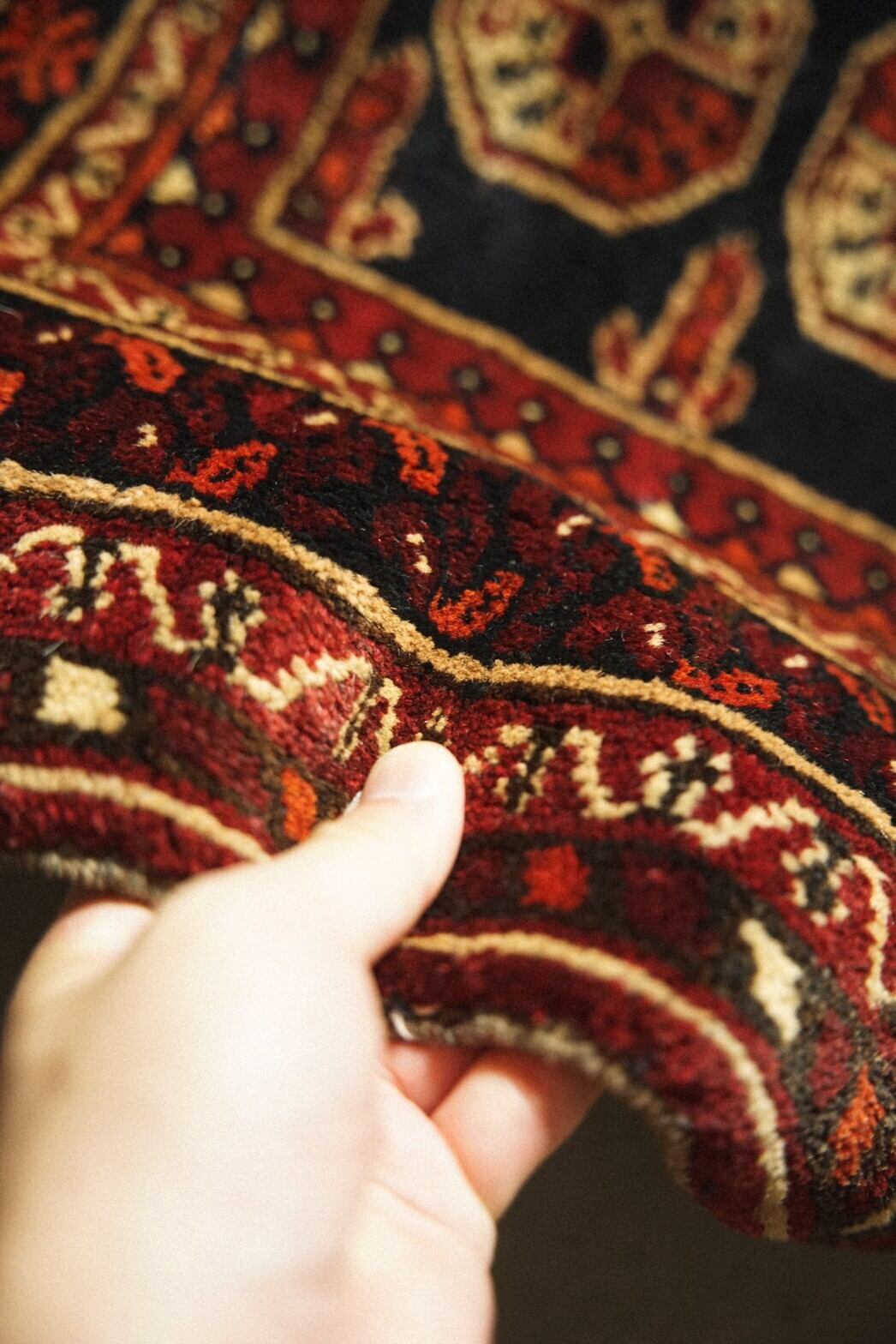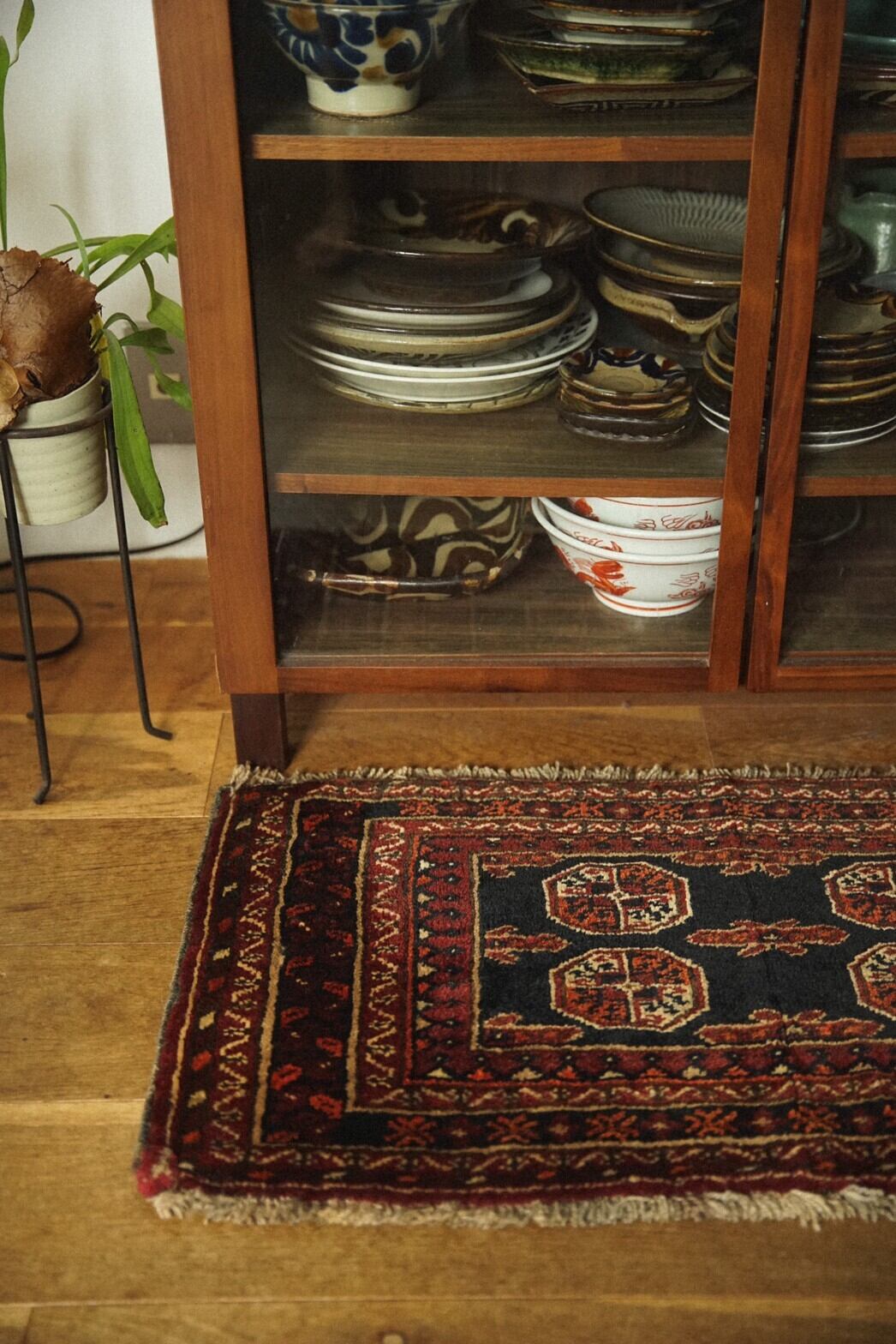 バーリシトと呼ばれる家財や食材を入れたり、屋内ではクッションとして使用される袋状のものをラグに仕立ててもらいました。シックな赤茶系の深い色味で構成されたギュルが並ぶデザインのアフガン産トルクメンラグ。細かい織りで短めパイルですが、厚みと重量感があり、玄関やキッチンなど床に敷くのにおすすめの一枚。状態もよく滑らかでとても気持ち良い手触り。使いやすいサイズ感なのでお気に入りの場所に敷いてみてください。