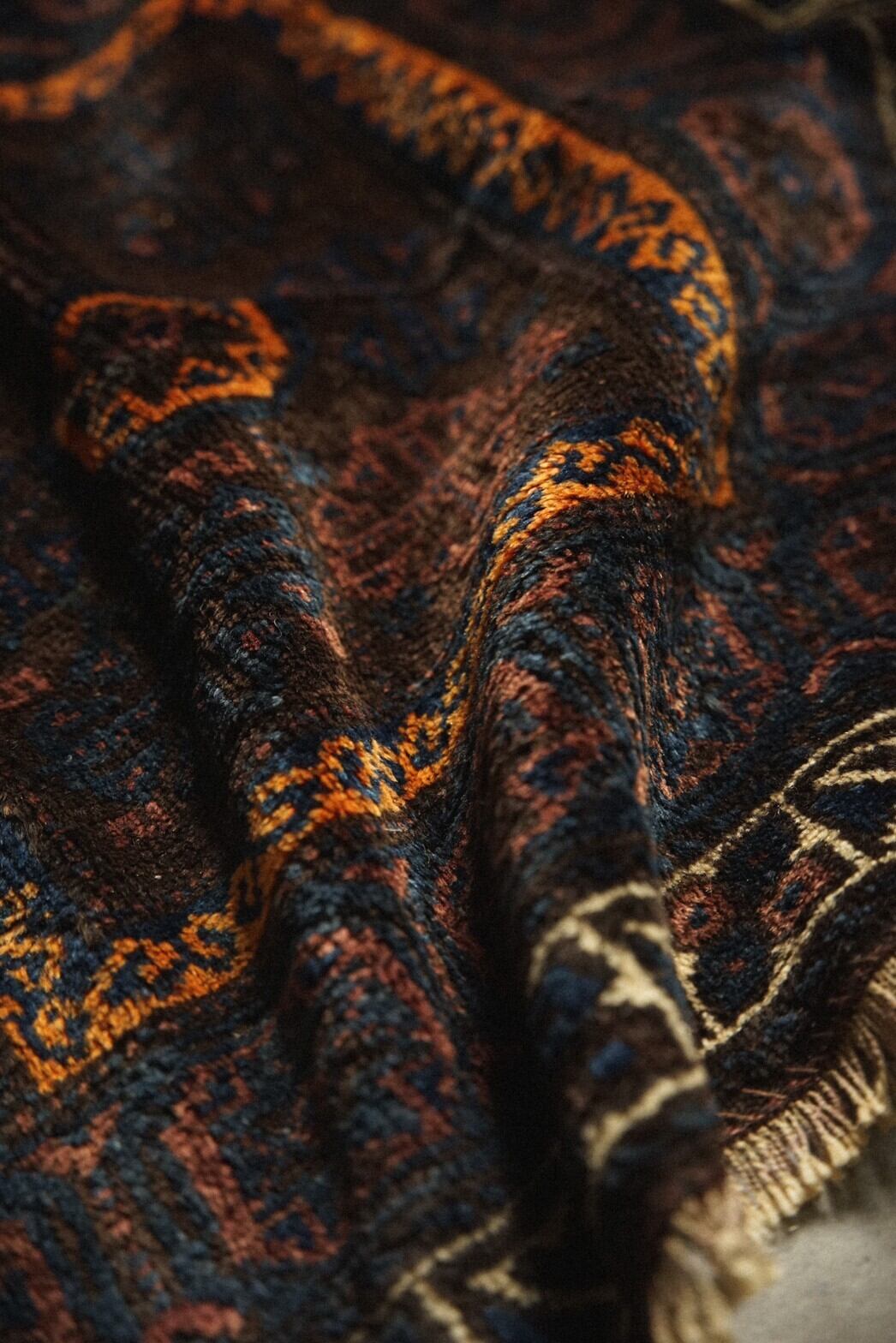 焦げ茶ベースにネイビーや小豆色など渋めの色合いが「暗闇に光る宝石」と呼ばれるバルーチらしい魅力的な一枚。
