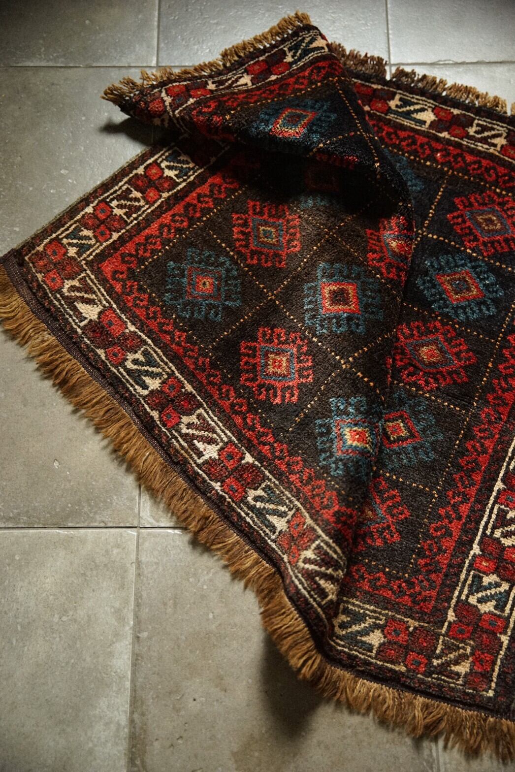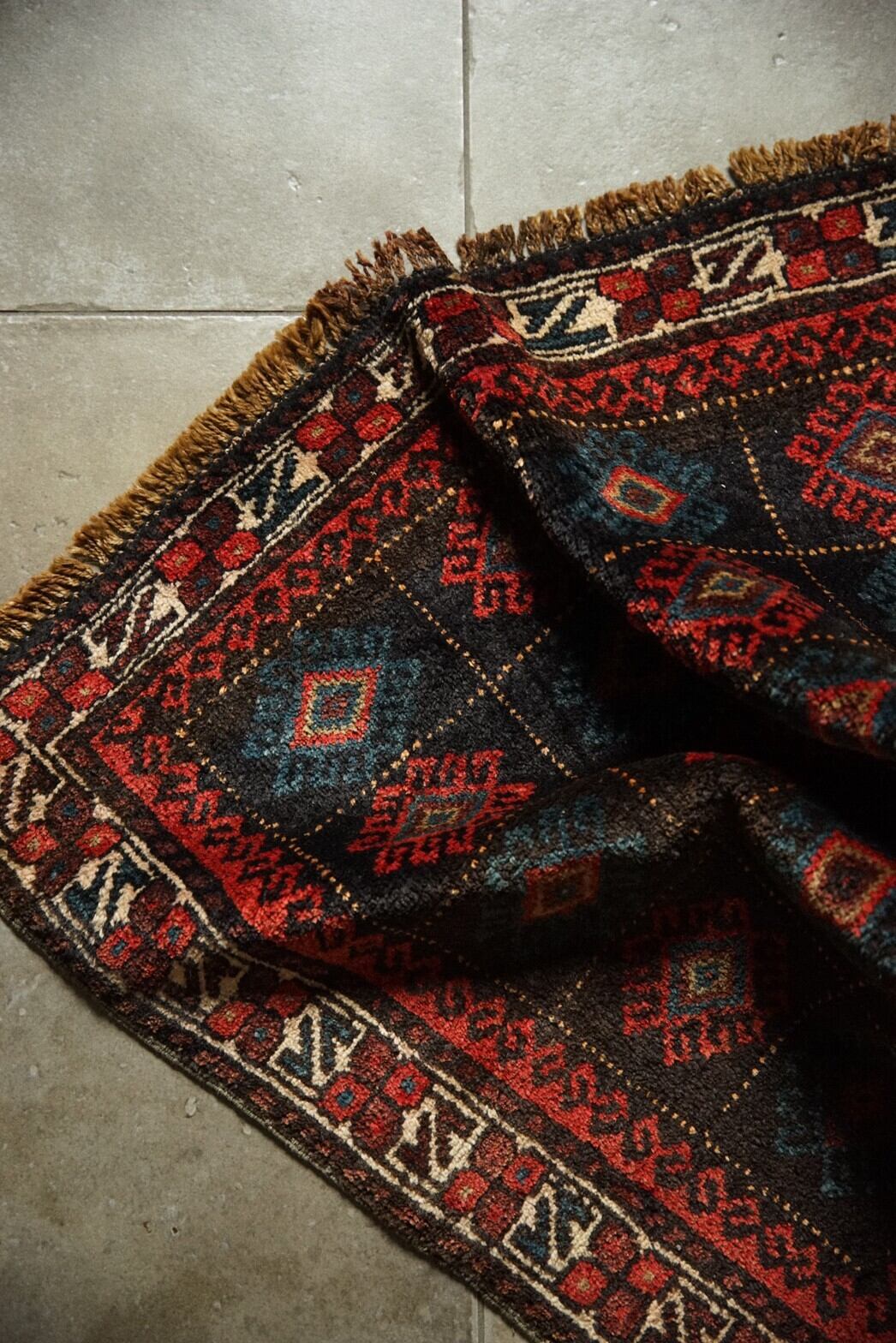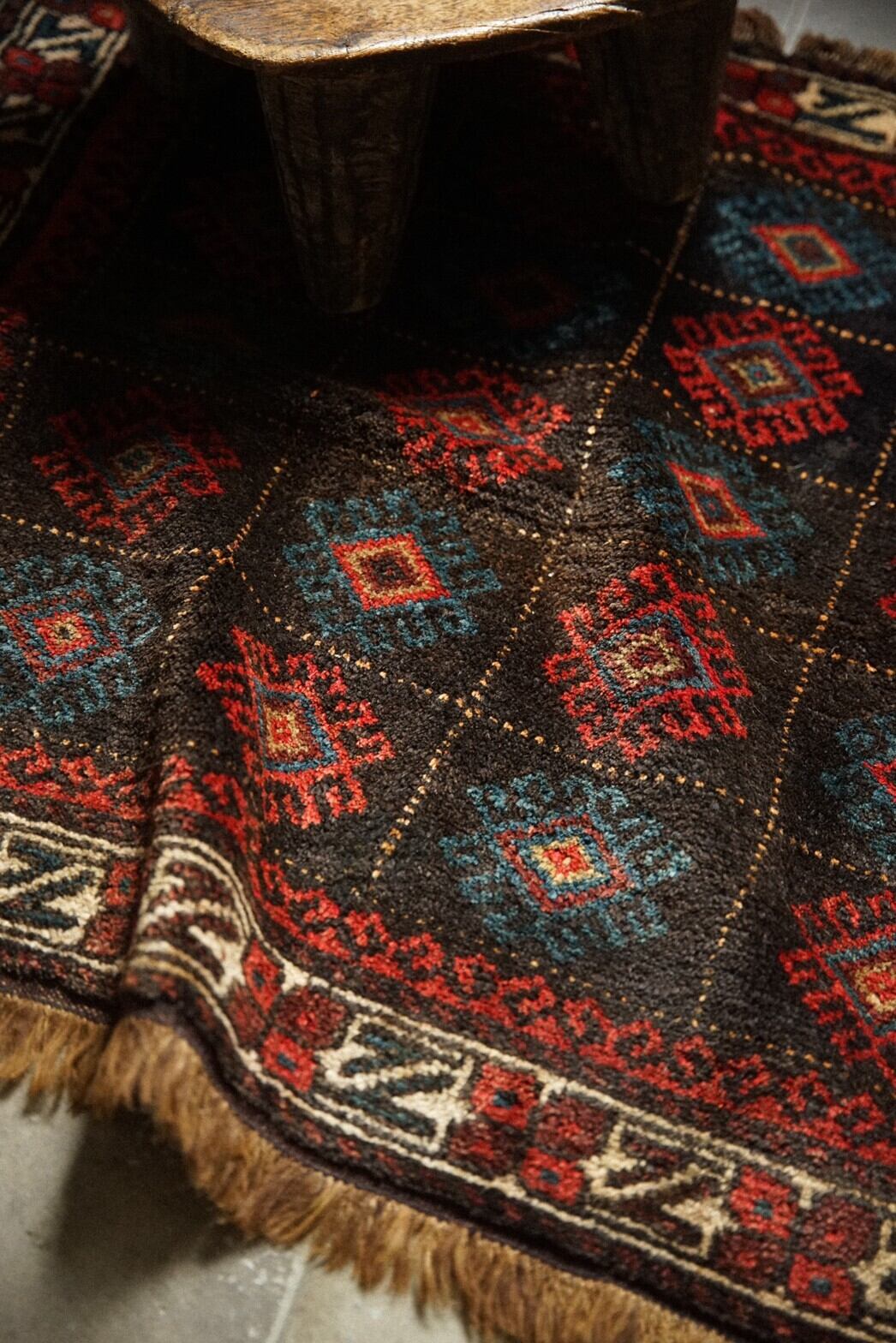 アフガニスタン産バルーチのサドルバッグのバッグフェイス。経年により褪色した墨黒ベースに小さなメダリオンが並んだデザイン。艶もあり美しいパイルは柔らかく触り心地も滑らかです。暗い色のフィールドから浮き上がる赤と青のコントラストがとてもかっこいい一枚です。90年近い年月が経っているこちらのラグですが、サドルバッグのため擦れやダメージもなくグッドコンディション。アンティークと呼ばれるまであと少し大切に育てて頂ければと思います。使いやすいスクエア型なのでちょっとしたお部屋の模様替えなどにもぴったりです。小さいサイズながらも存在感あるラグをお探しの方へ。