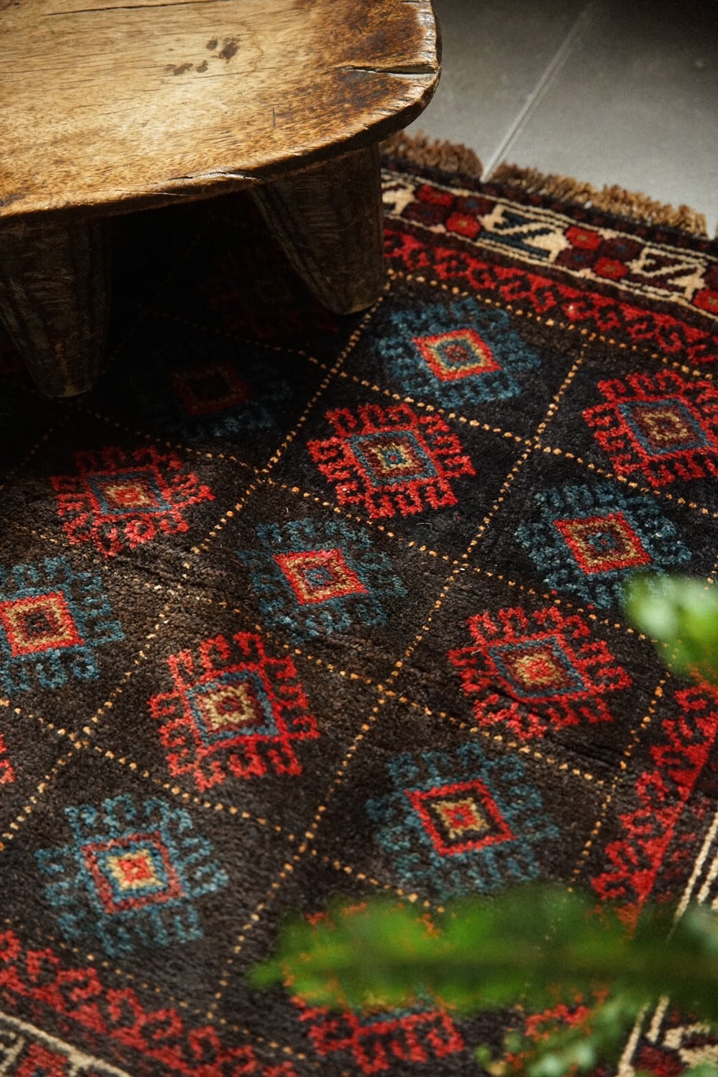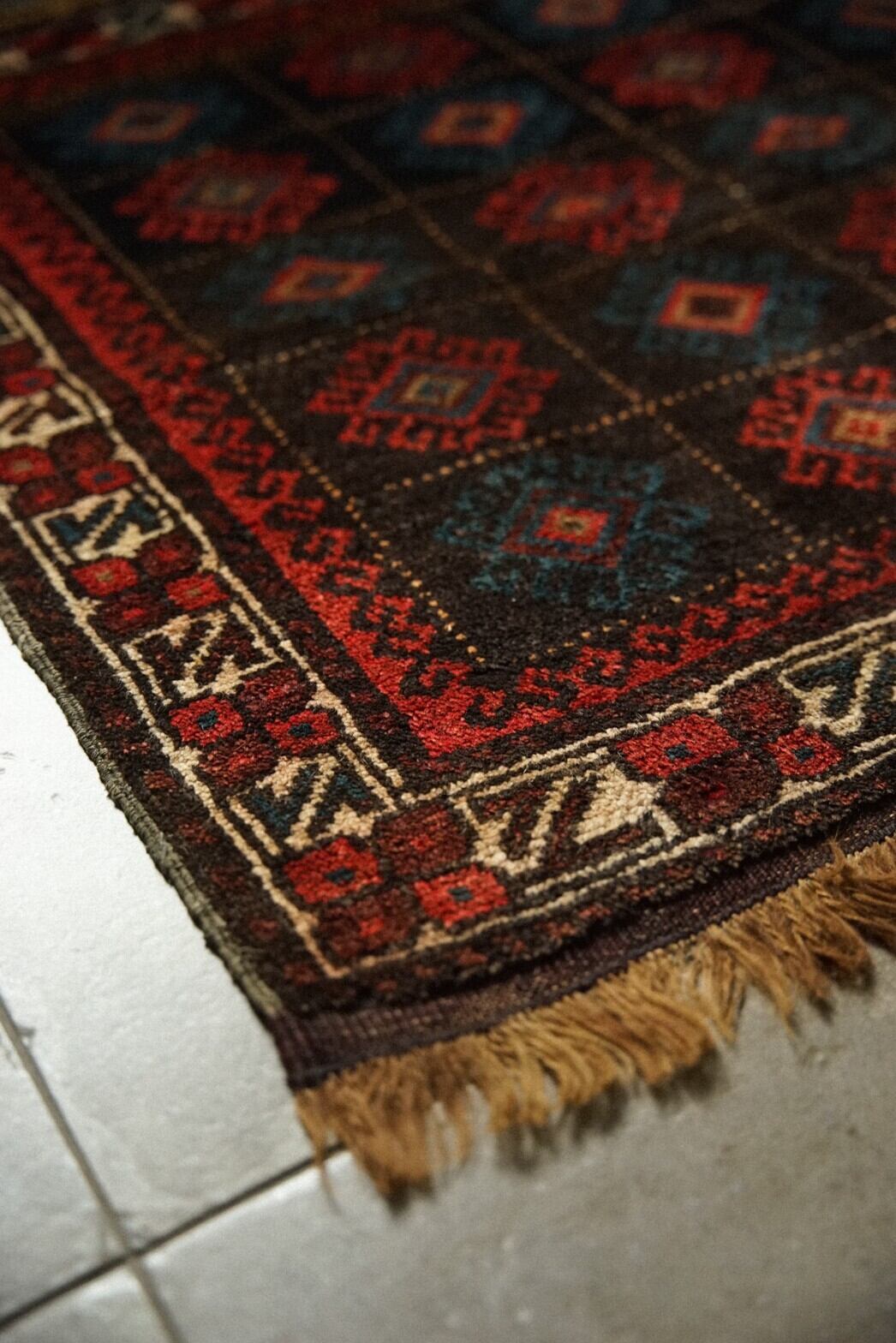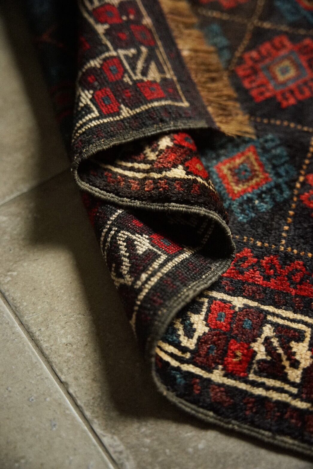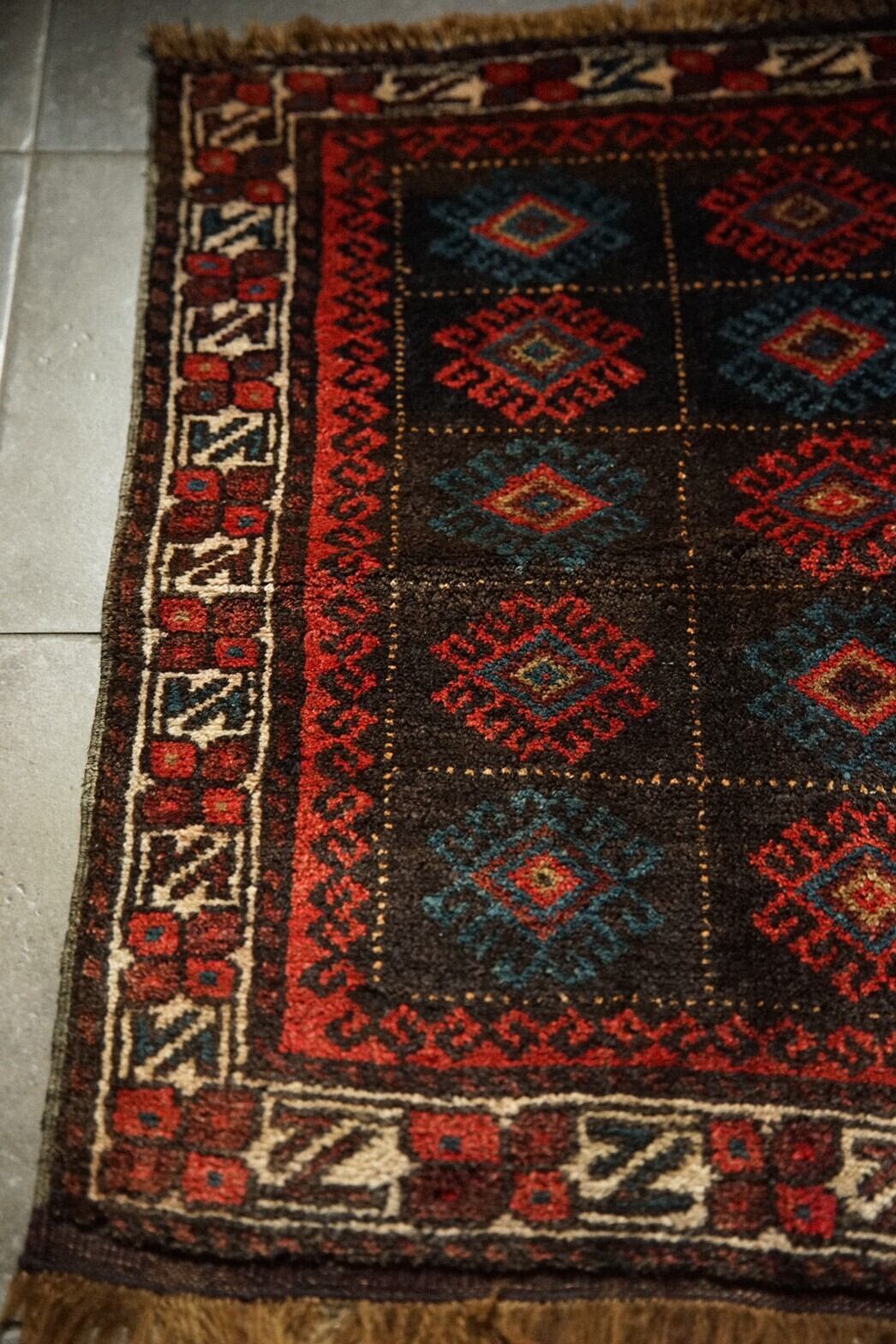 アフガニスタン産バルーチのサドルバッグのバッグフェイス。経年により褪色した墨黒ベースに小さなメダリオンが並んだデザイン。艶もあり美しいパイルは柔らかく触り心地も滑らかです。暗い色のフィールドから浮き上がる赤と青のコントラストがとてもかっこいい一枚です。90年近い年月が経っているこちらのラグですが、サドルバッグのため擦れやダメージもなくグッドコンディション。アンティークと呼ばれるまであと少し大切に育てて頂ければと思います。使いやすいスクエア型なのでちょっとしたお部屋の模様替えなどにもぴったりです。小さいサイズながらも存在感あるラグをお探しの方へ。