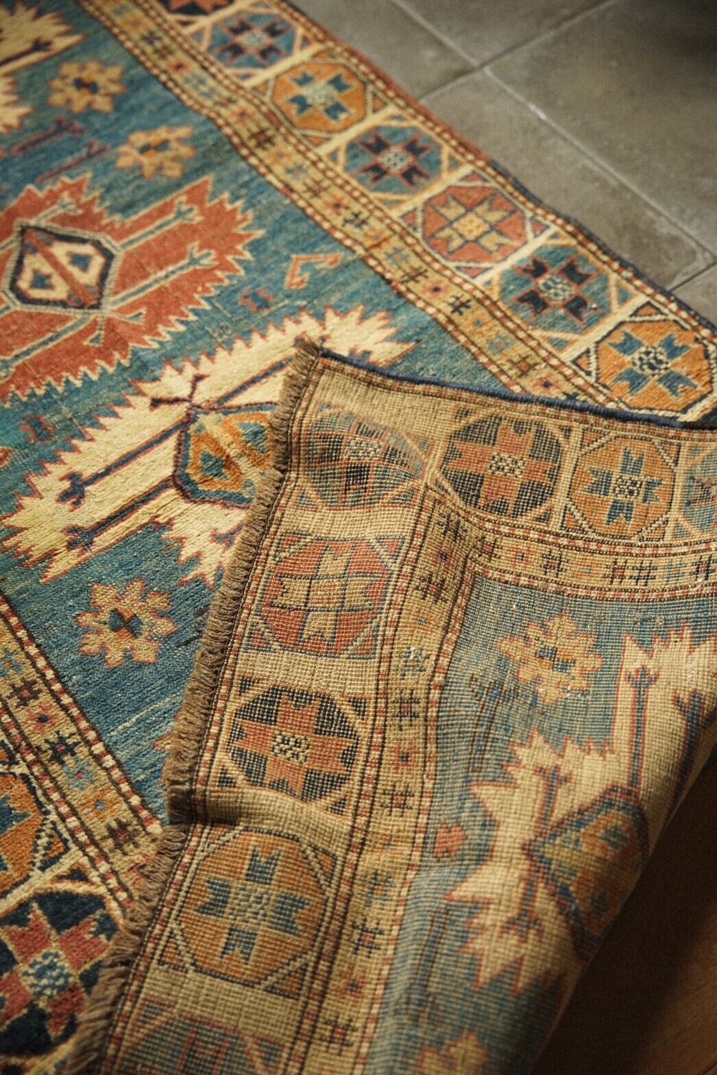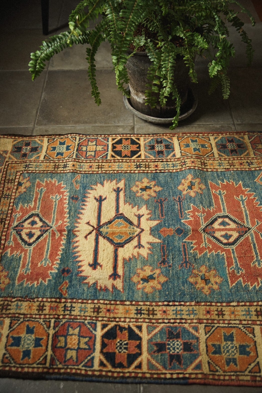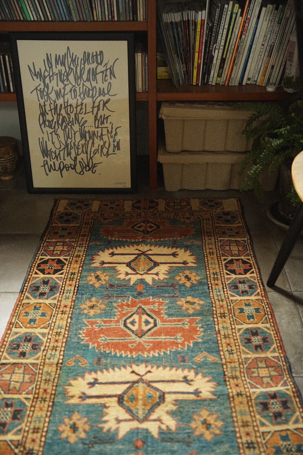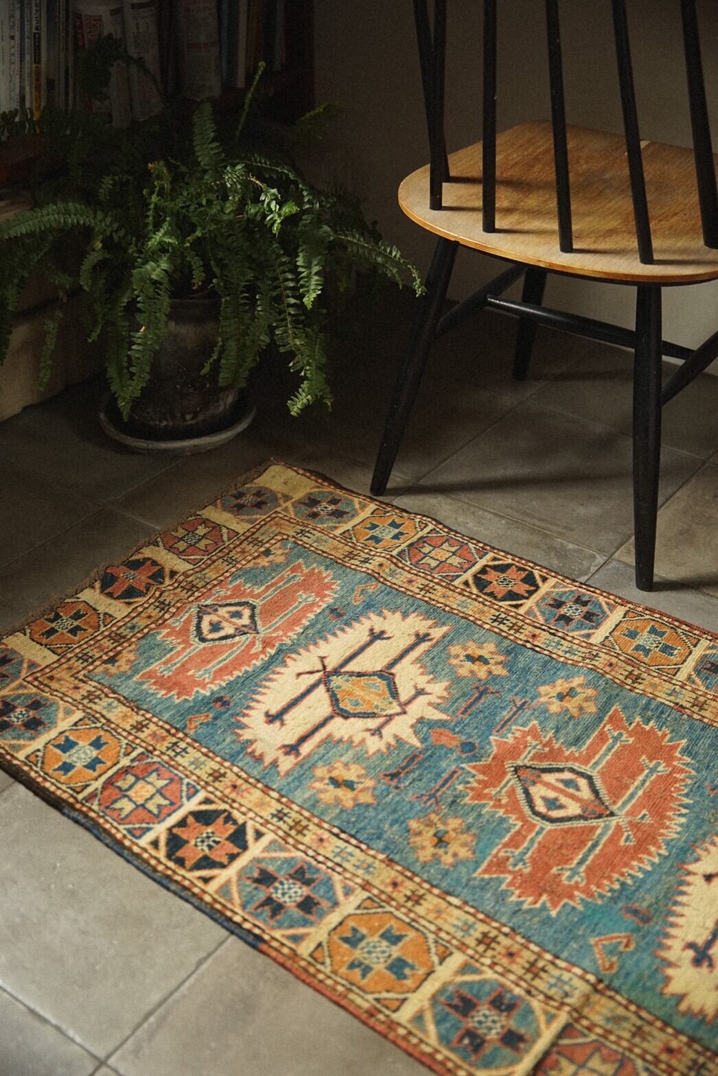 水色をベースに、ベージュ、レッド、ネイビー、アイボリーなどくすみ感のある色味はヴィンテージラグならではの風合いがあり、とてもかっこいい一枚。