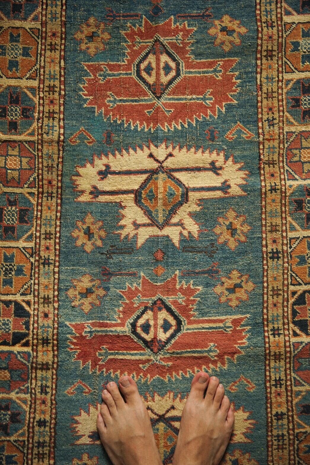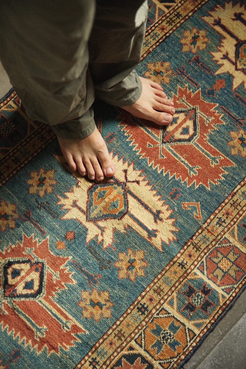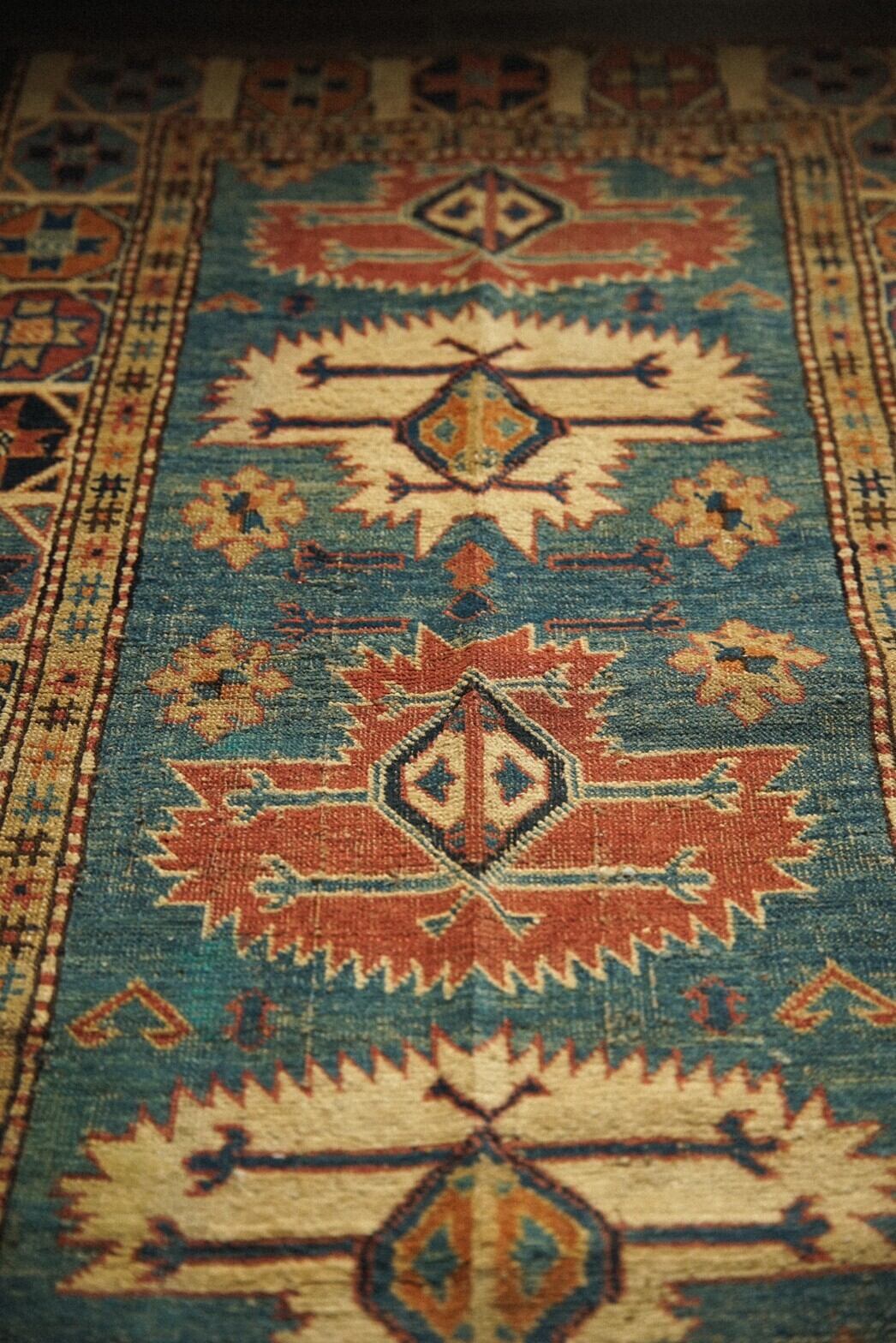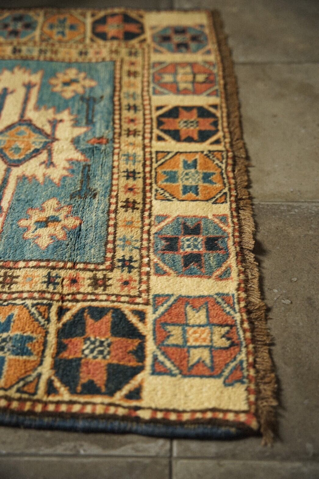 水色をベースに、ベージュ、レッド、ネイビー、アイボリーなどくすみ感のある色味はヴィンテージラグならではの風合いがあり、とてもかっこいい一枚。