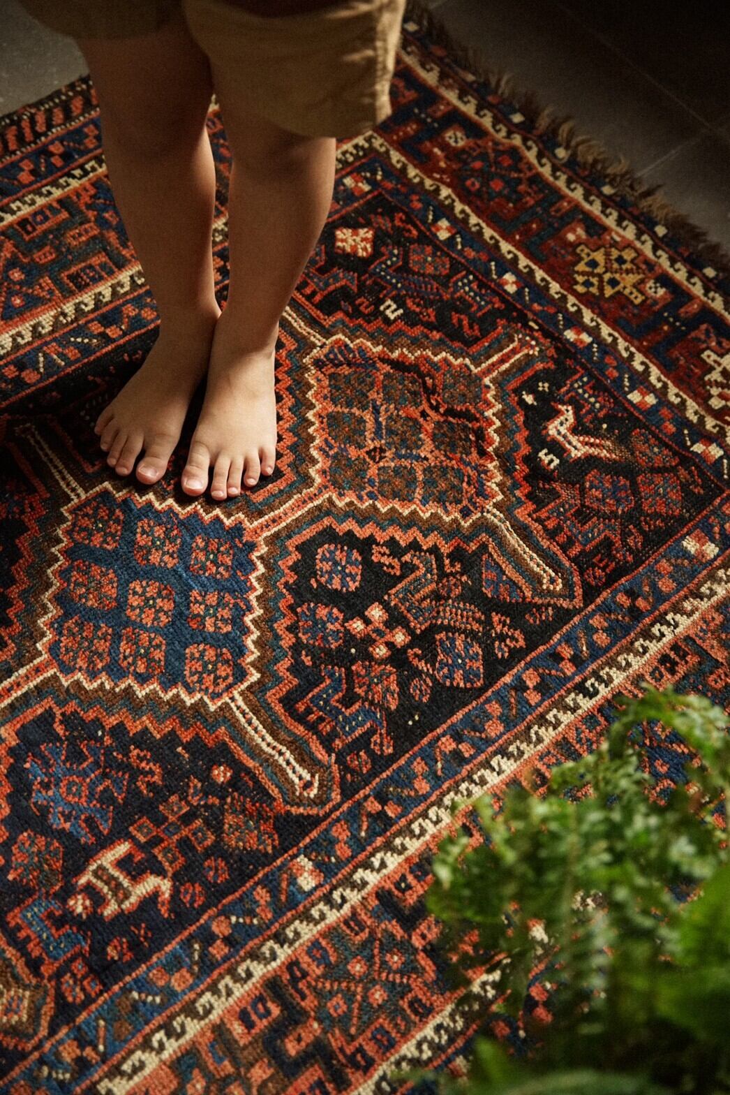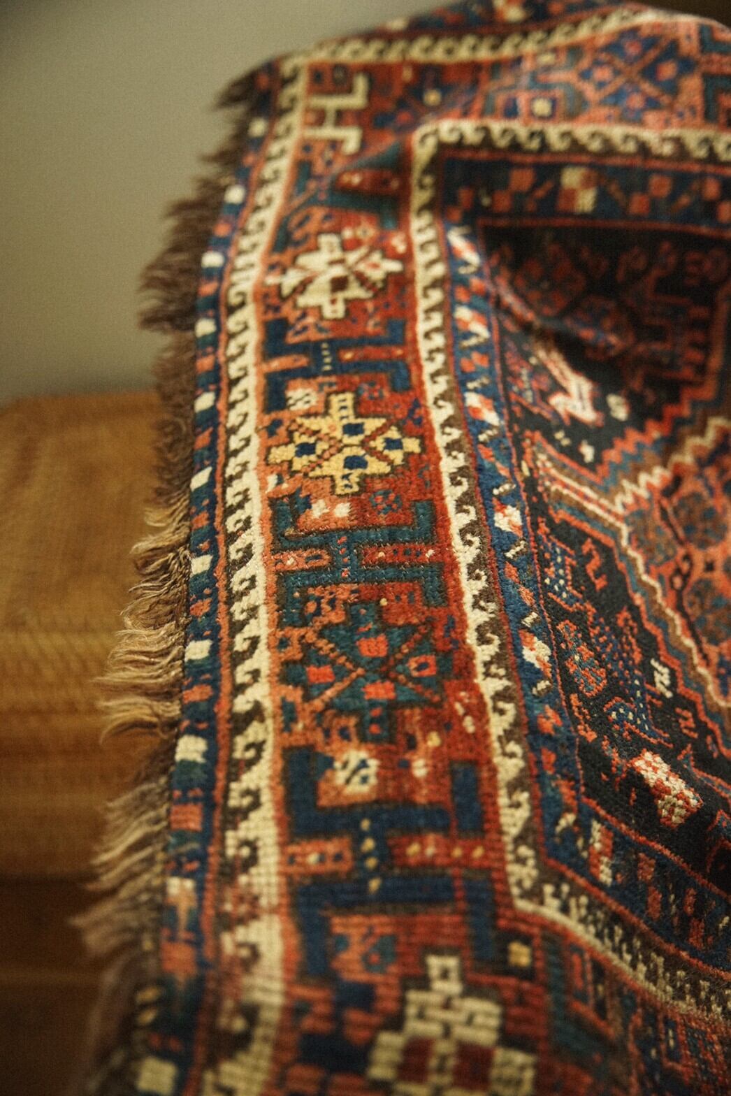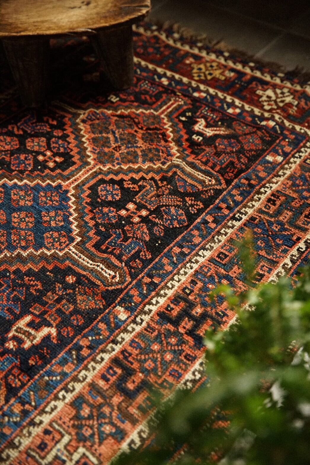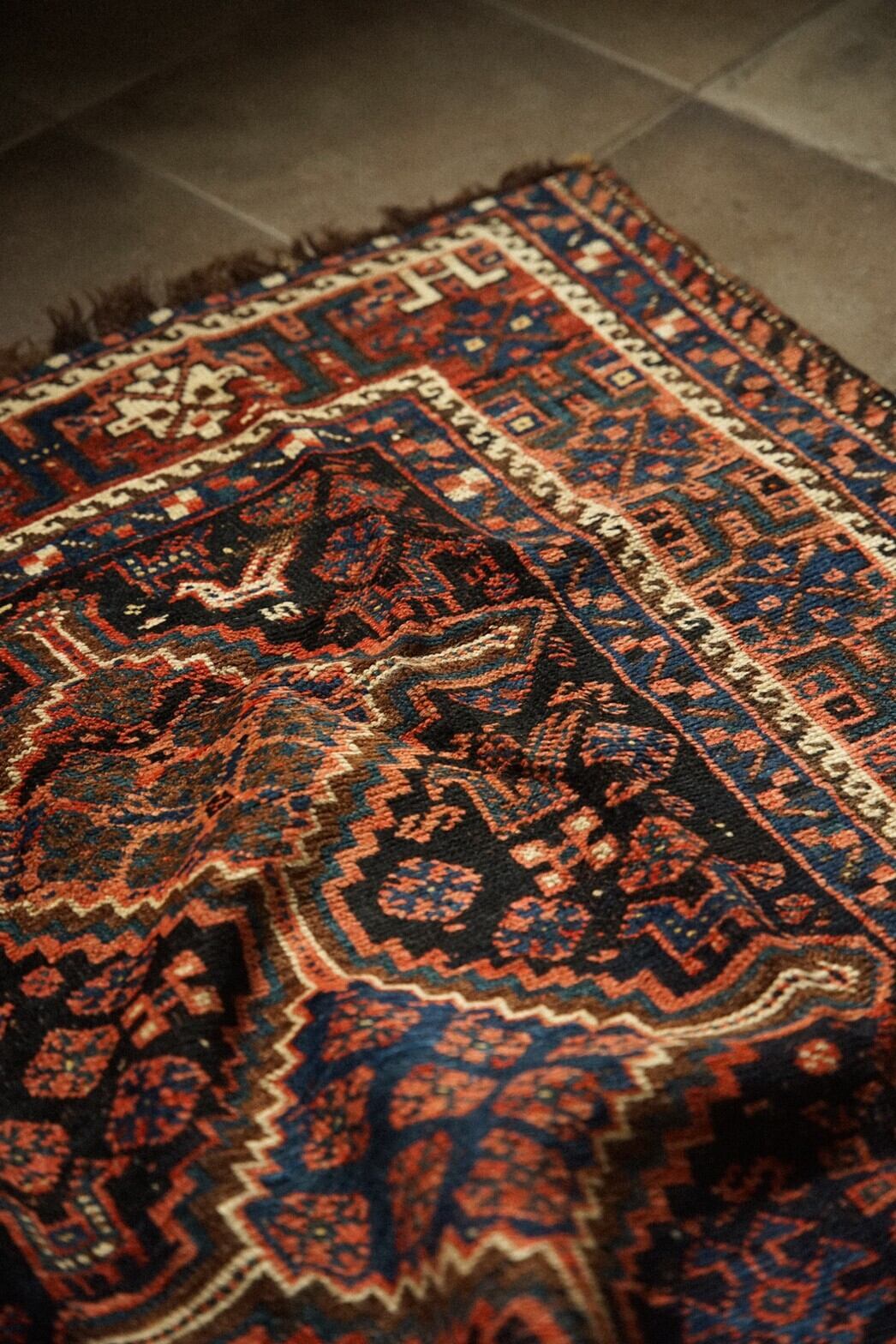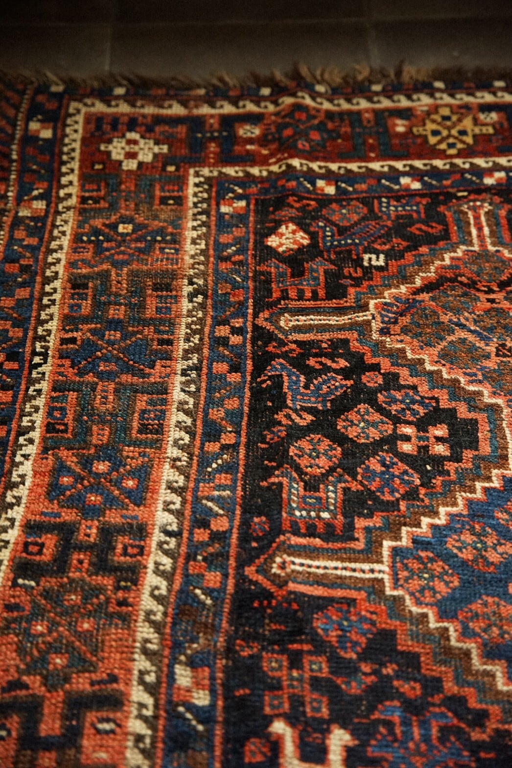 イラン南部のファルス州周辺に住むハムセ連合によって織られた1940年代のセミアンティークラグ。夜明け前の空の様な吸い込まれそうに深いネイビーのフィールドにはお花や鳥、動物などの可愛らしいモチーフが並んでいます。3連メダリオンやボーダー部分には優しい色味のコーラル(珊瑚色)が使われ、目を和ませてくれています。セルベッジ部分はハムセラグの特徴でもあるマルチカラーになっています。パイルは短めですがざっくりとした織りで程良い厚みがあり、目立ったダメージもなくグッドコンディション。床に敷いての使用も問題ございません。使いやすいサイズ感なので、お気に入りの場所にどうぞ♪