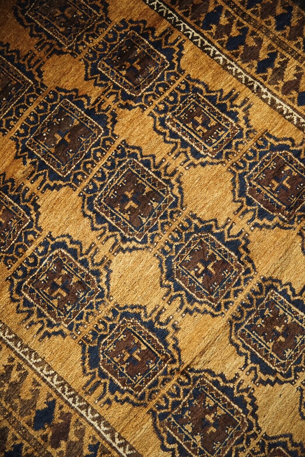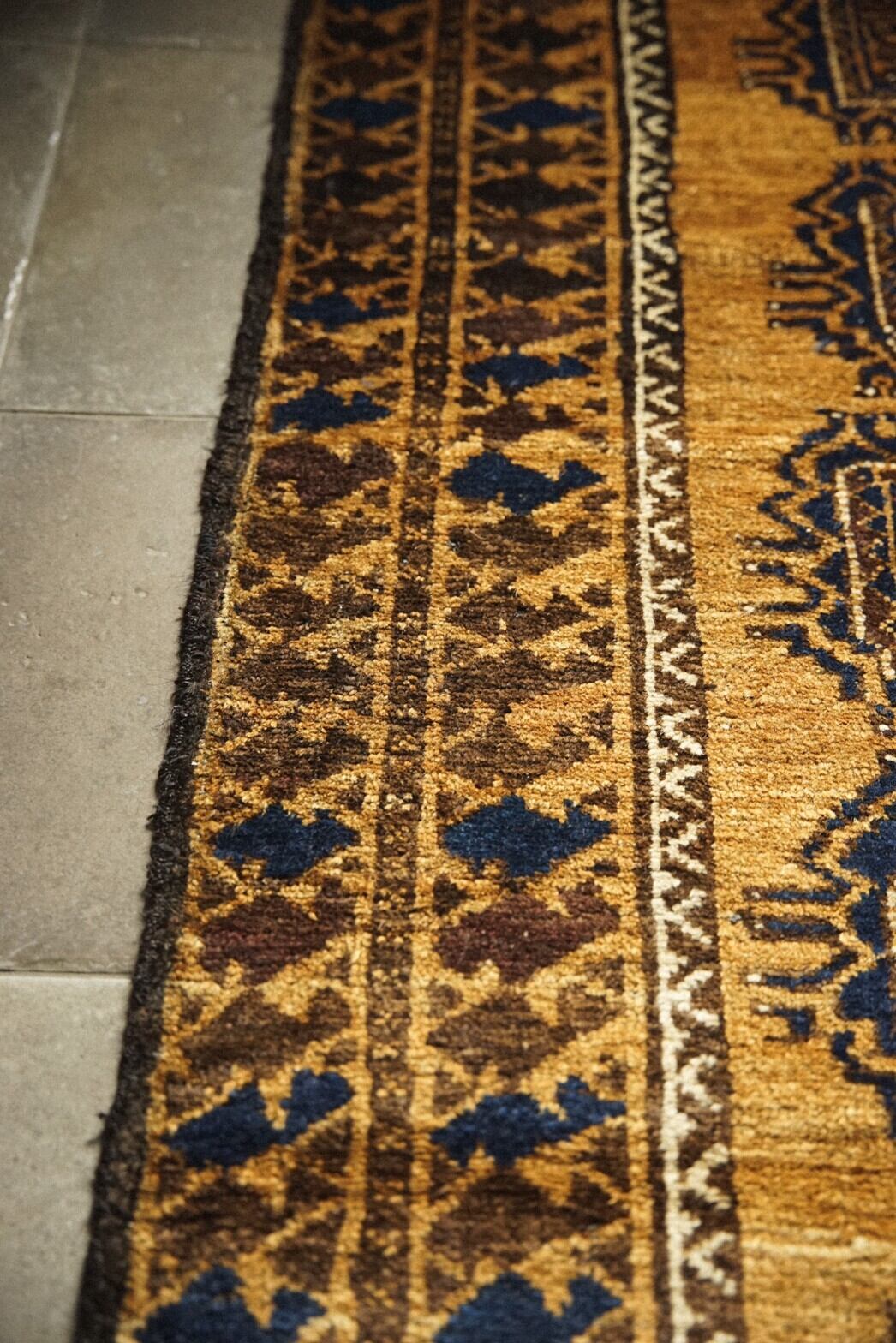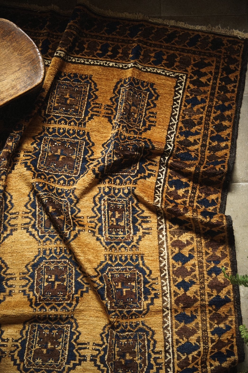 キラキラとした砂漠とその上を歩くラクダを想わせる美しいバルーチラグ。フィールドは原毛色のキャメルウール。ネイビーとブラウンとのシンプルな組み合わせと、少しゆるさを感じるユニークなギュルデザインがバランスの良い一枚になっています。パイルはきれいに残っておりグッドコンディション。ラグも程良い厚みがあり、素足で踏み込むと気持ちいいですよ♪シンプル系からナチュラル系のインテリア、そして和室にも合いそうです。リビングやソファ前、書斎、ベッドサイドなどにおすすめのサイズ感です。