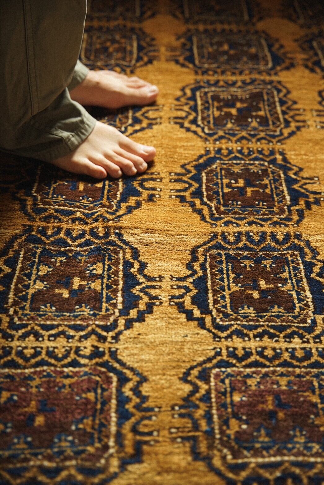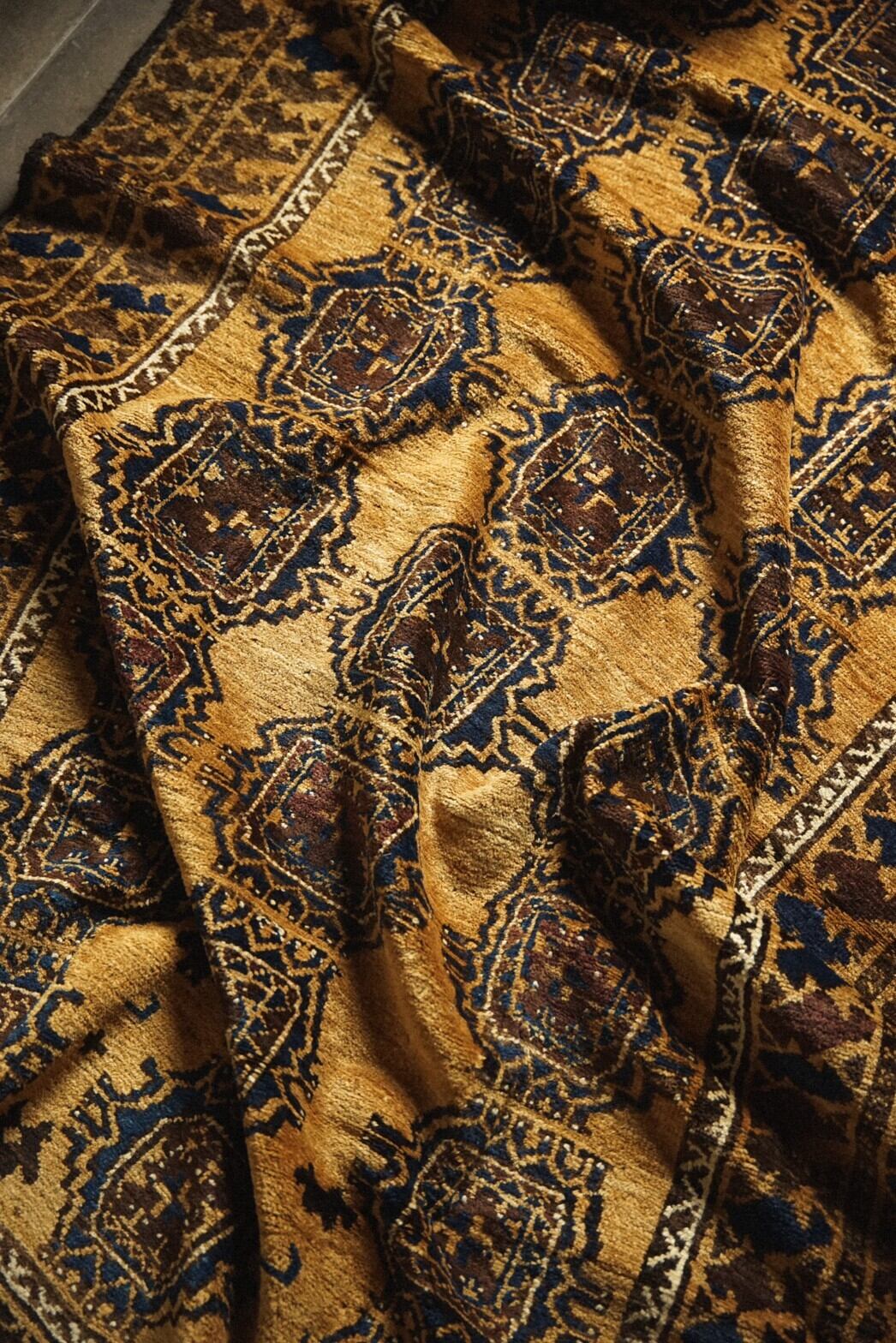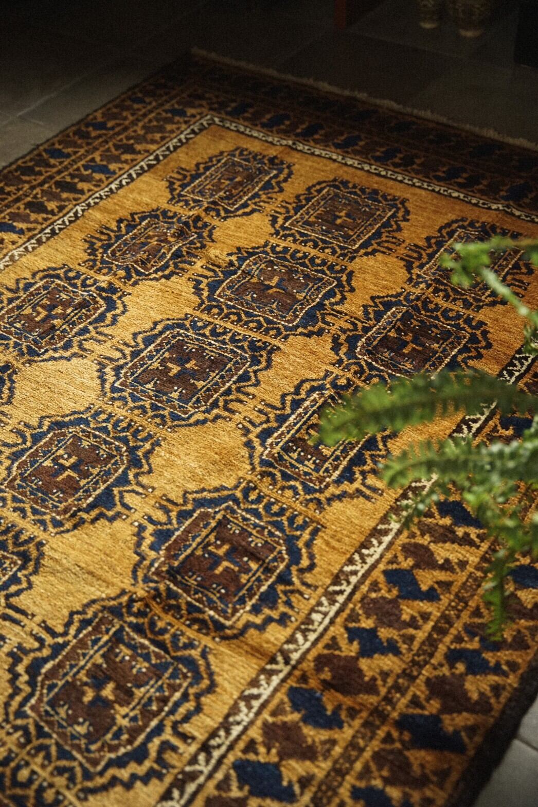 キラキラとした砂漠とその上を歩くラクダを想わせる美しいバルーチラグ。フィールドは原毛色のキャメルウール。ネイビーとブラウンとのシンプルな組み合わせと、少しゆるさを感じるユニークなギュルデザインがバランスの良い一枚になっています。パイルはきれいに残っておりグッドコンディション。ラグも程良い厚みがあり、素足で踏み込むと気持ちいいですよ♪シンプル系からナチュラル系のインテリア、そして和室にも合いそうです。リビングやソファ前、書斎、ベッドサイドなどにおすすめのサイズ感です。