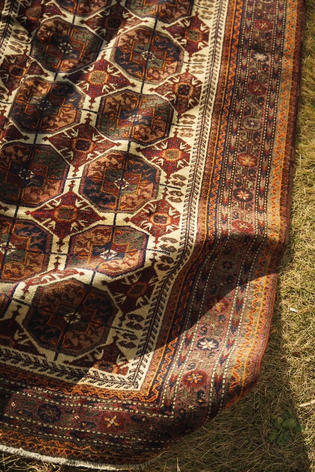 スモーキーな色味がかっこいいい「Madad khani」デザインのバルーチラグ。