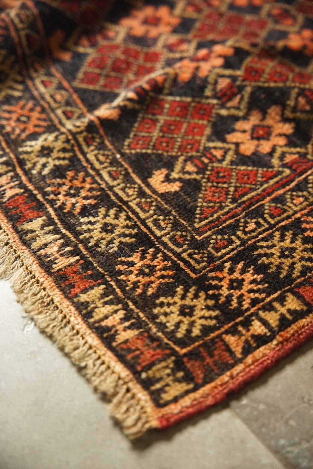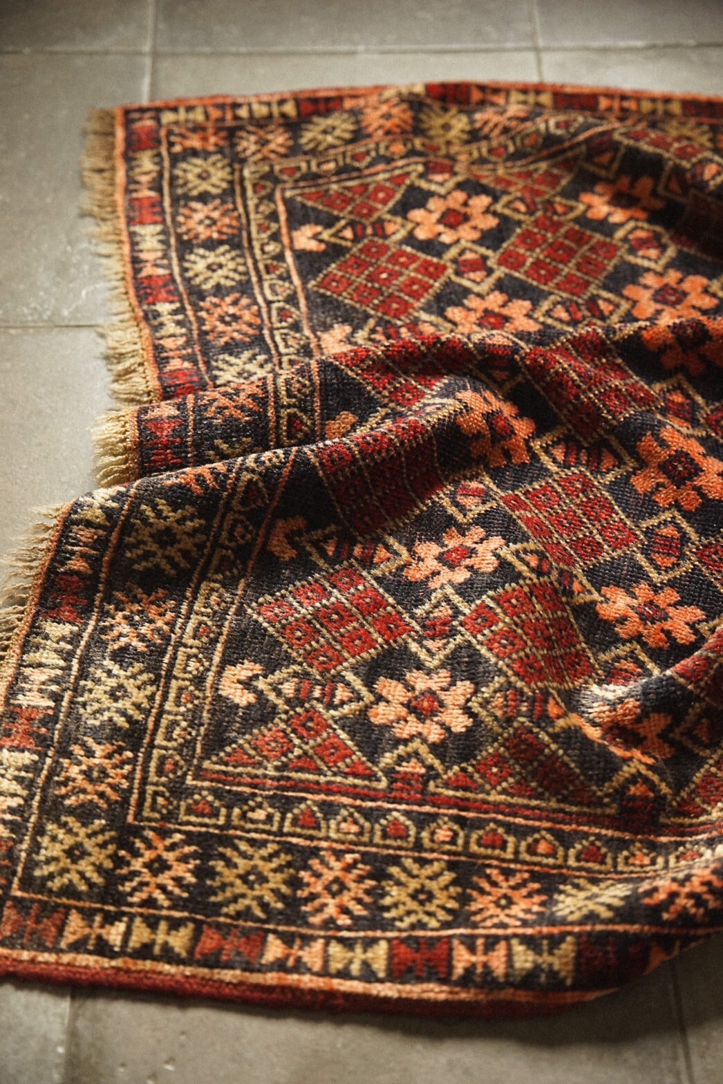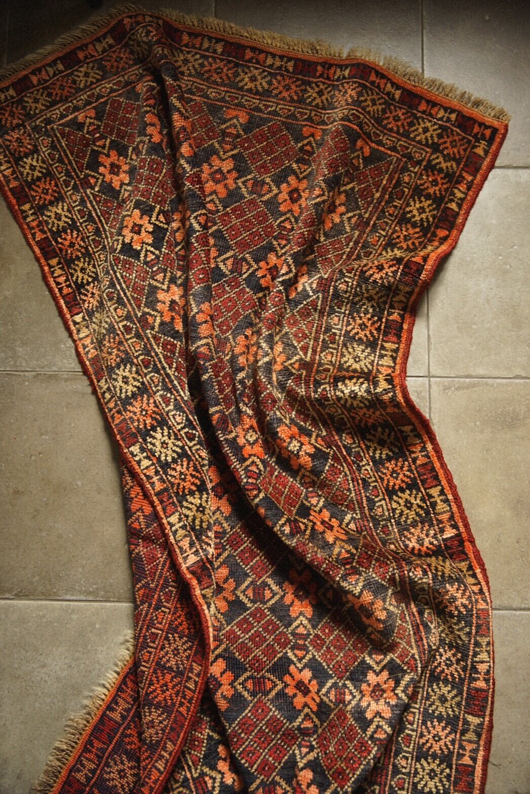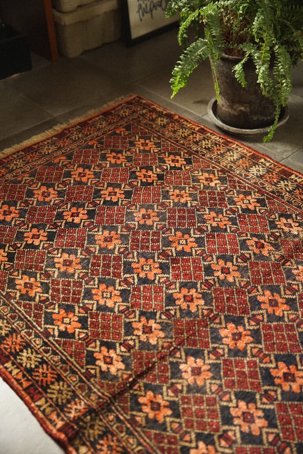 1960年代に織られたバルーチラグ。赤やオレンジ、アイボリーなどの暖色系ベースの色味が優しい雰囲気が魅力的な一枚。