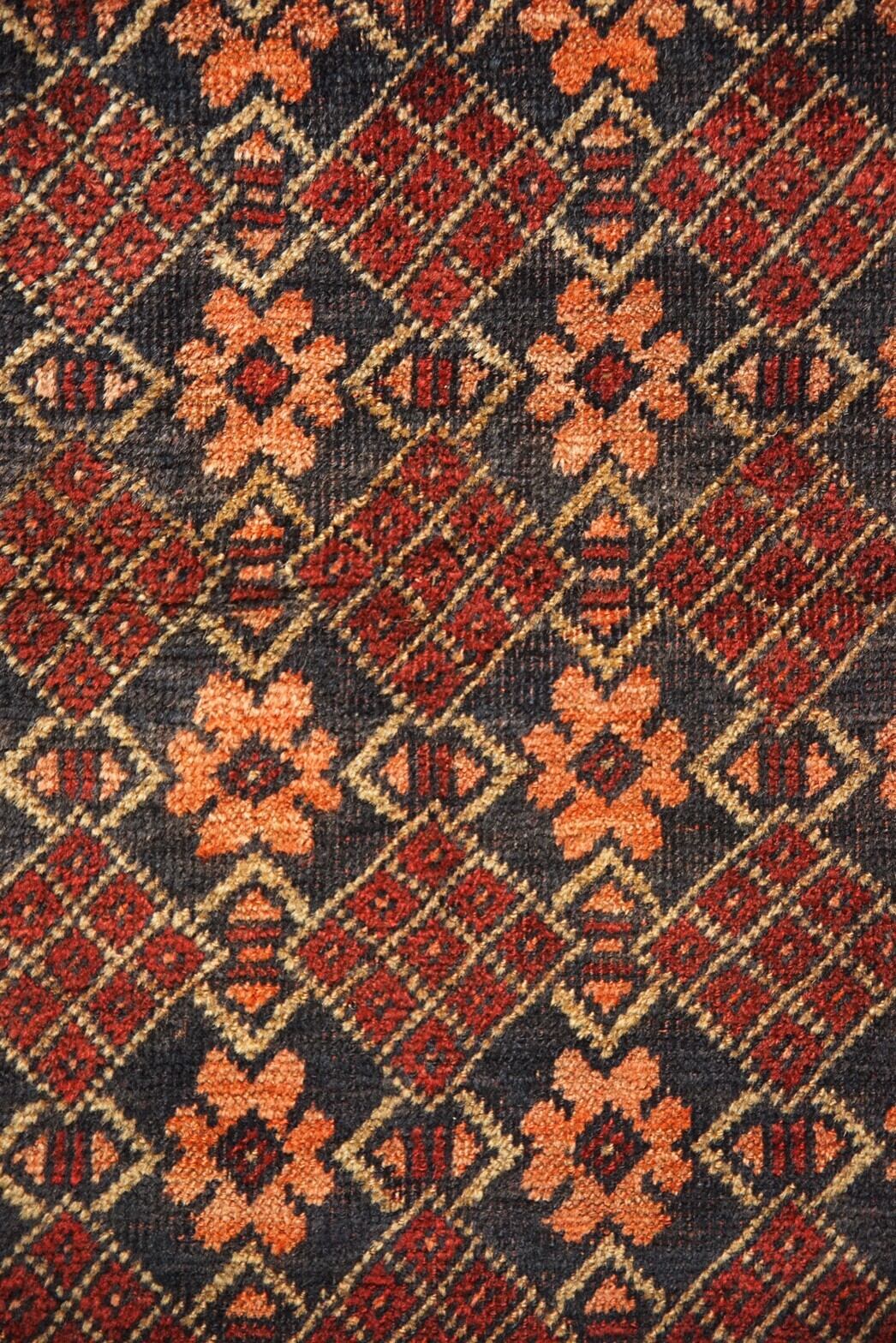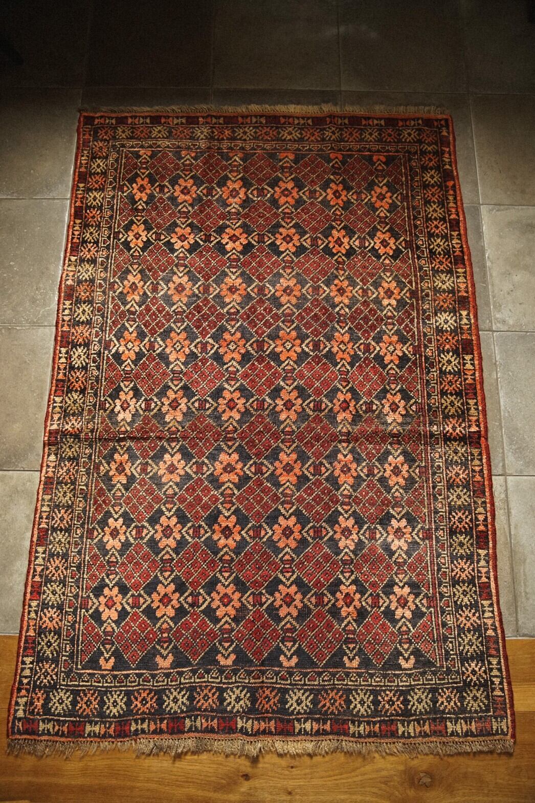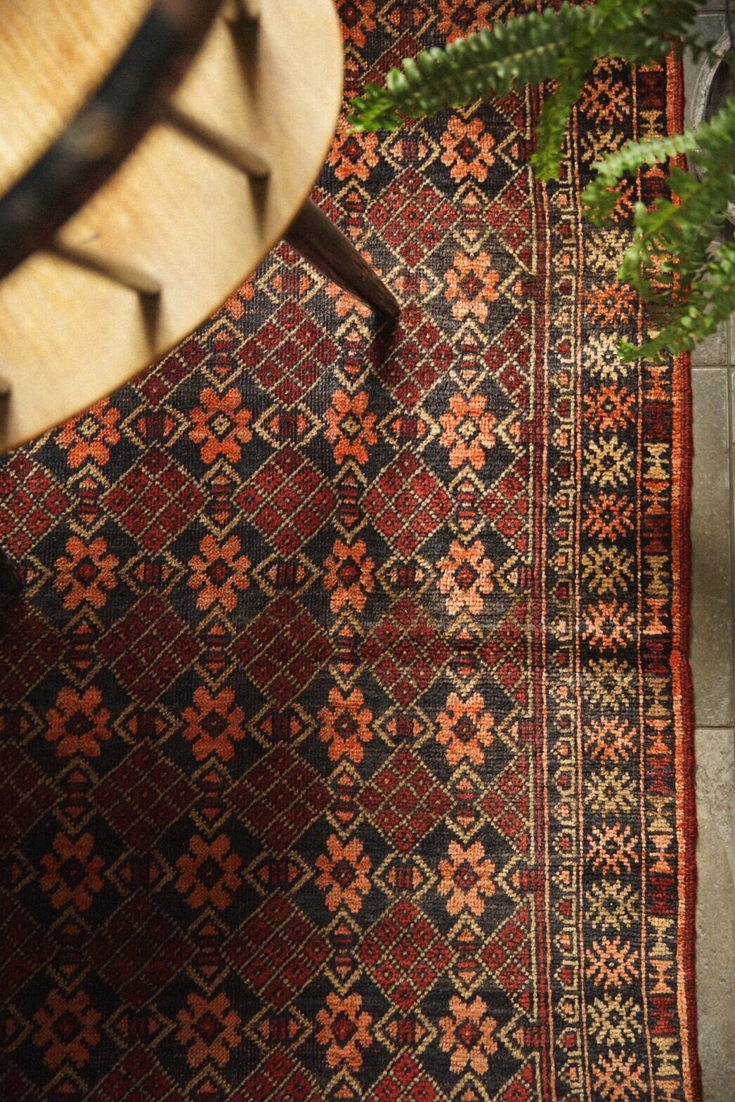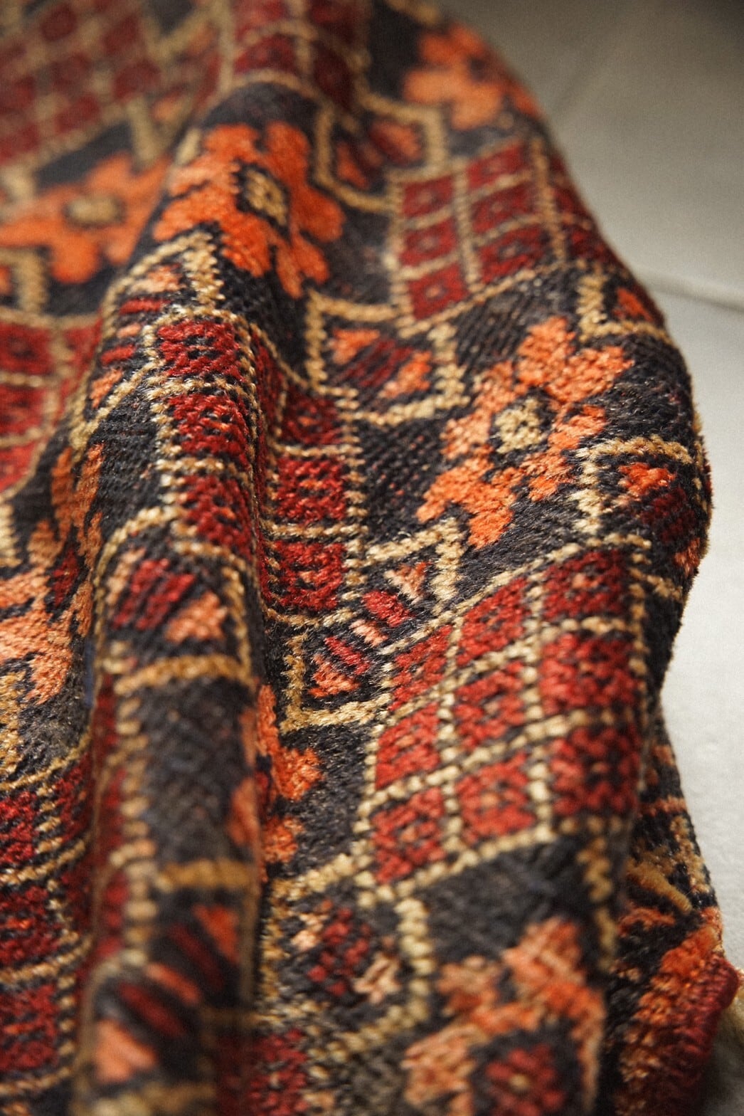 1960年代に織られたバルーチラグ。赤やオレンジ、アイボリーなどの暖色系ベースの色味が優しい雰囲気が魅力的な一枚。