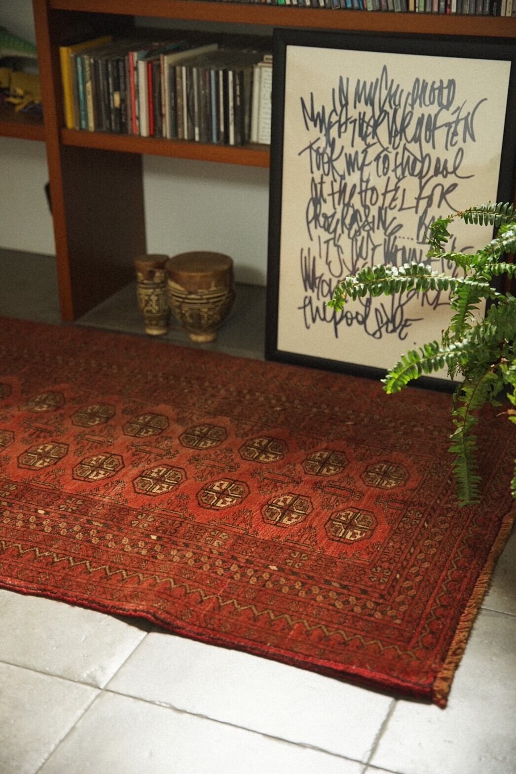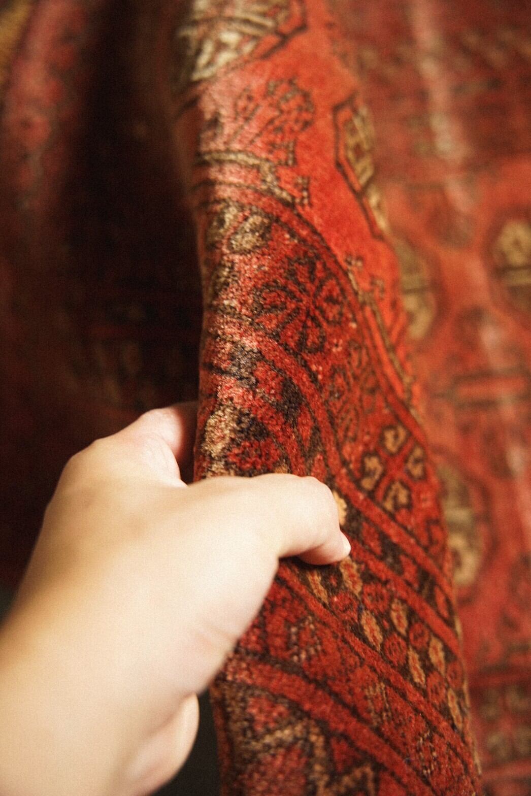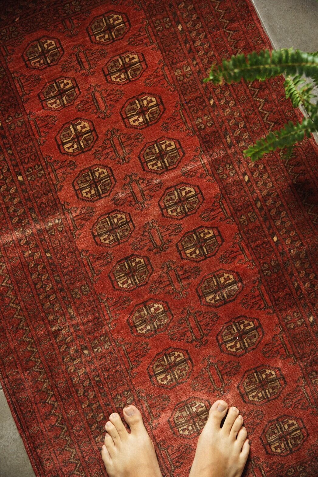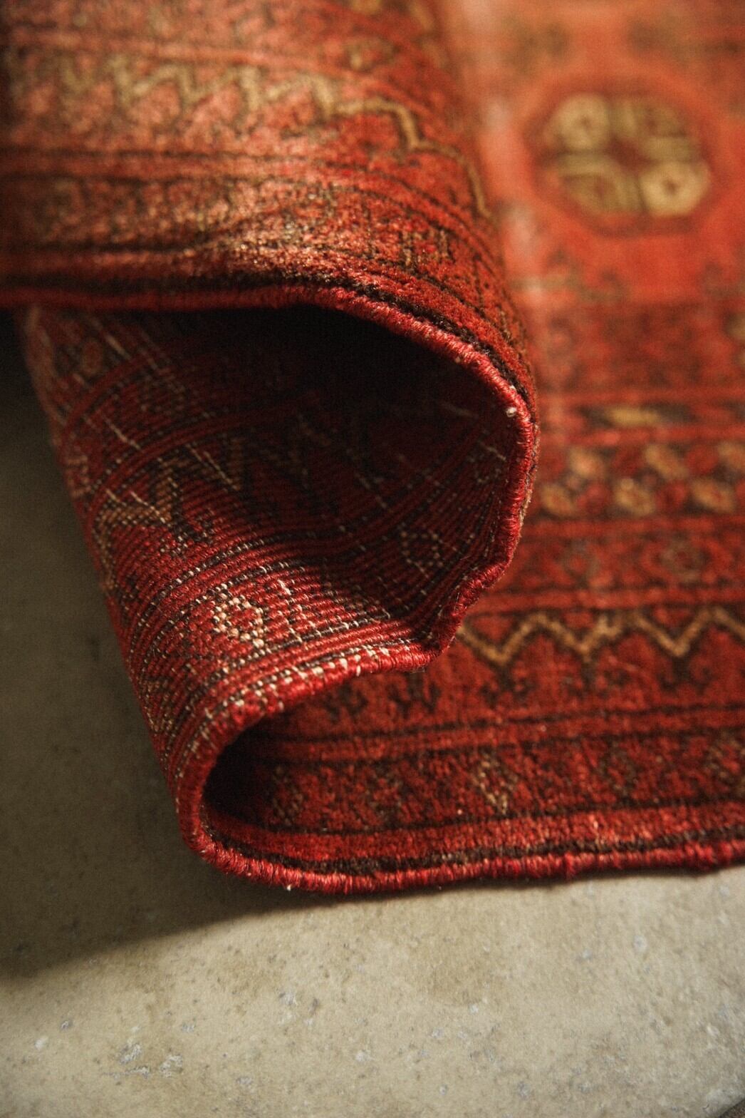 強い色味の赤に抵抗ある方におすすめの少しオレンジ寄りの優しい色味と雰囲気のトルクメンラグ。