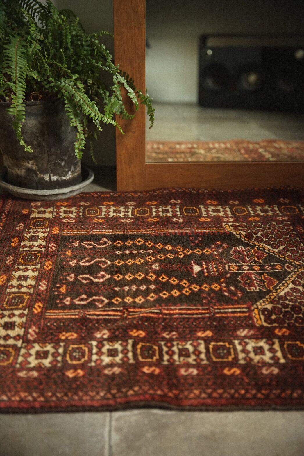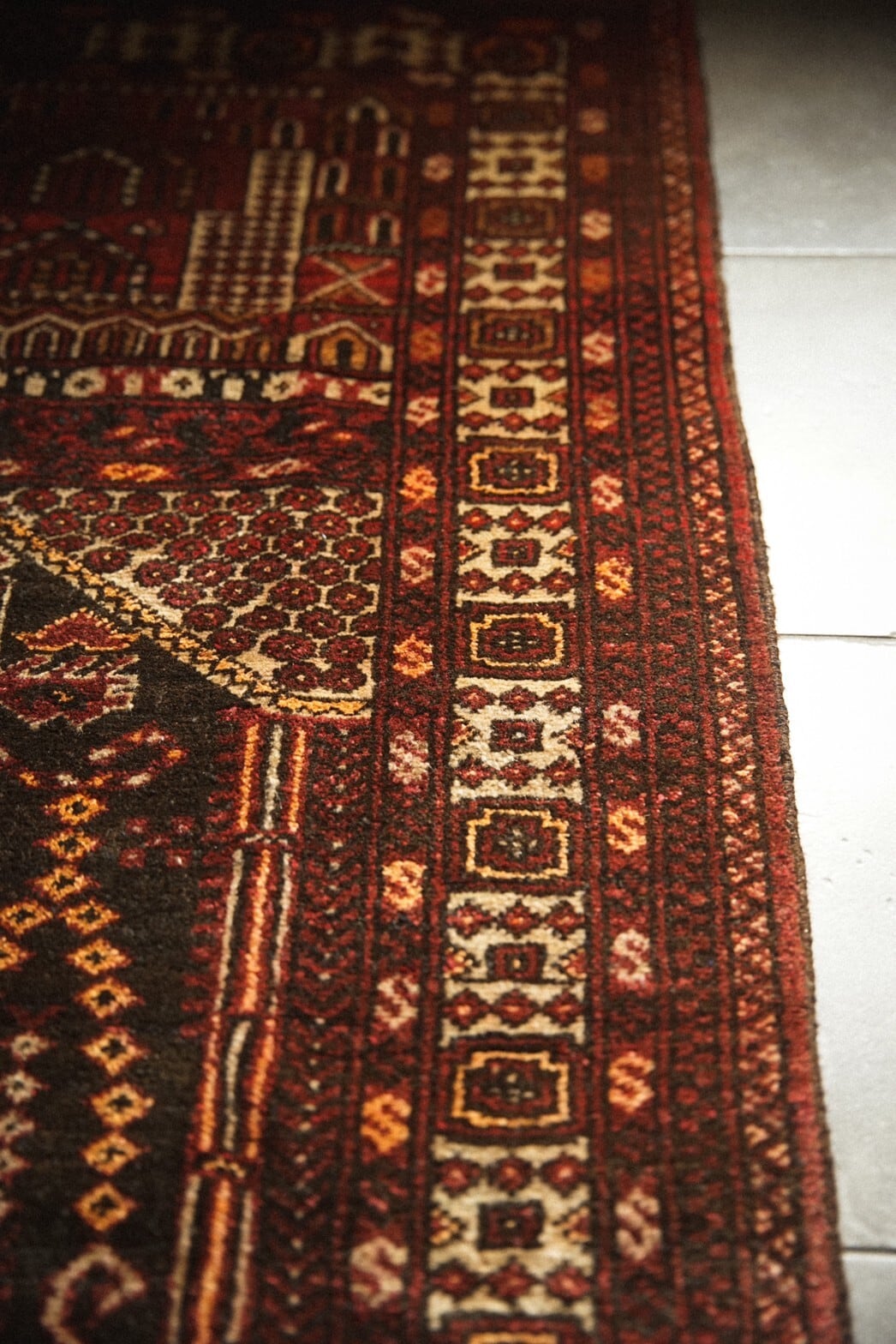 深い赤と細やかなデザインが美しいトルクメンのプレイヤーラグ。