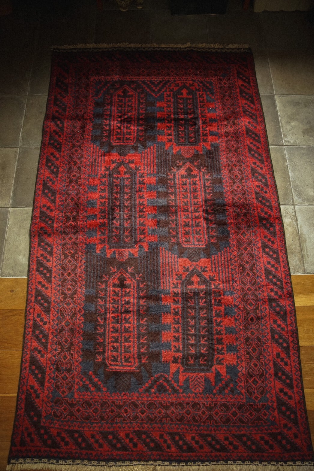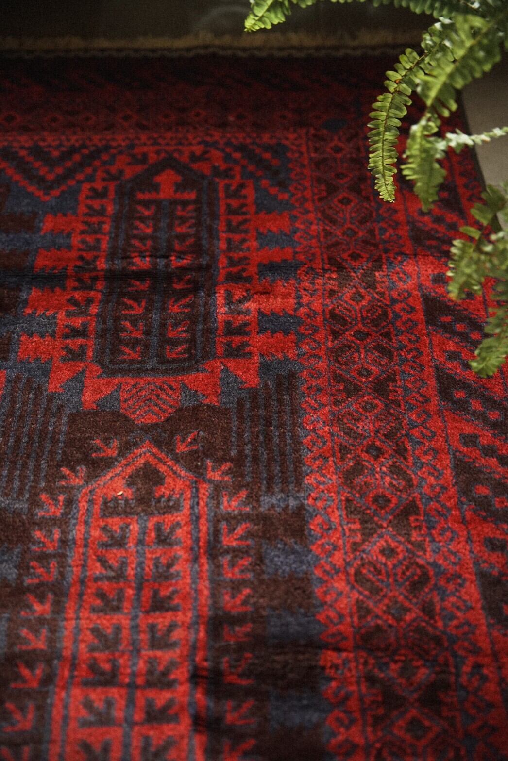 カラムドネと呼ばれる「ペン立て」を意味するモチーフが描かれたバルーチの定番デザインのラグ。