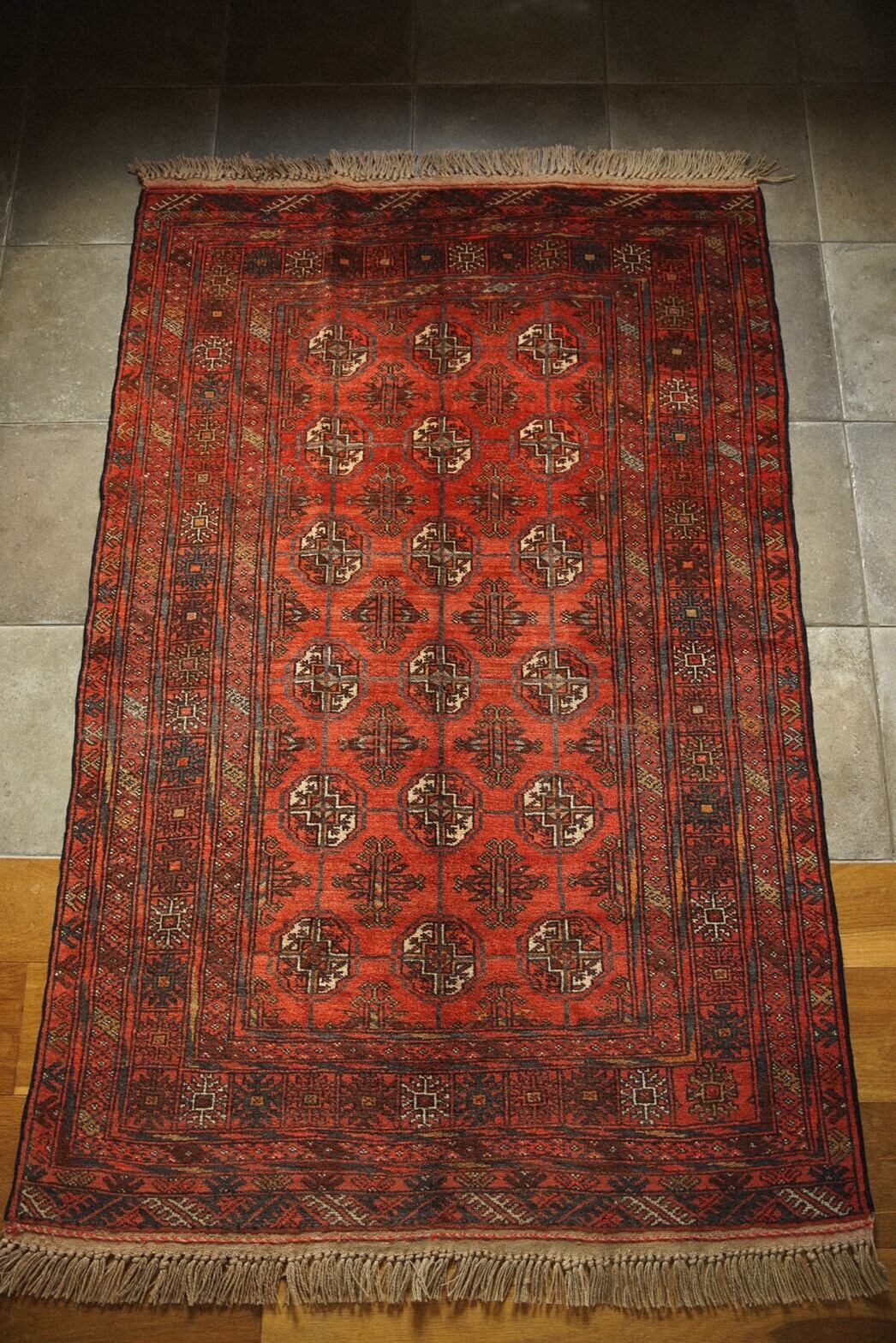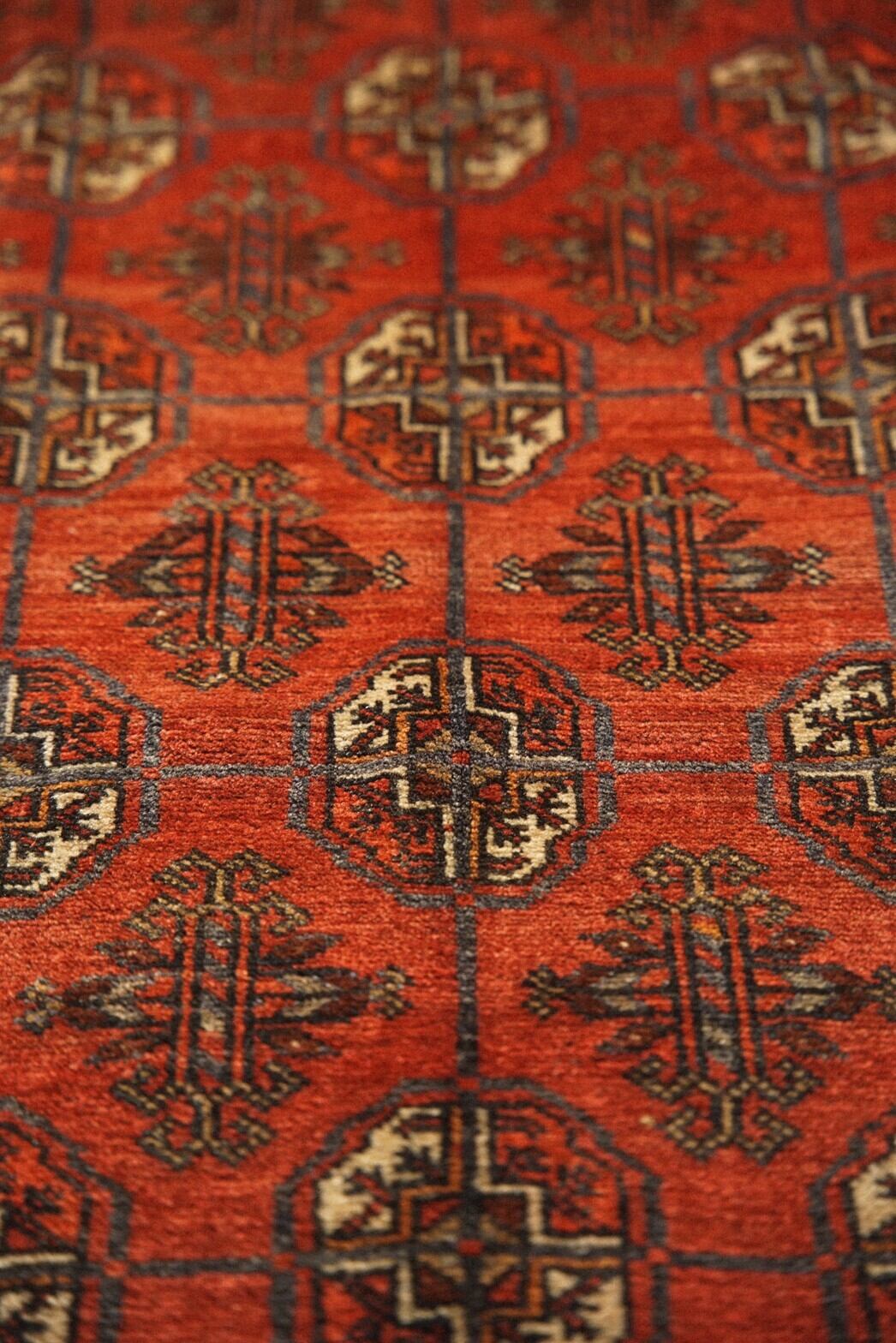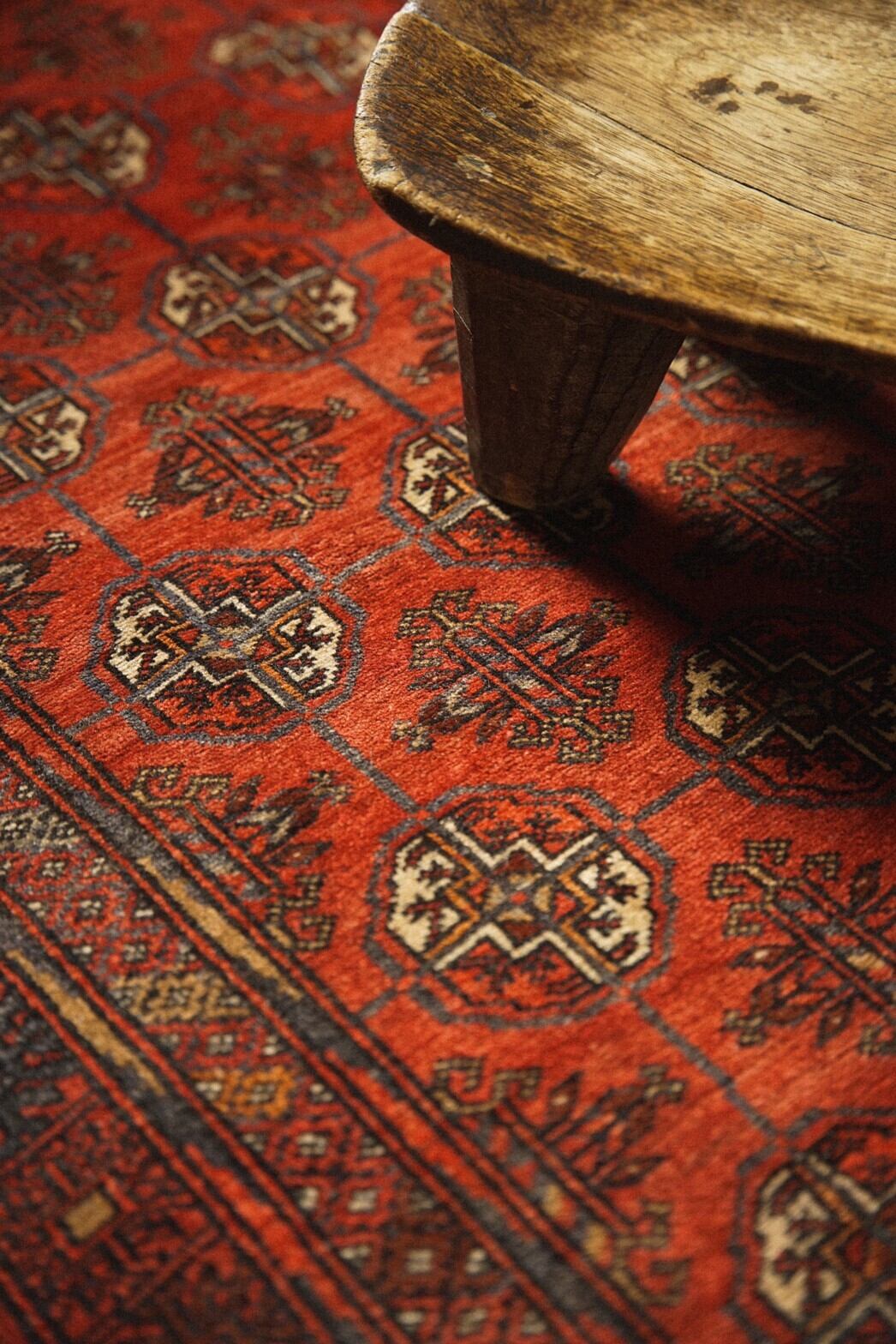 赤ベースにギュルが並ぶ定番デザインですが、ボーダー部分がカラフルに彩られた珍しい一枚。全体が馴染んだ味わい深い色味での色構成のため、派手すぎず少しの遊び心が楽しいデザインになっております。