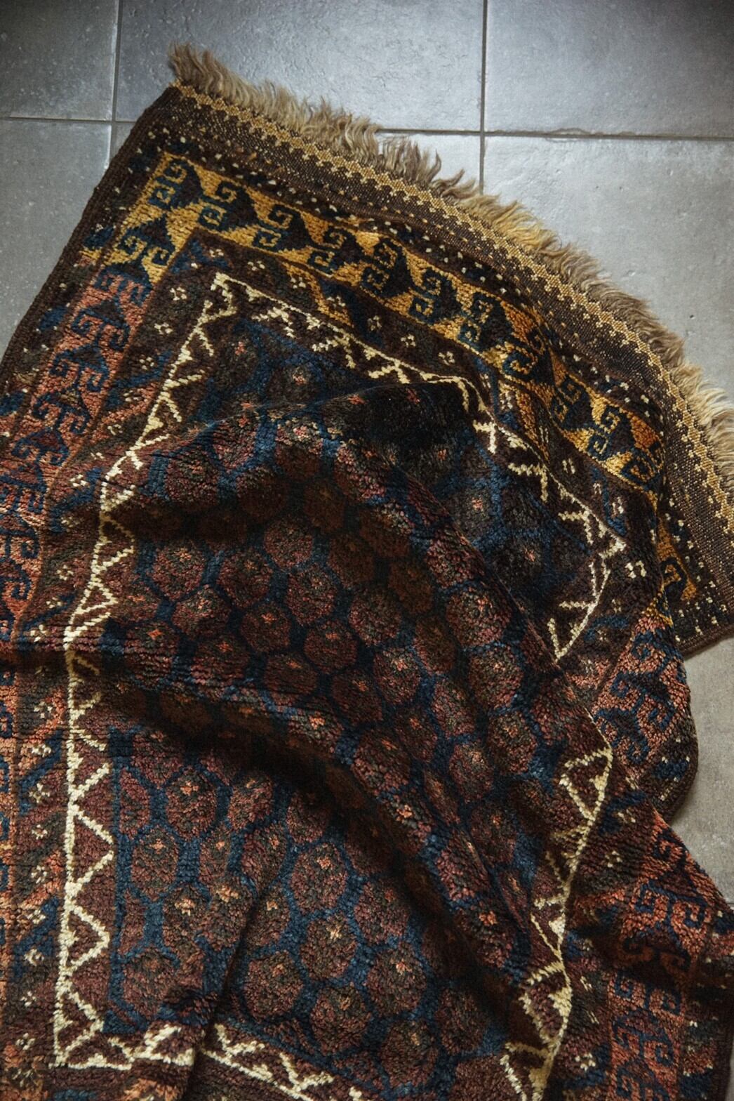 120年以上前のアンティークバルーチラグ。Dokhtare qazi (裁判官の娘)と呼ばれるデザインですが、ミフラーブが描かれていない珍しいタイプのデザイン。