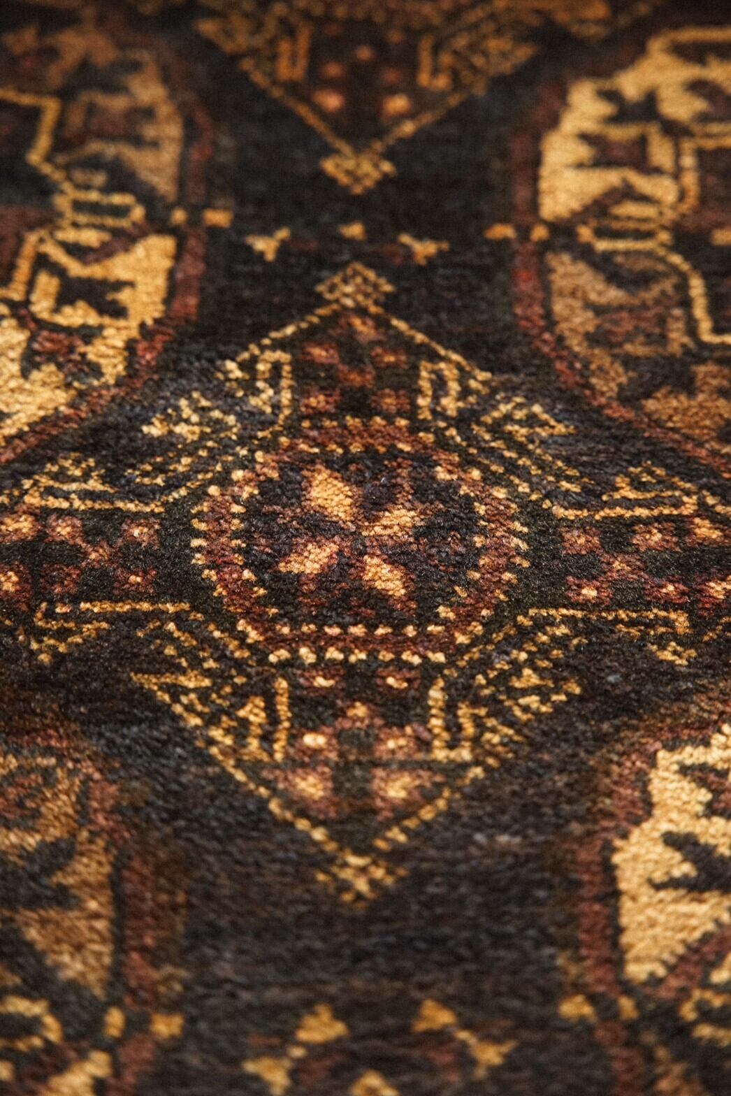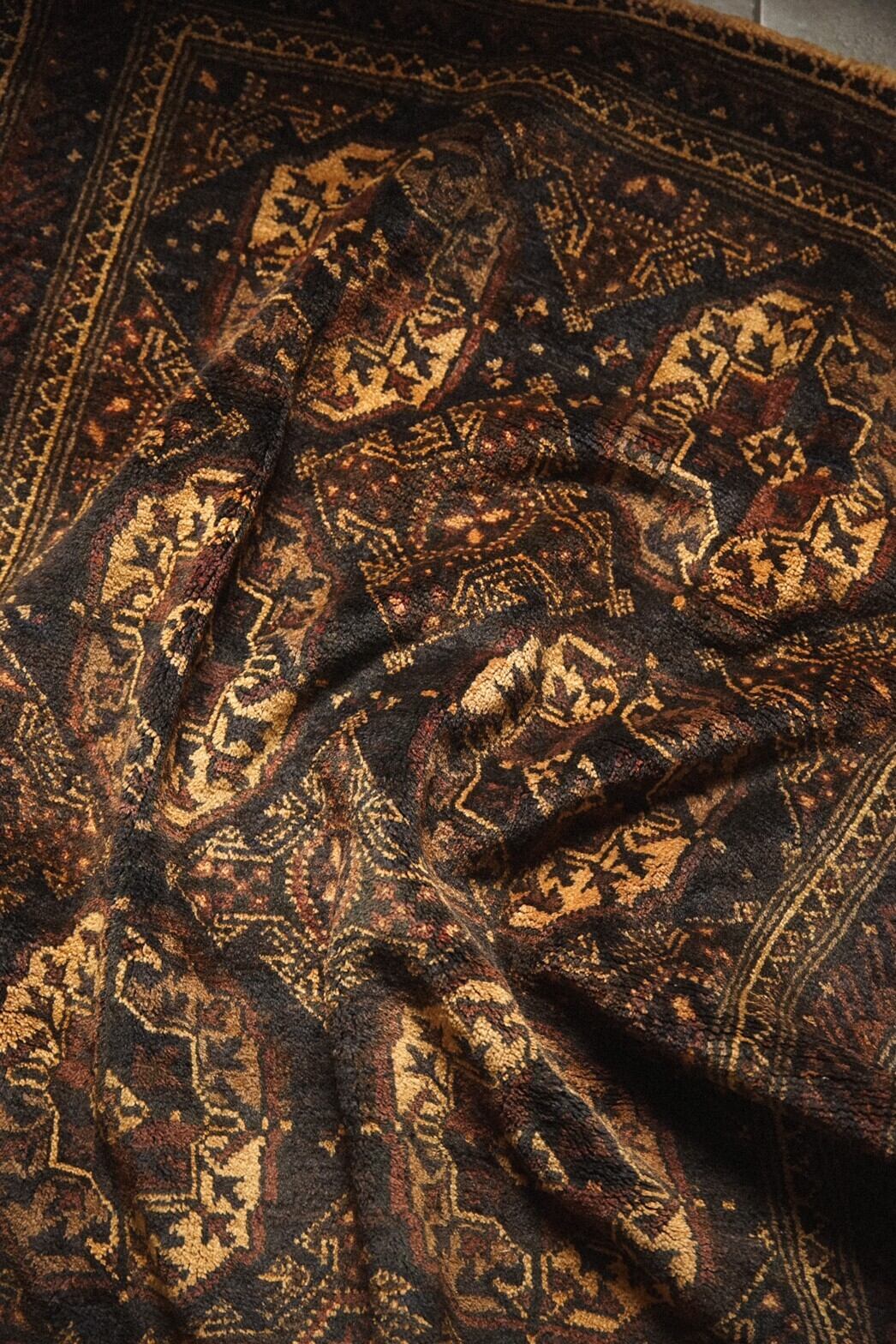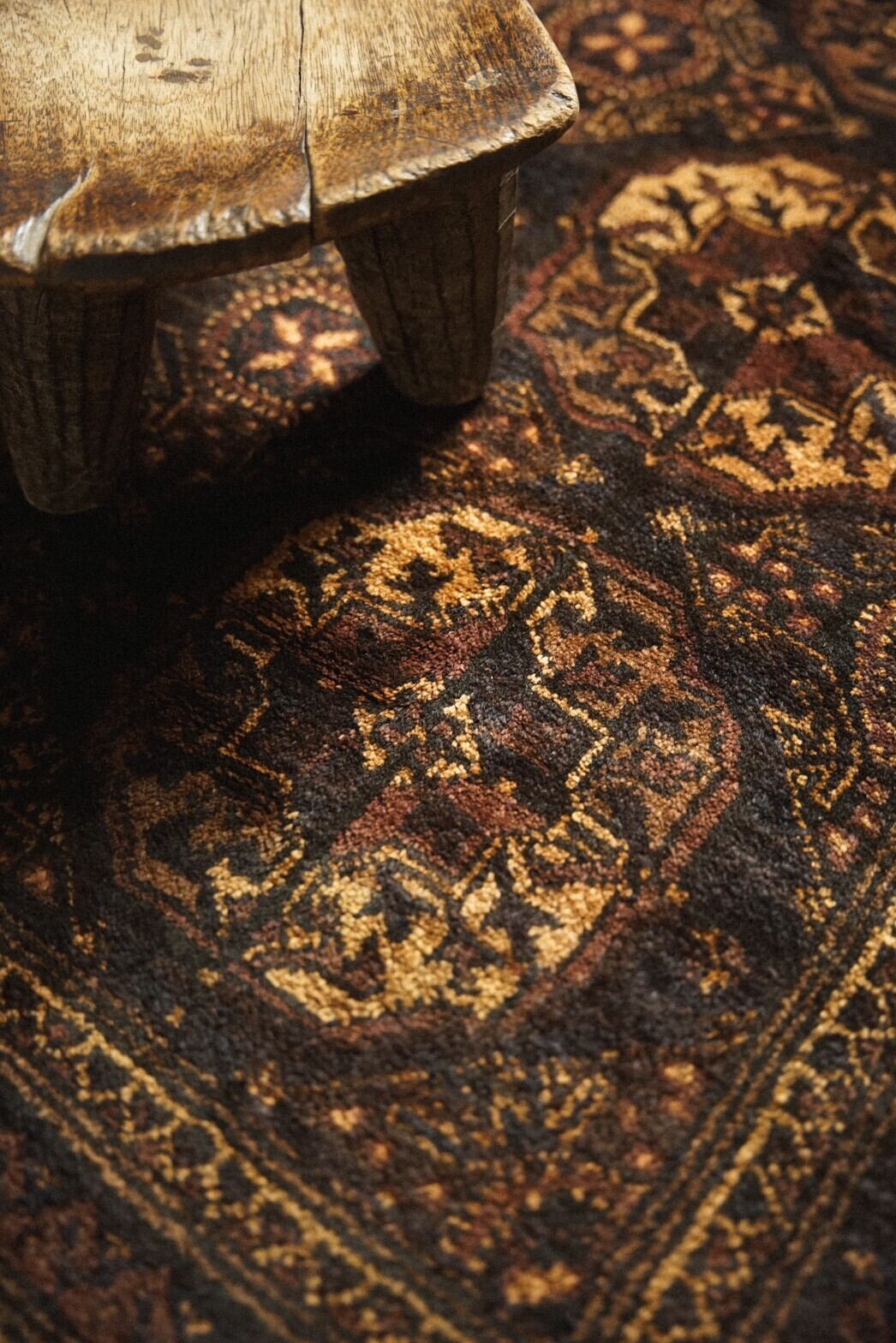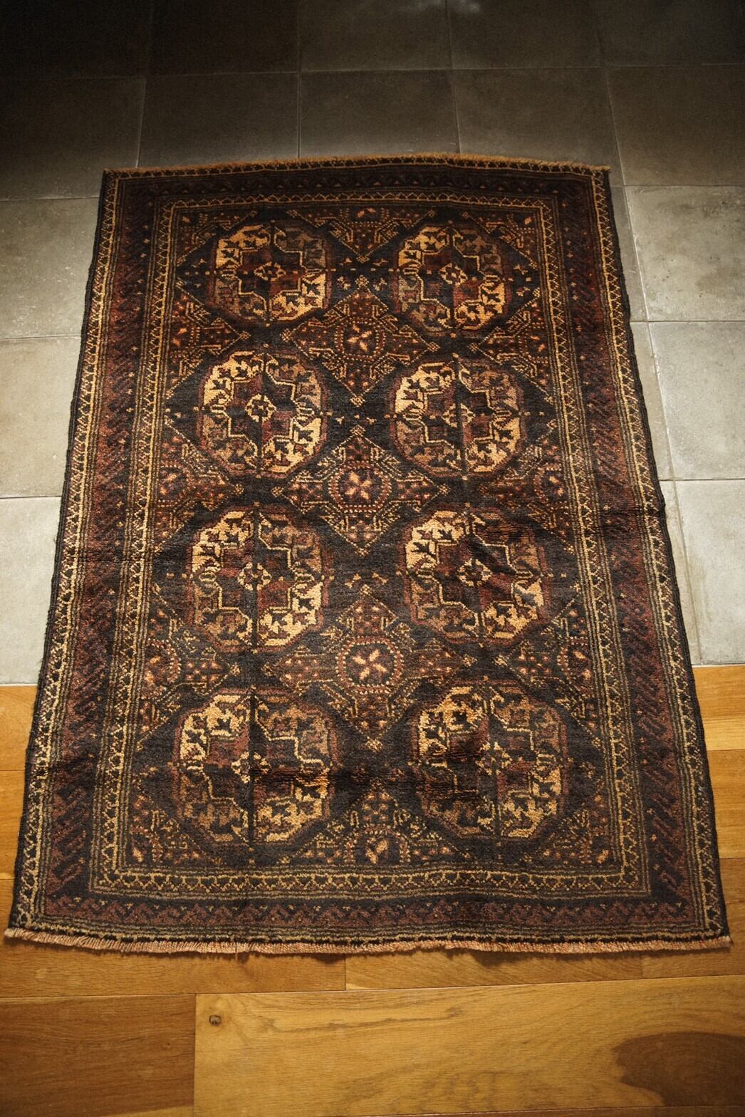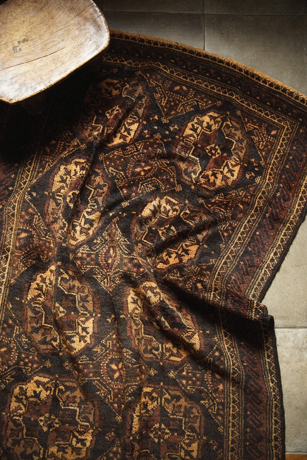 トルクメンラグに似たギュルがたくさん並んだデザインのクラシカルな雰囲気のバルーチラグ。ブラウン、ベージュ、キャメル、ネイビーなどのシックな色合いが渋くてとてもかっこいいです。