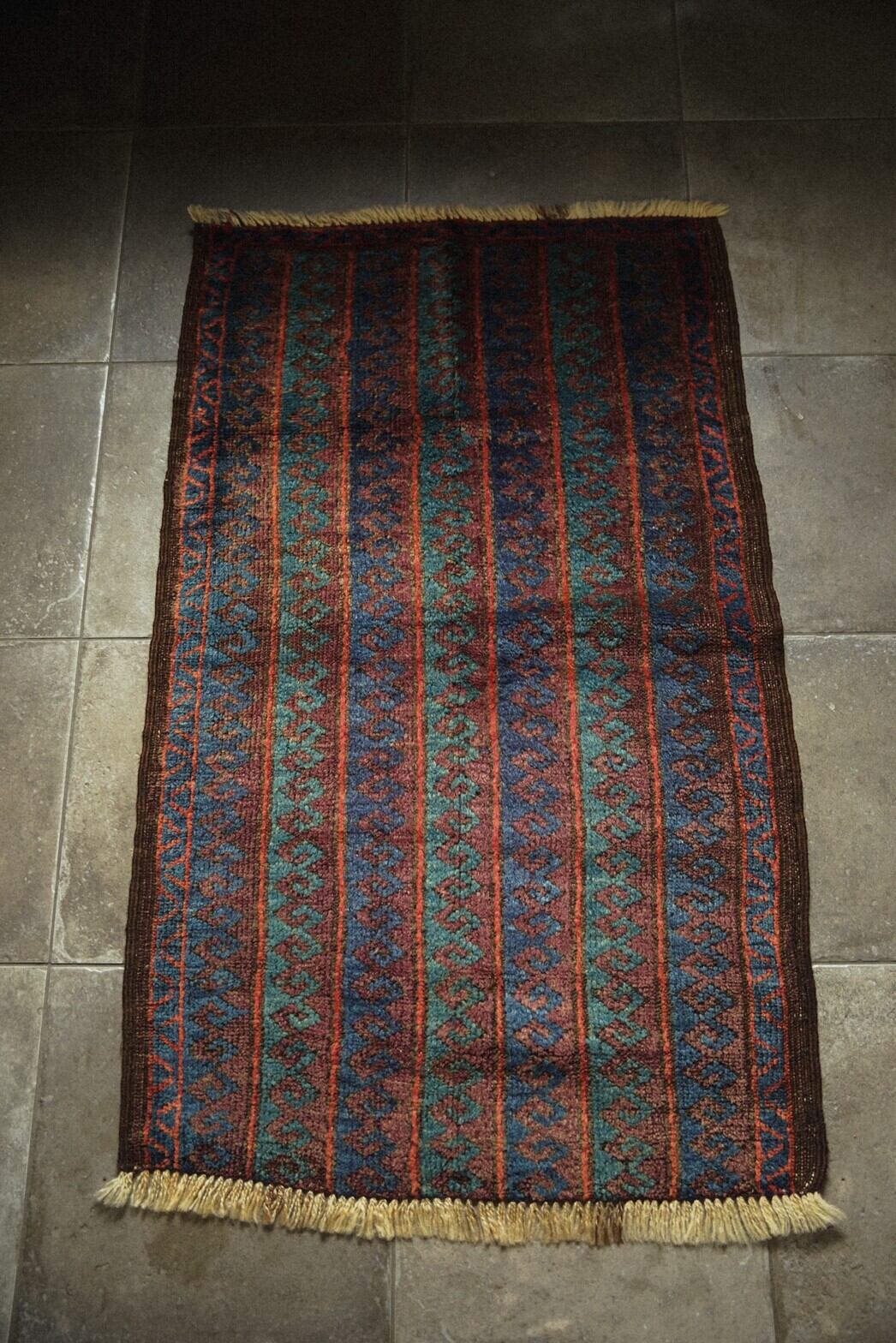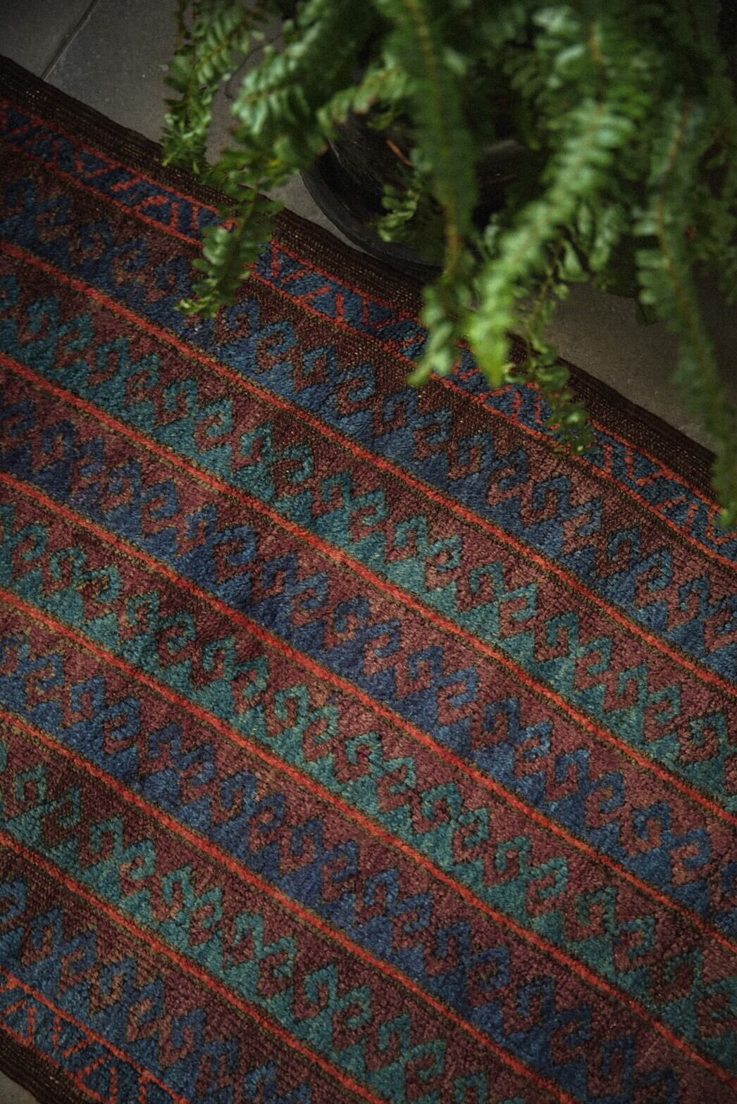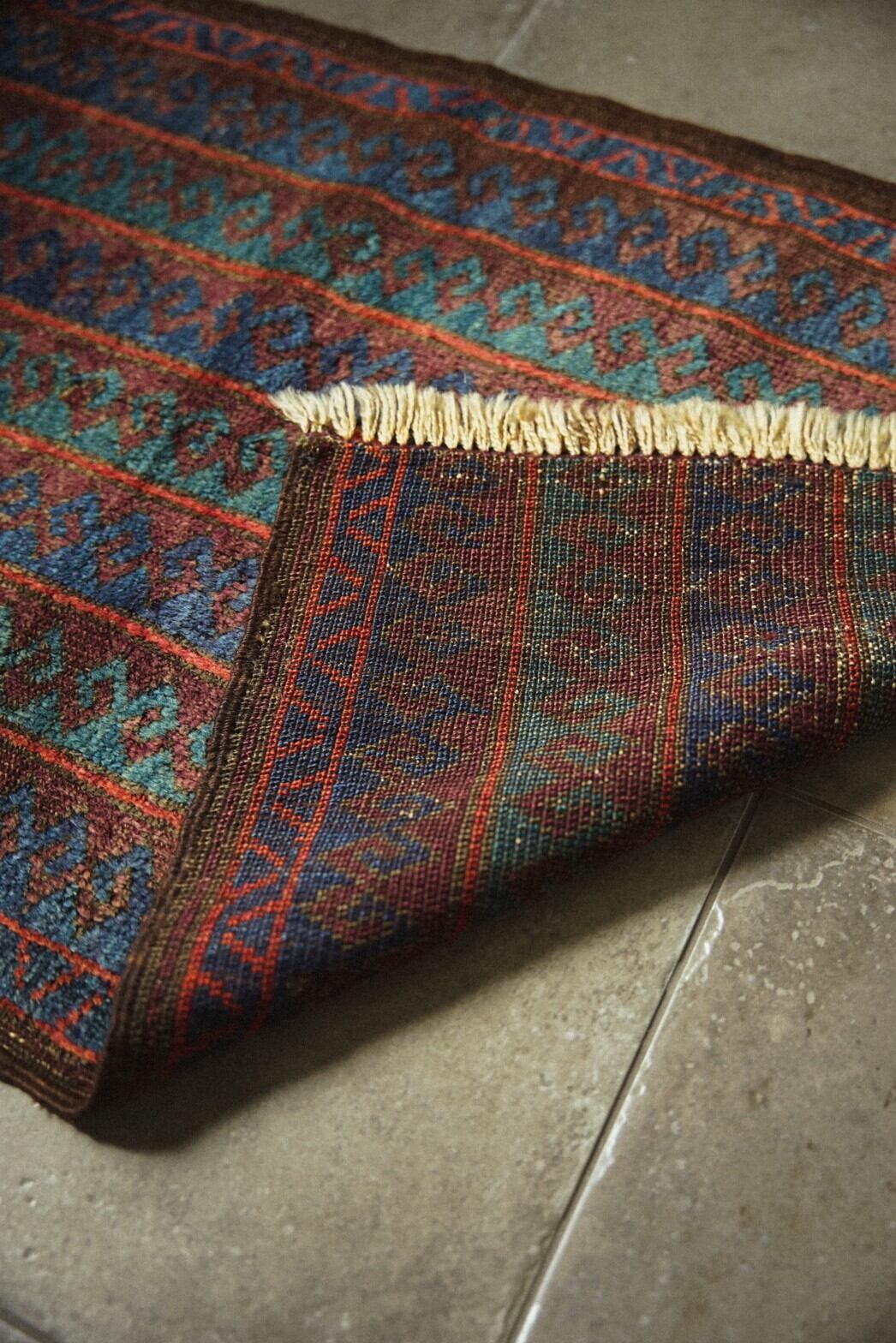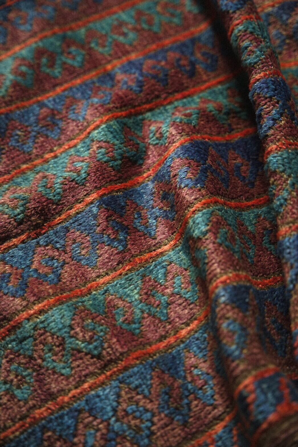 ブラウンに近いくすんだ色味のパープルベースにブルーとグリーンの組み合わせが美しい一枚。フィールドは雄羊の角文様が並びます。