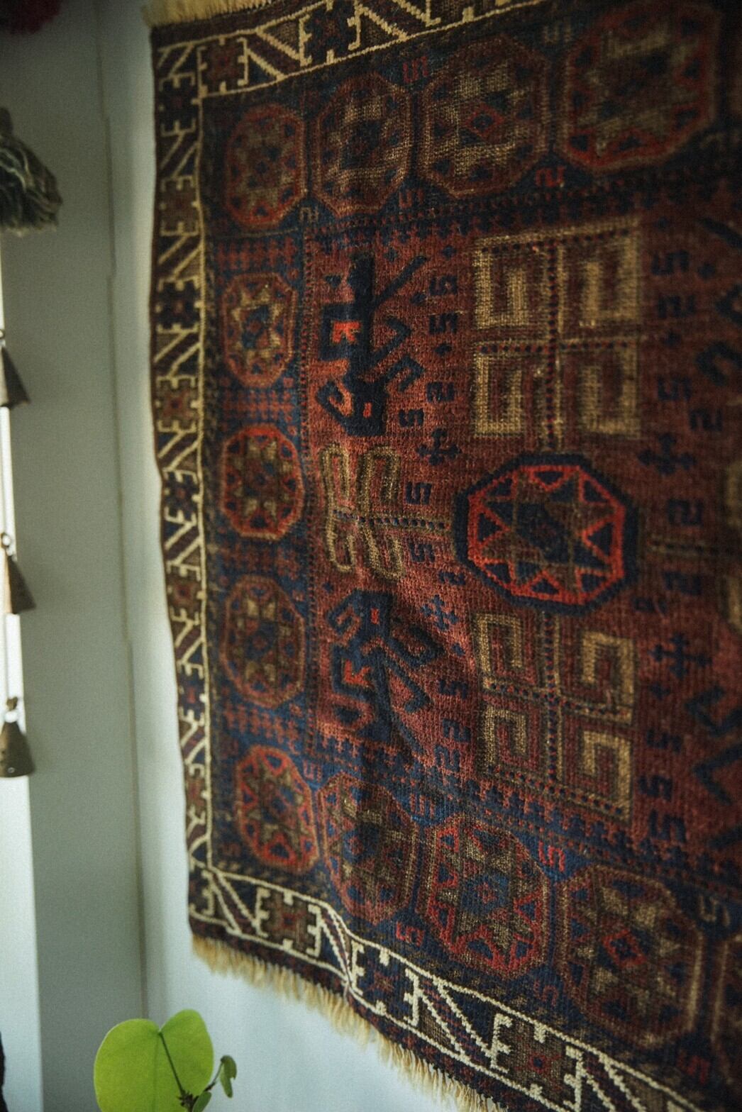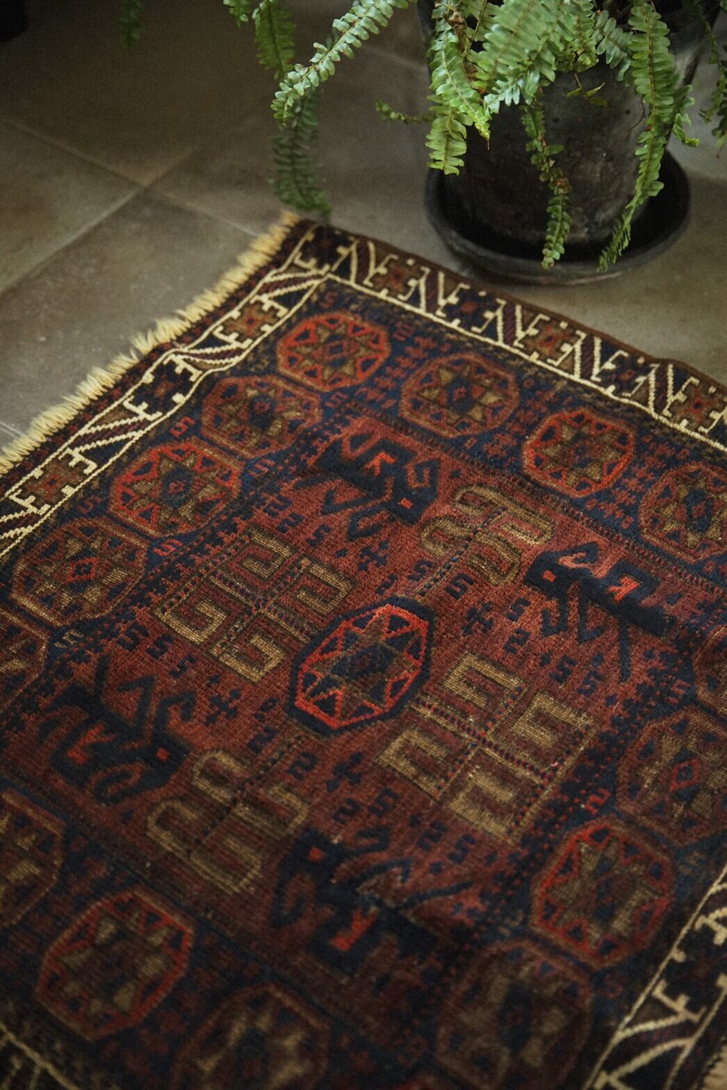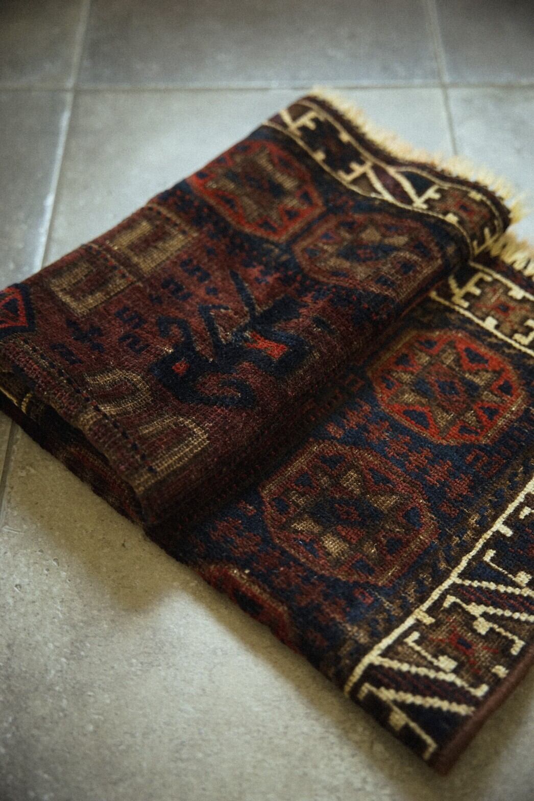 100年以上前に織られたバルーチ族によるサドルバッグのバッグフェイスをミニラグに仕立ててもらいました。