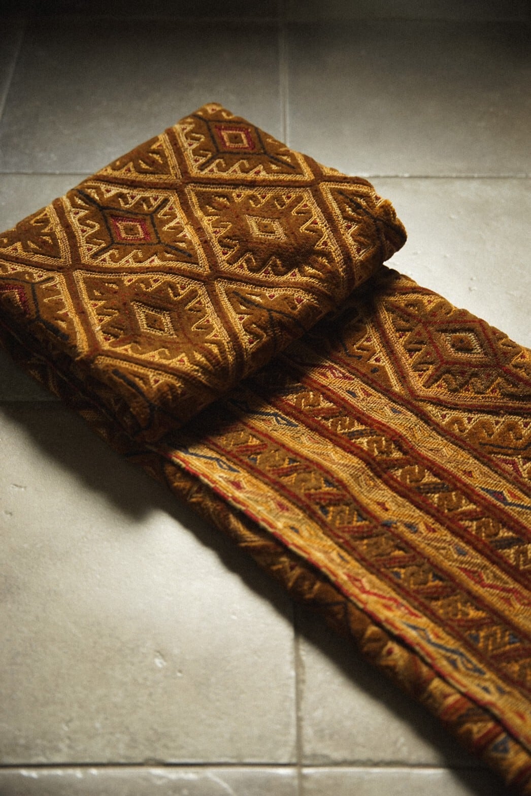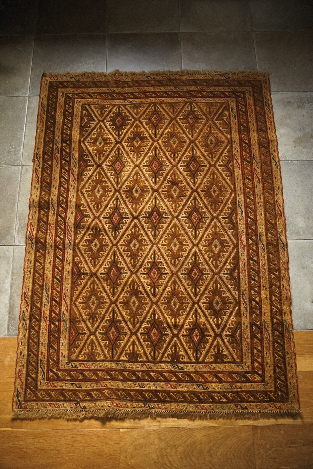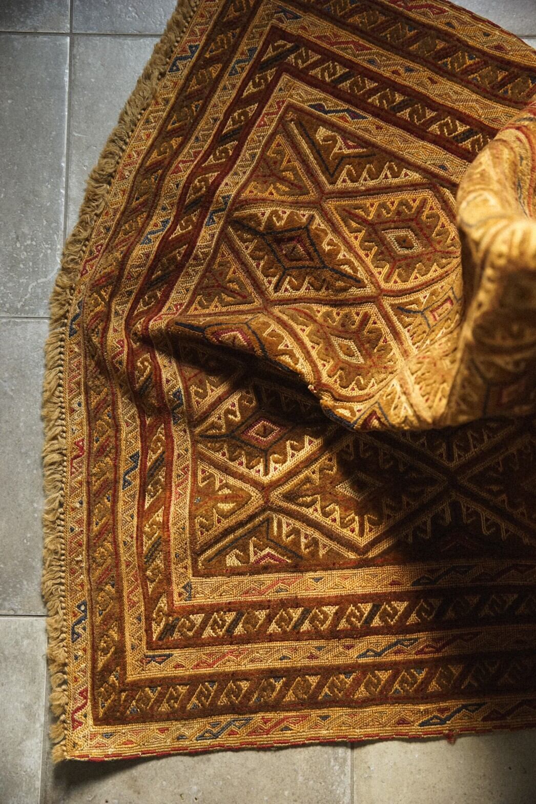 平織りとパイル織りの組み合わせで、技術のいる織りのマシュワニラグ。