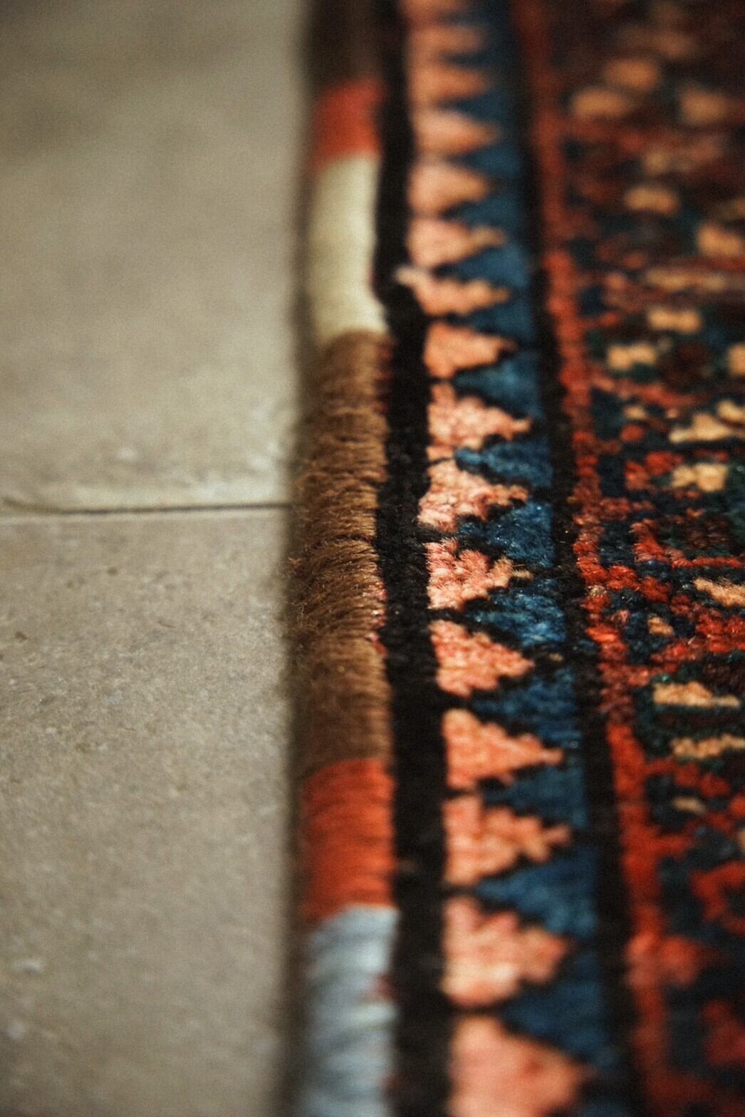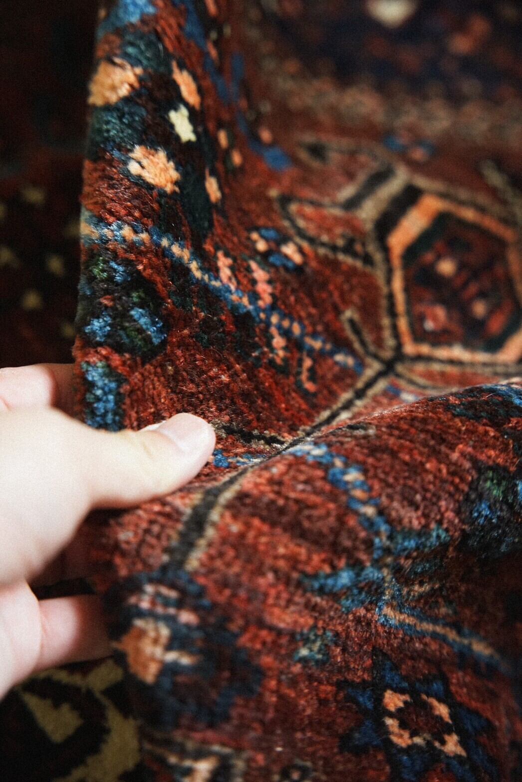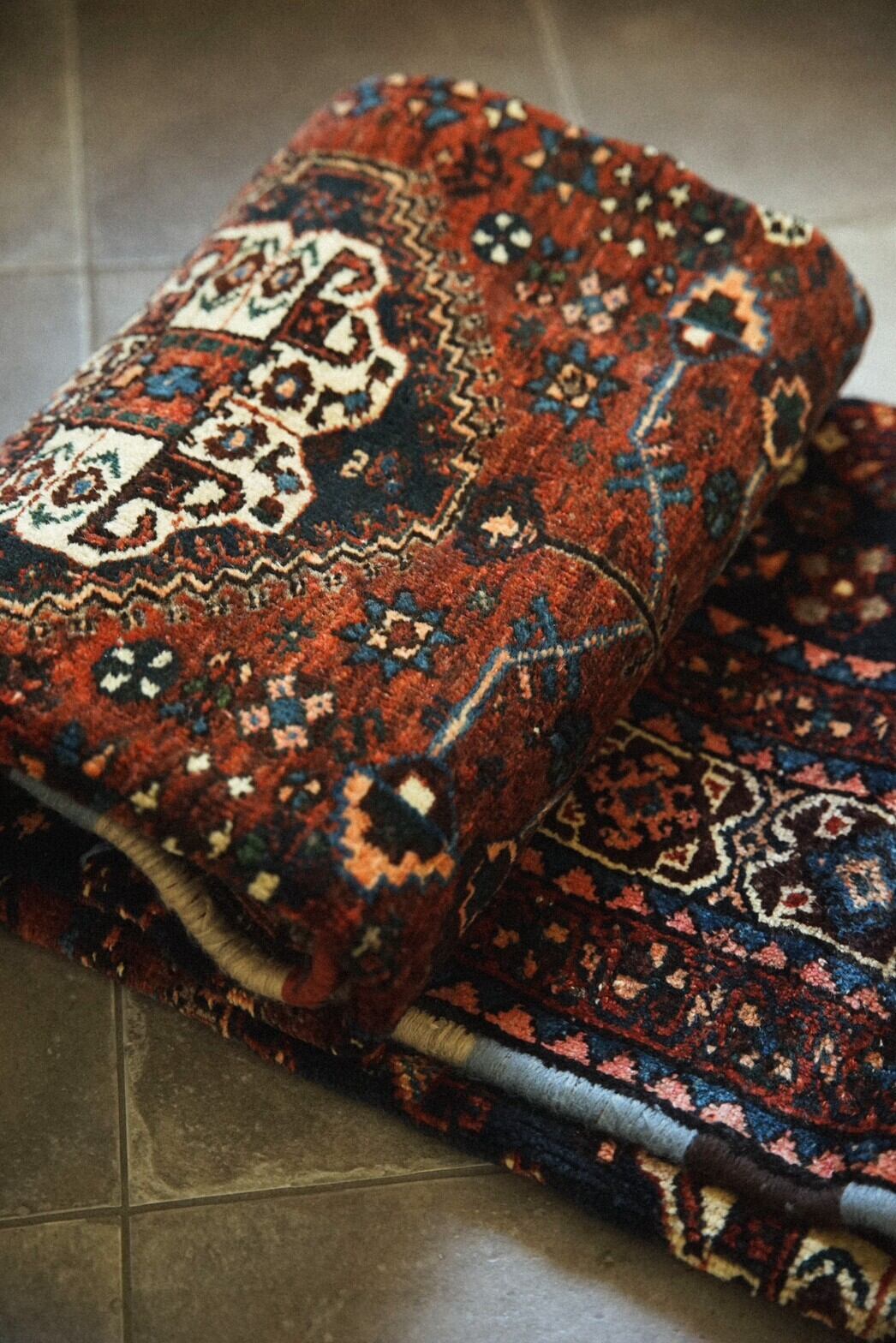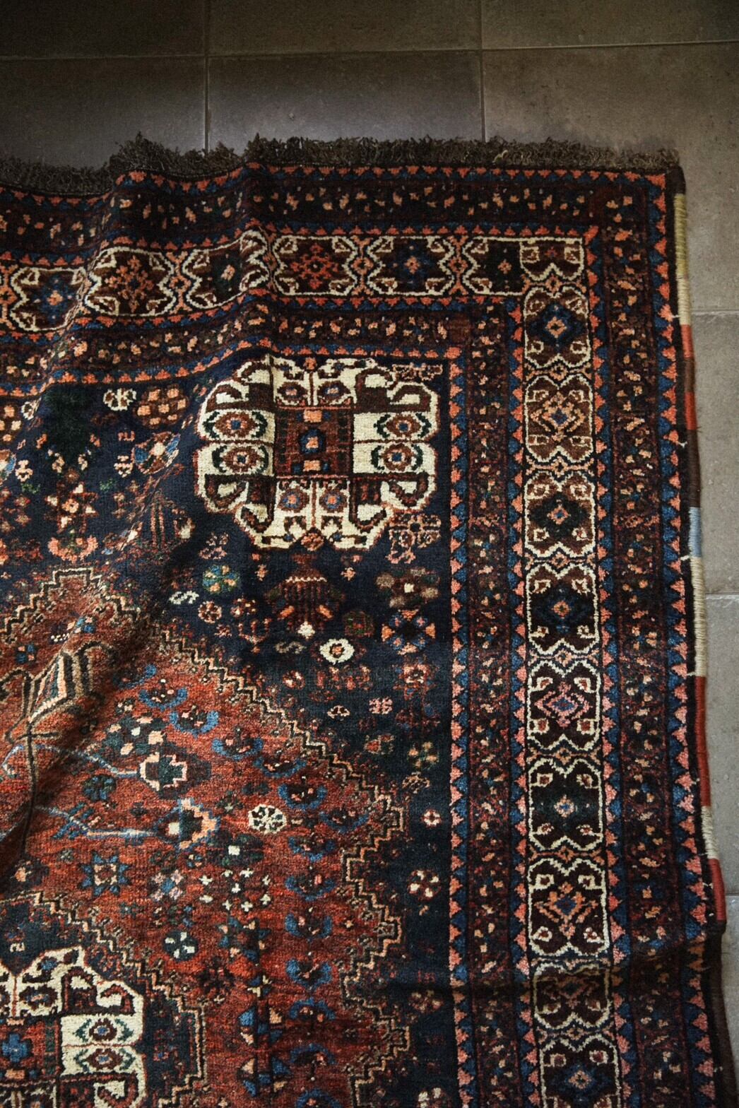 経年により深みの増した茜色のフィールドとコーナー部分の漆黒に浮かび上がる可愛らしい花があしらわれたカシュガイメダリオン。
