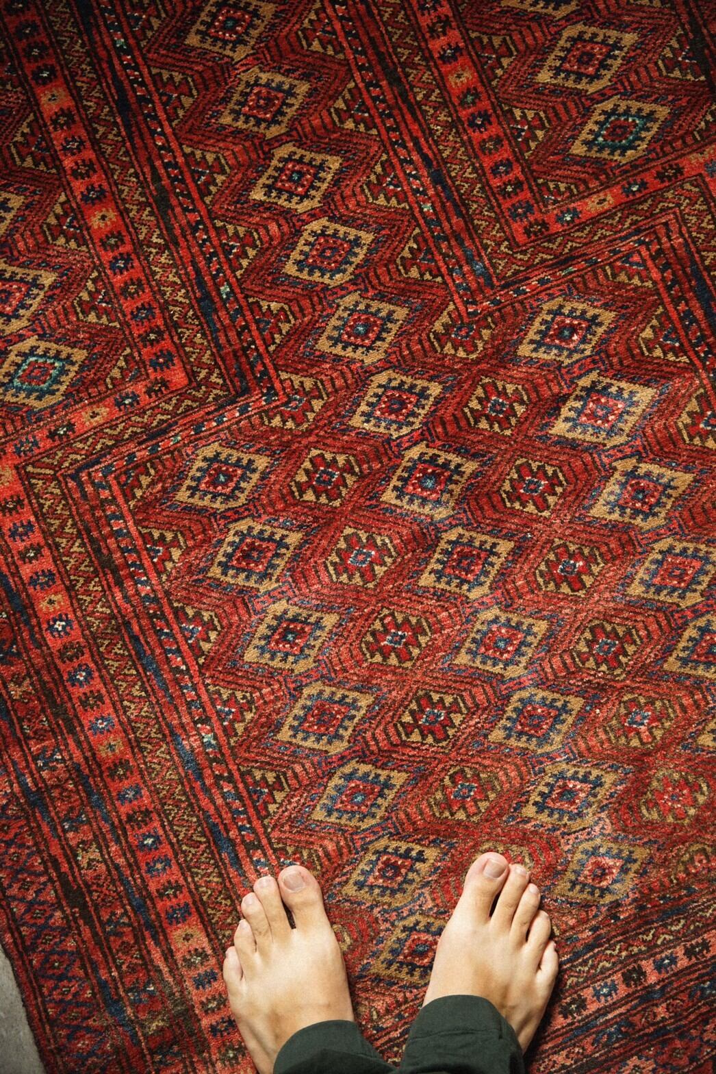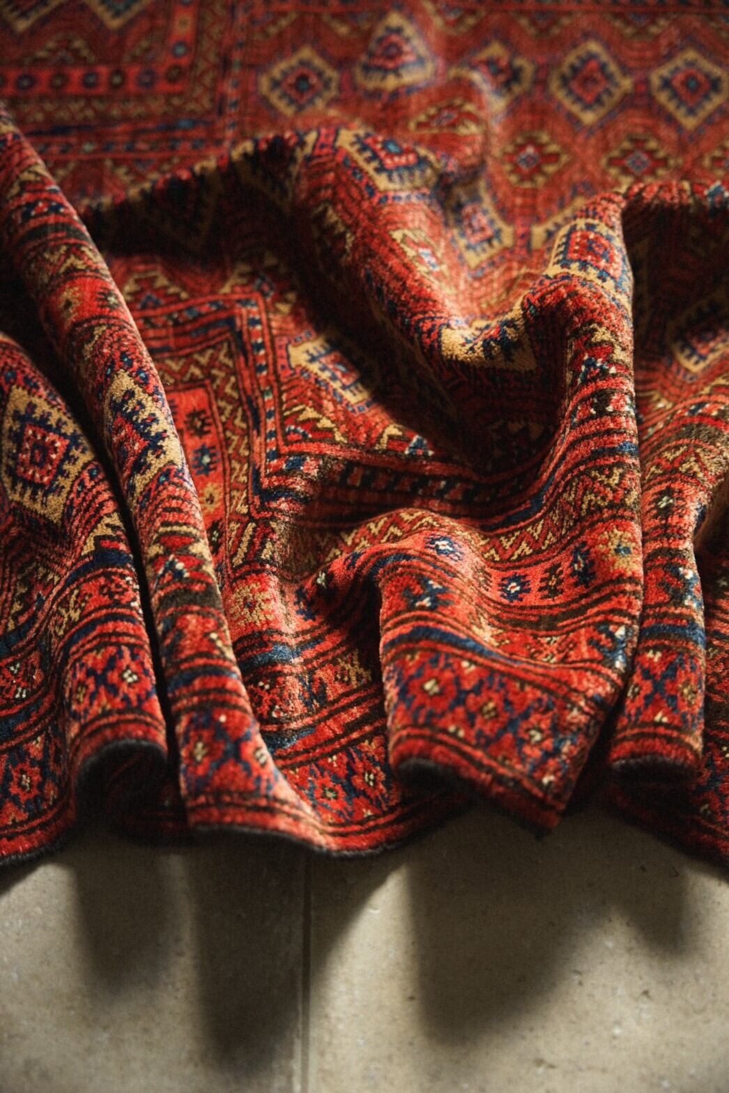 レッド×ベージュの組み合わせと細かい紋様が美しいトルクメンラグ。