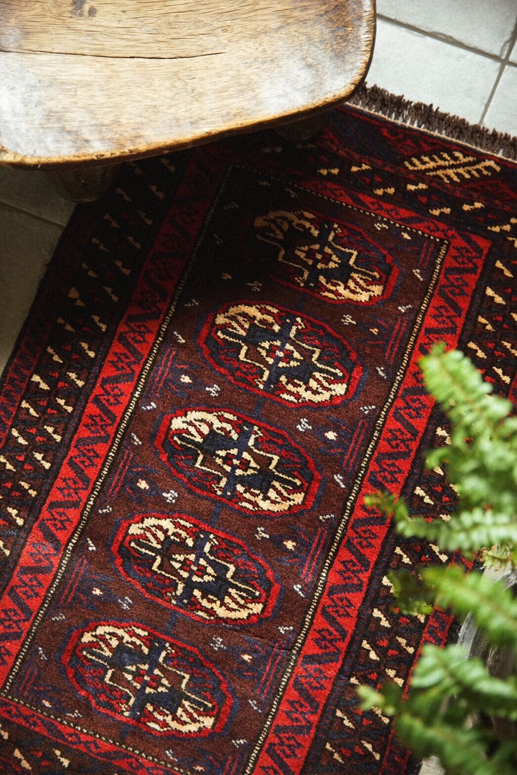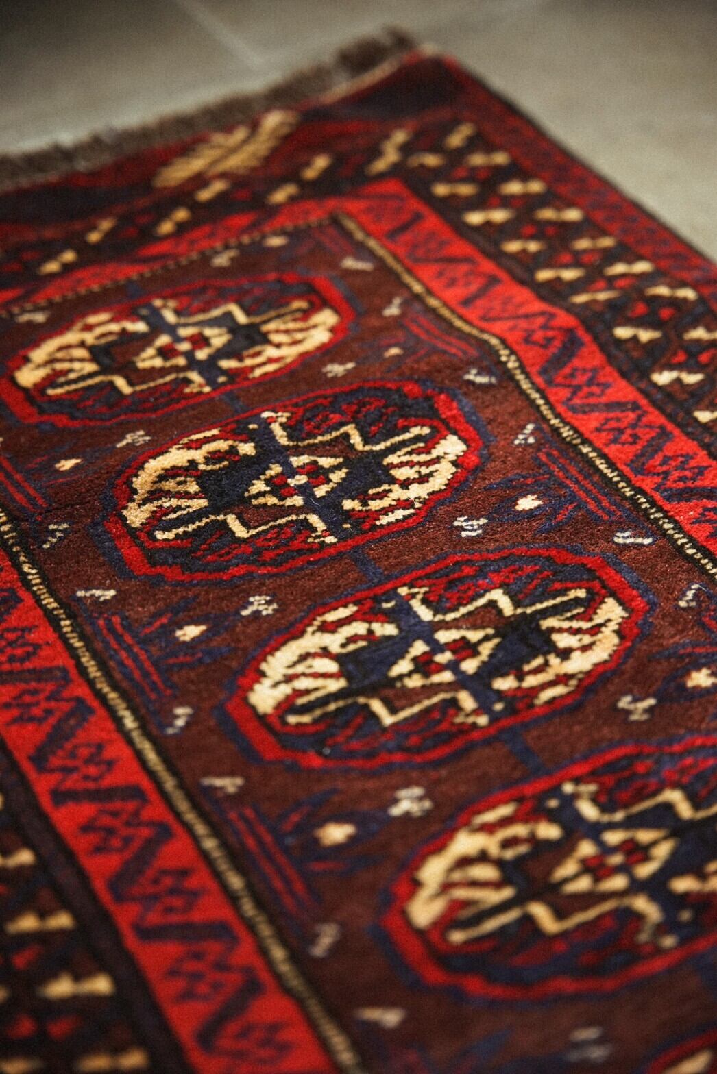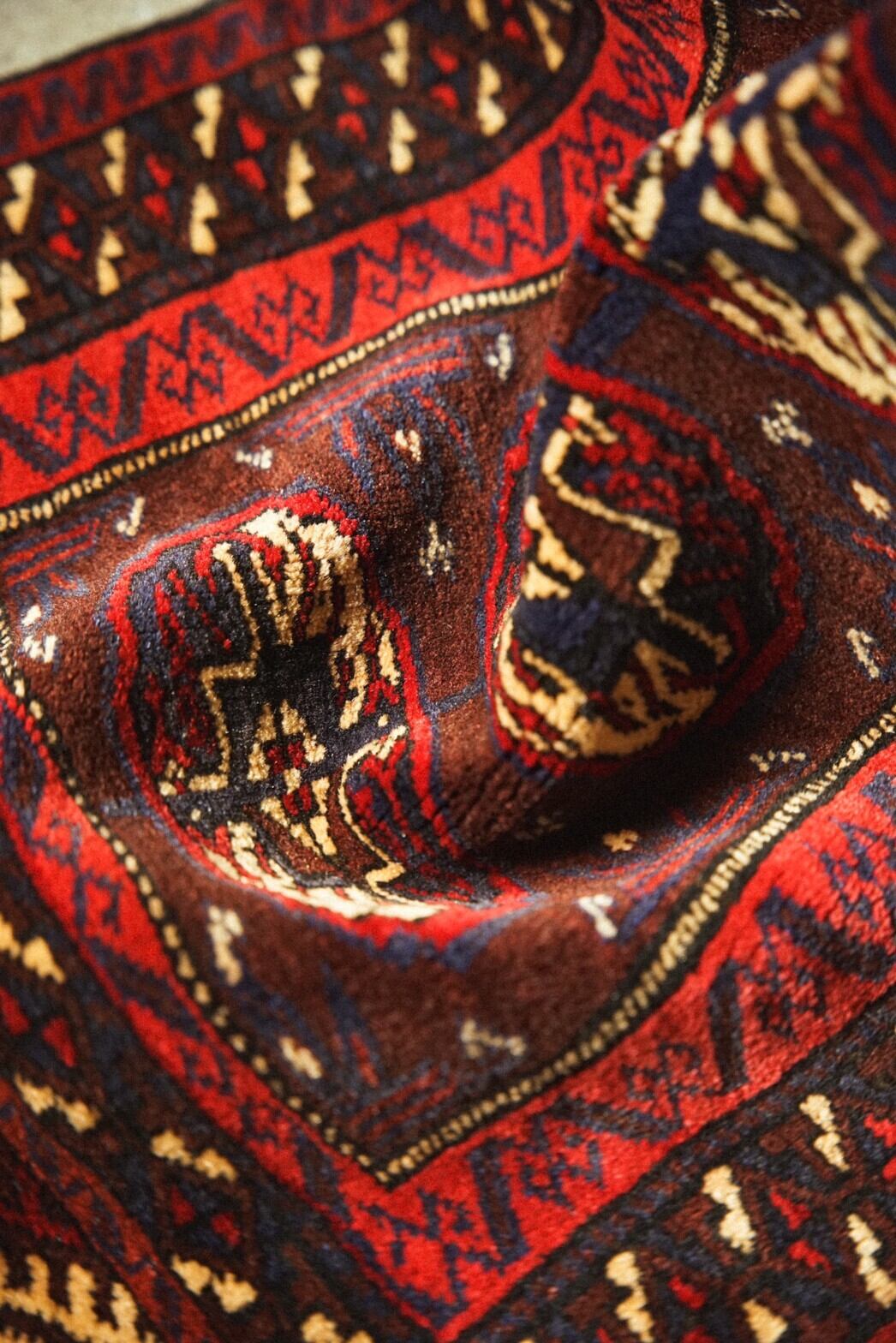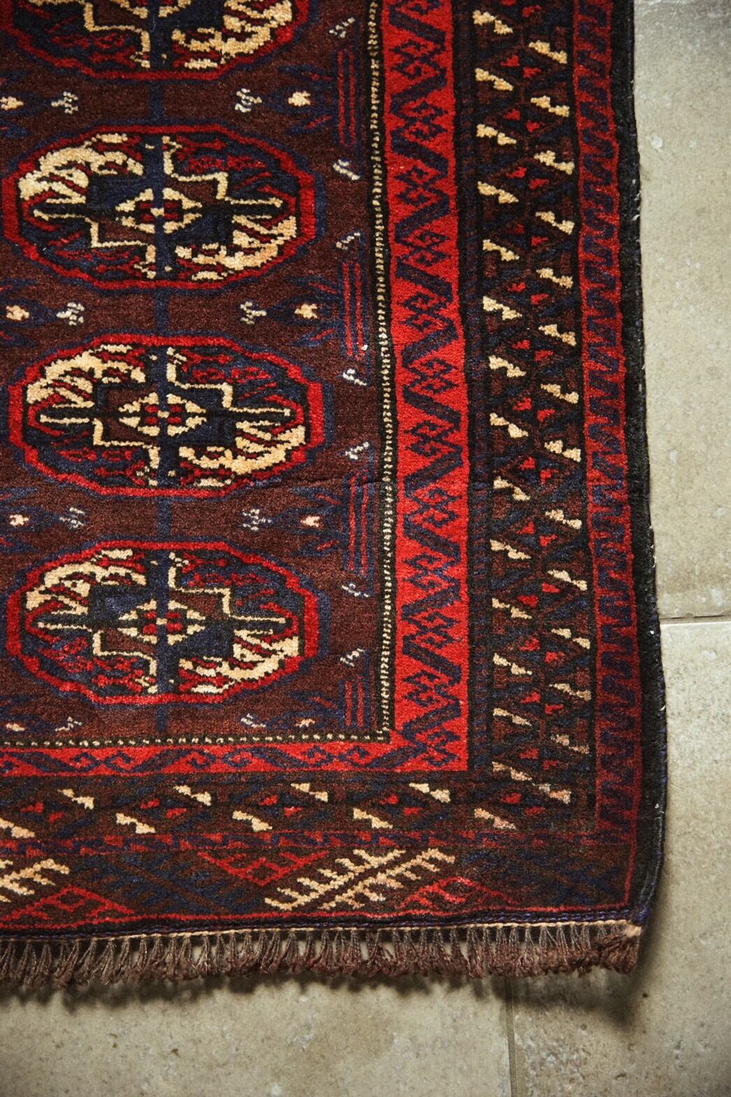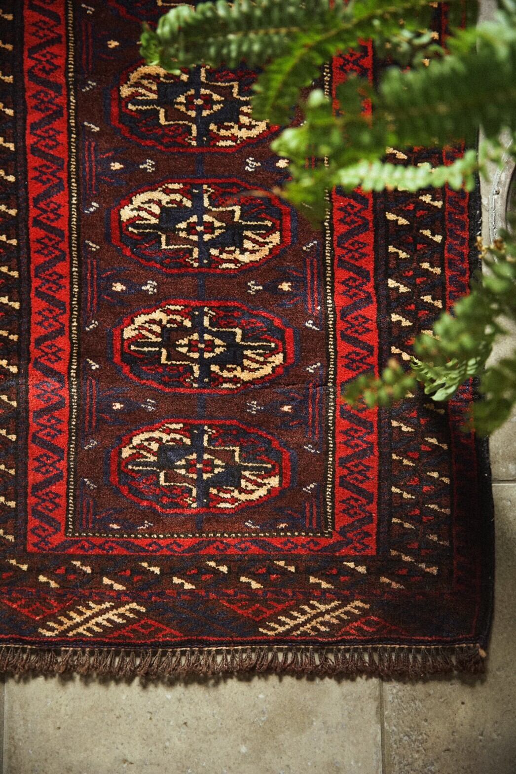 シックなボルドー系の深い色味で構成されたギュルが並ぶデザインのアフガン産トルクメンラグ。