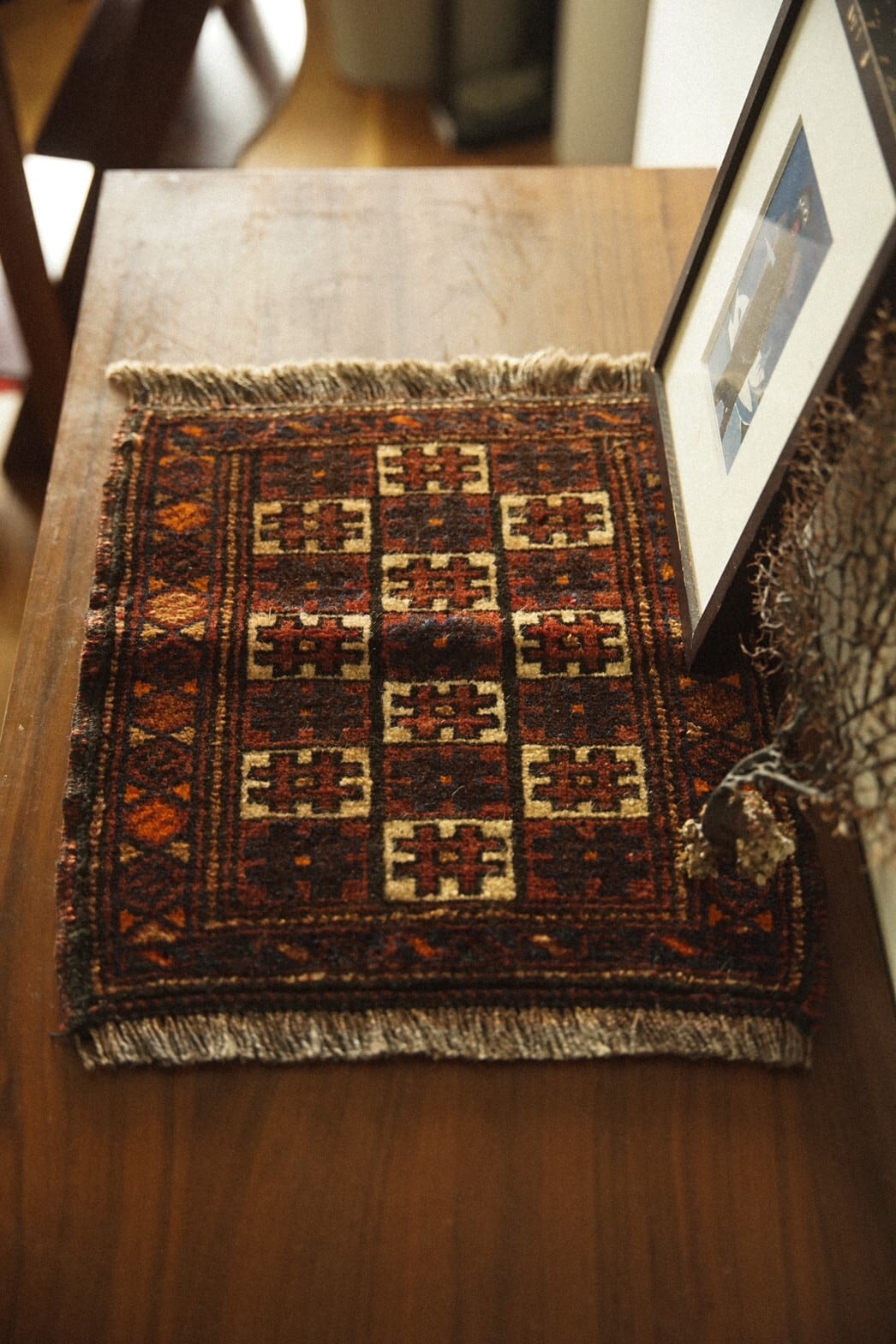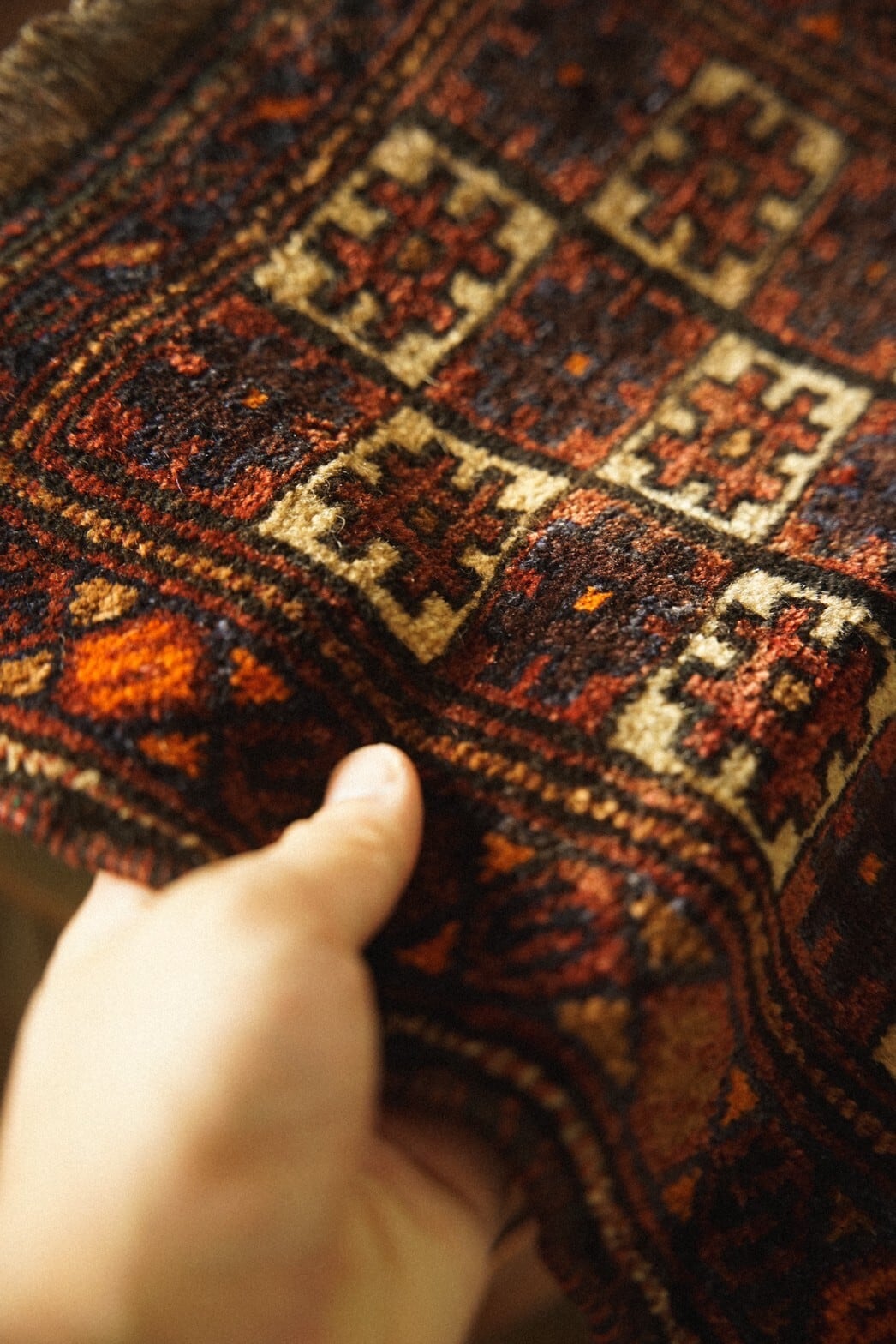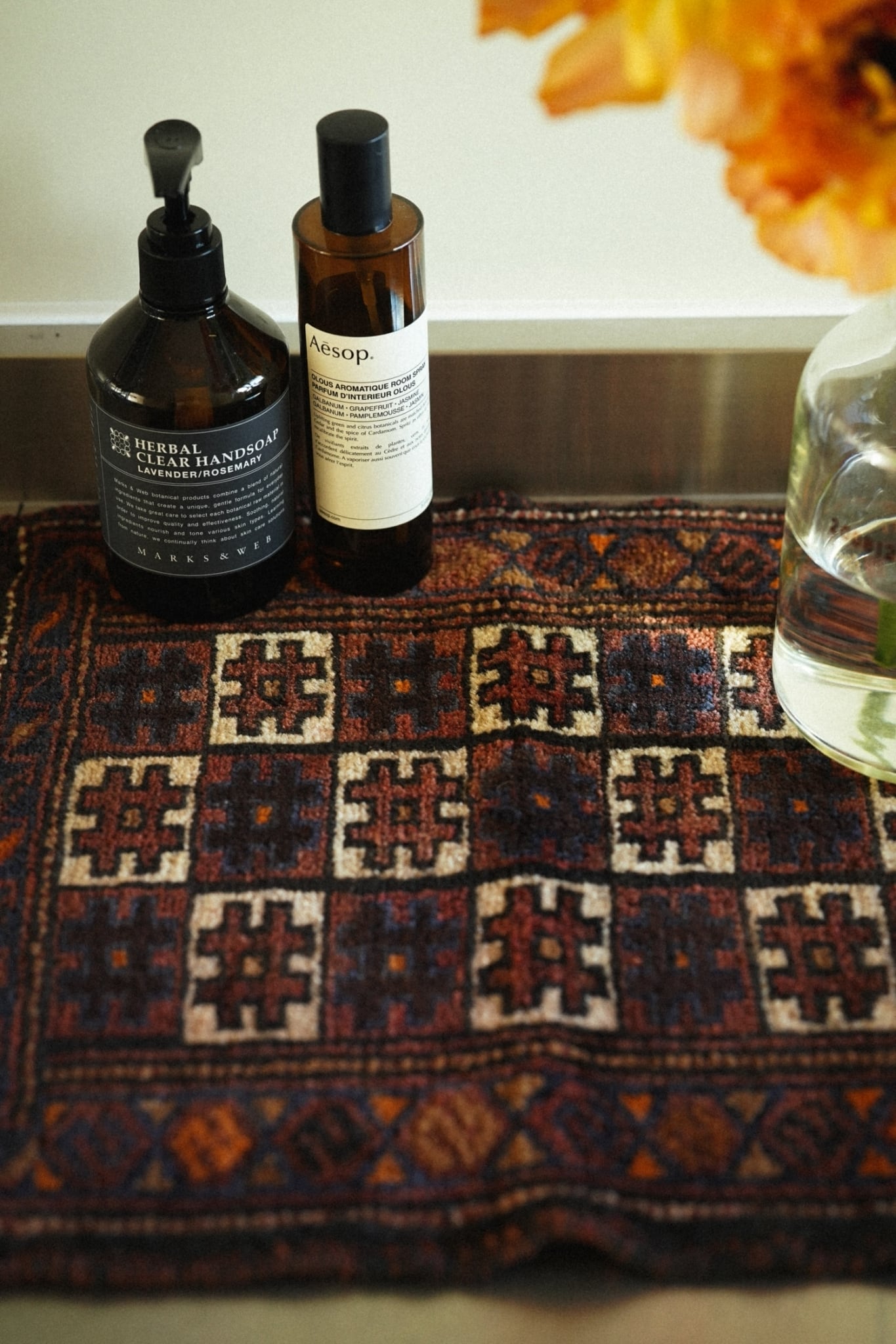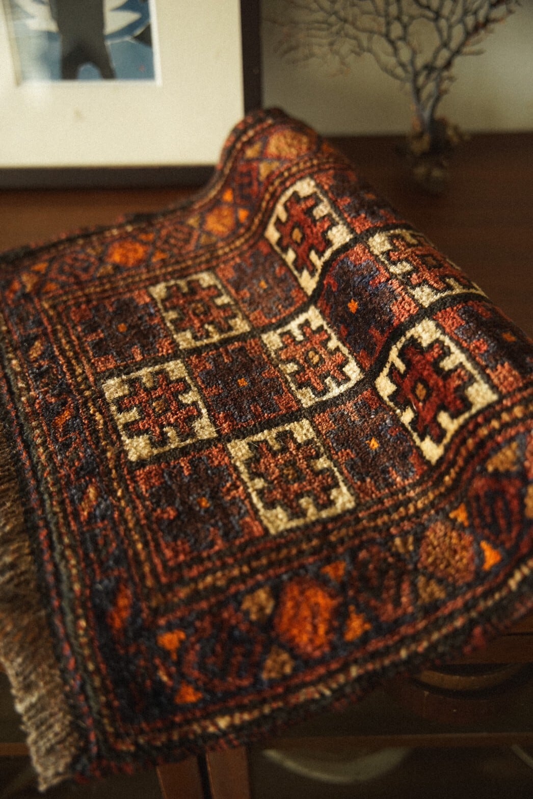 褪色によって温かみのあるブラウンに近い茜色にネイビー、アイボリー、オレンジなどの色構成で描かれているのは「井」の連続模様。パイルもしっかり綺麗に残っておりグッドコンディション。