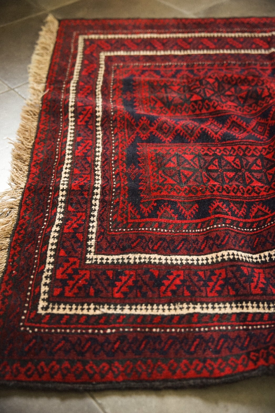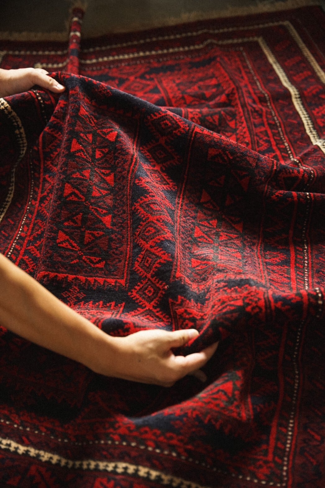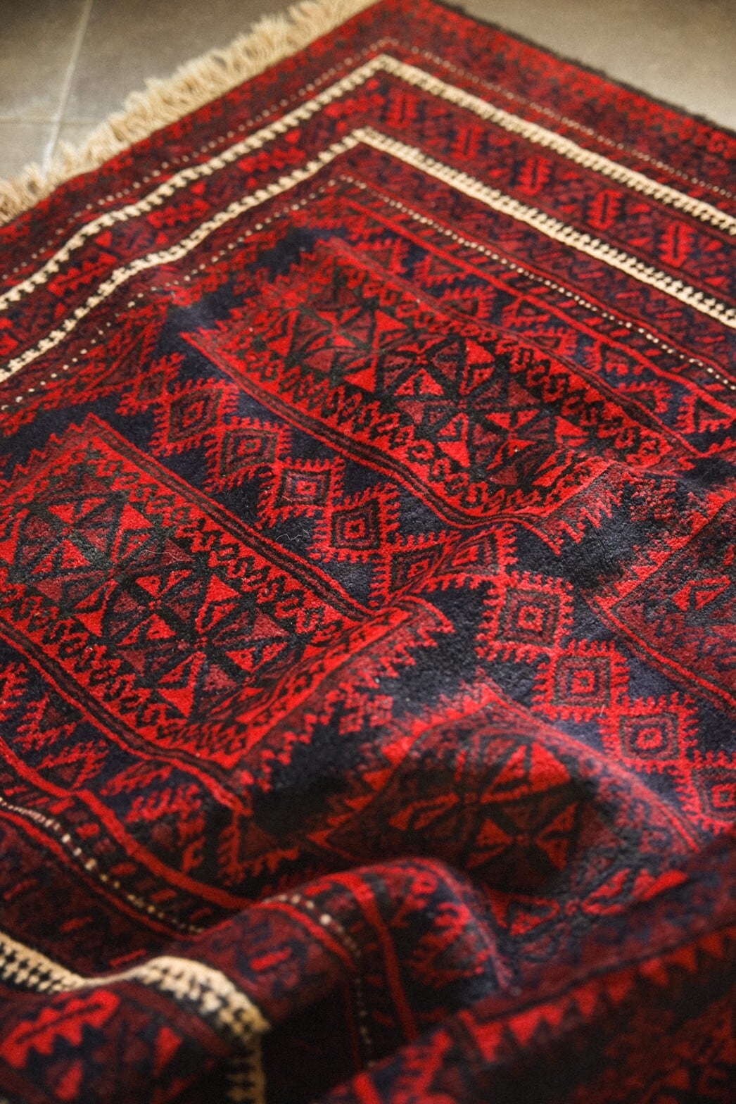 ネイビー×レッドのシンプルな配色に細かい連続紋様がたくさん描かれているYaqoob Khani の代表的なデザインのバルーチラグ。