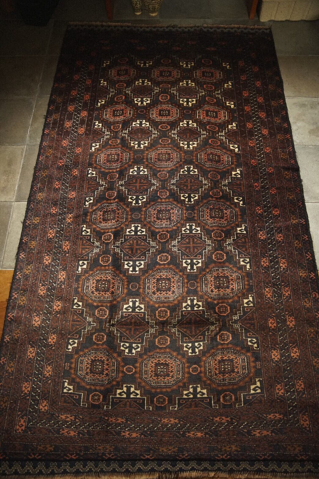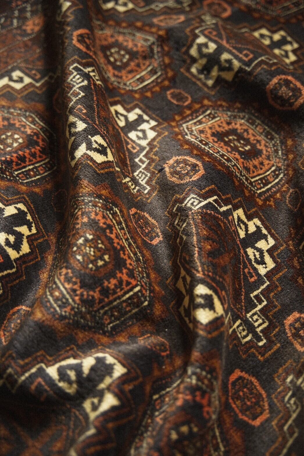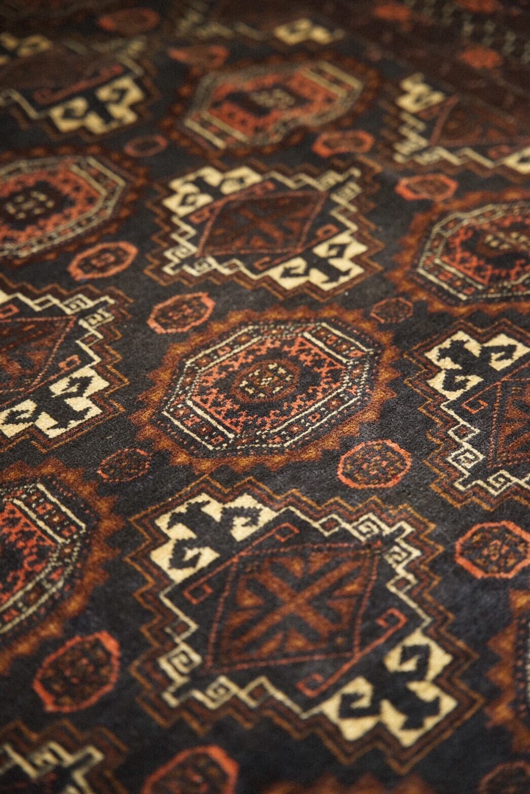 黒に近いネイビーのフィールドに幾何学的なギュルの反復紋様。