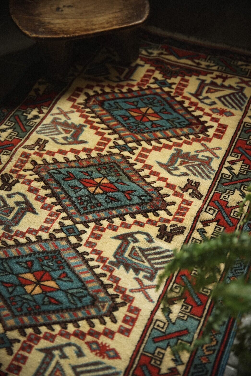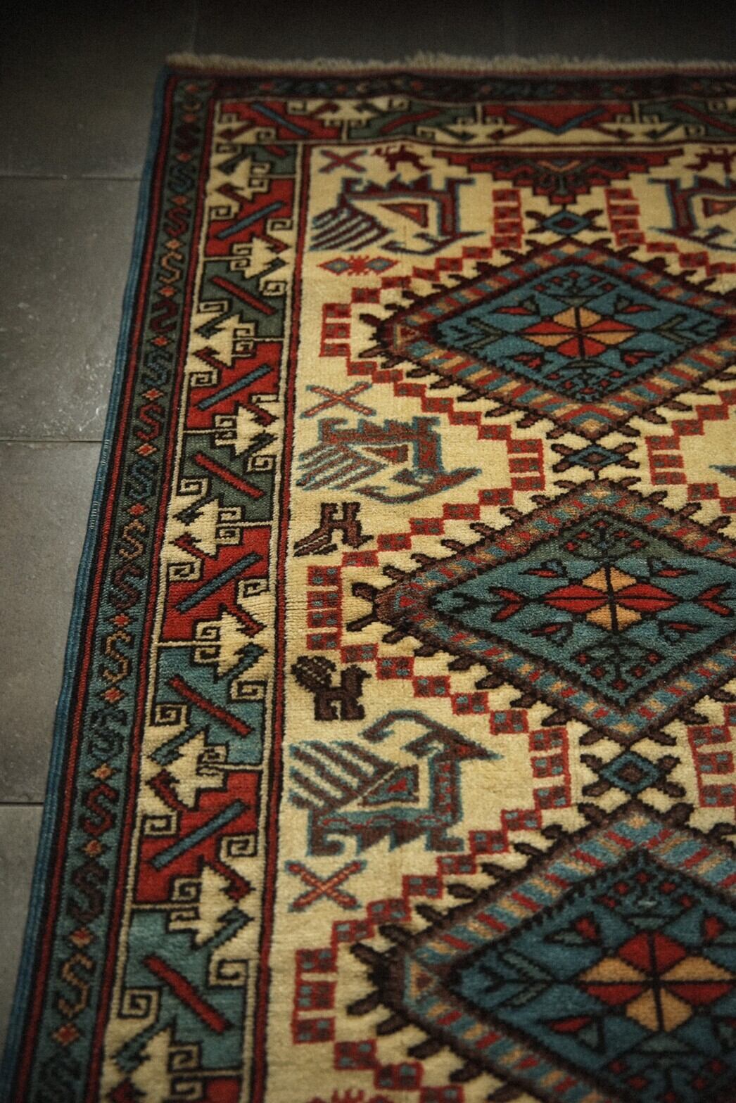 アゼルバイジャン産のカザックラグ。アイボリー、ブルー、レッド、オレンジの鮮明な色合いで幾何学文様が描かれています。真ん中の3連メダリオンの周りには鳥や動物たちがたくさん並んでいます。色んな文化が混じり合う場所ならではの豊かな表現力や色彩感覚を感じることのできる一枚。