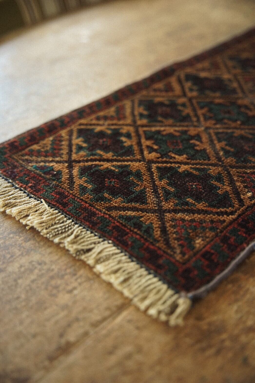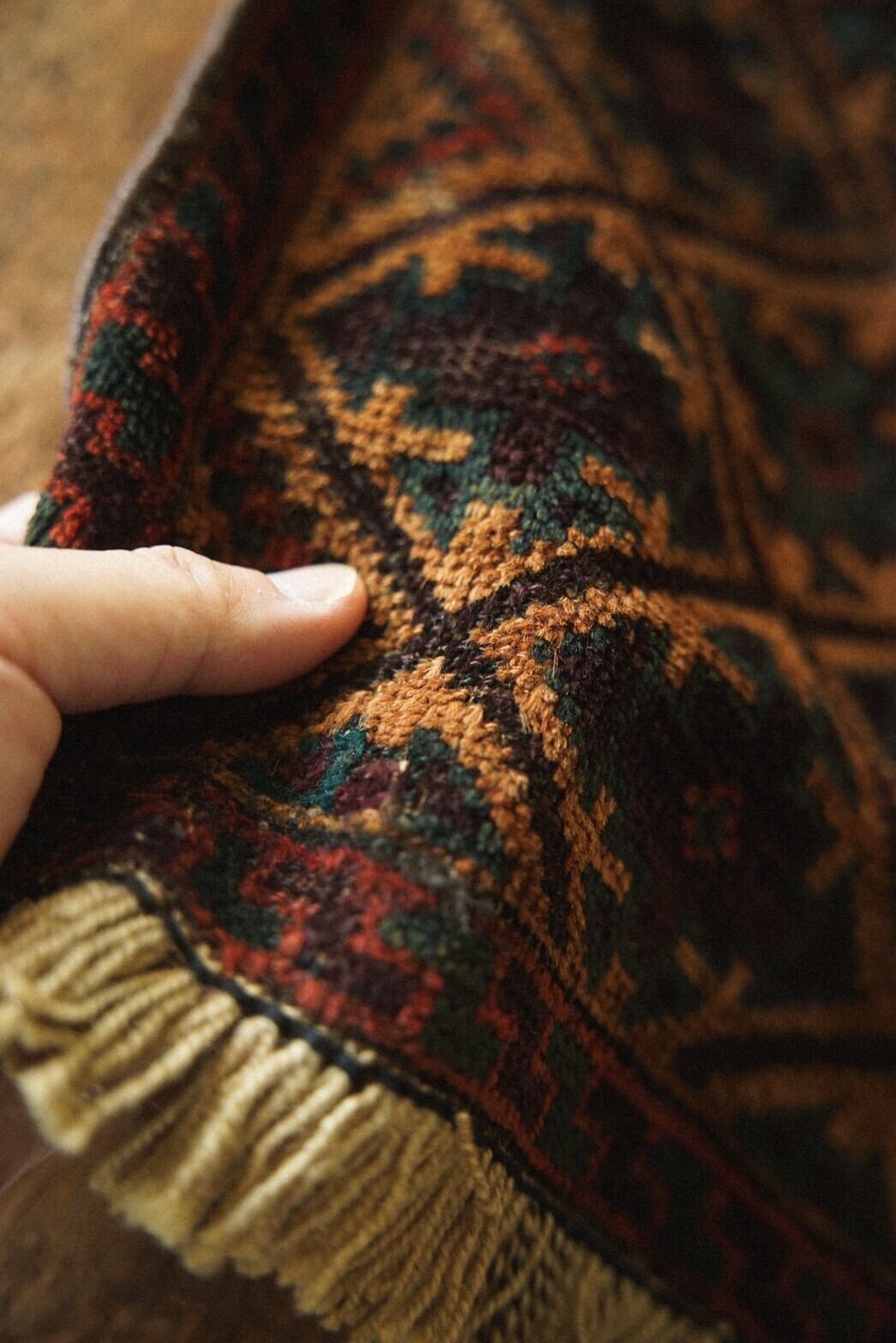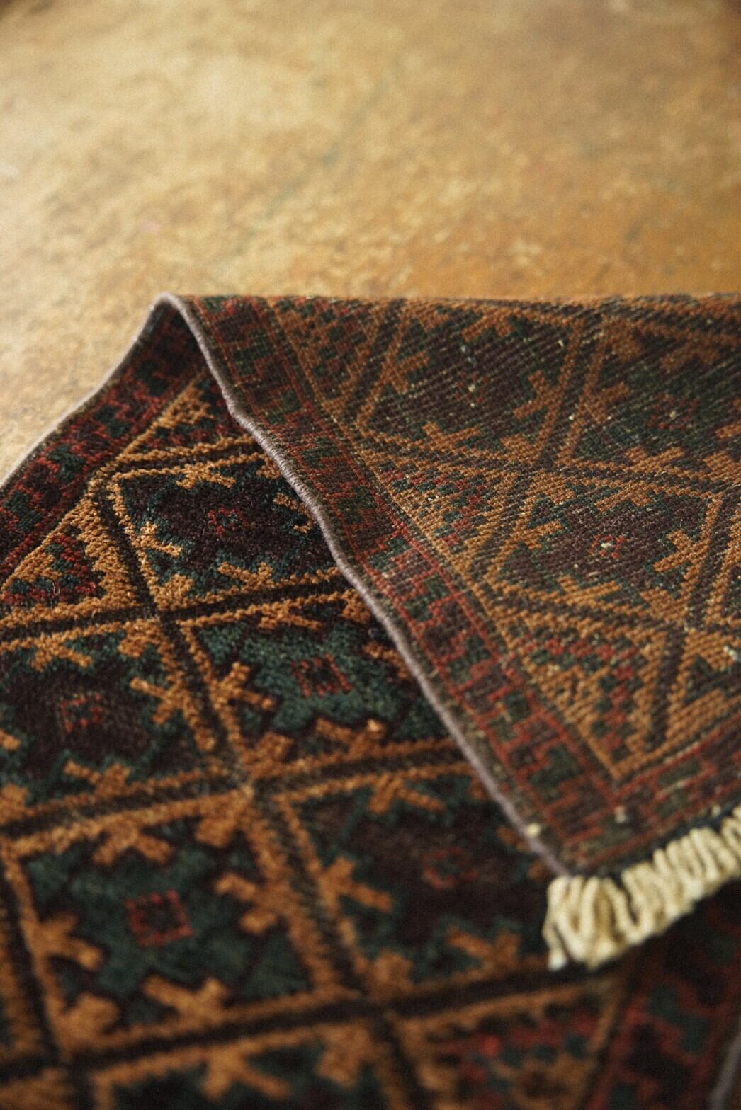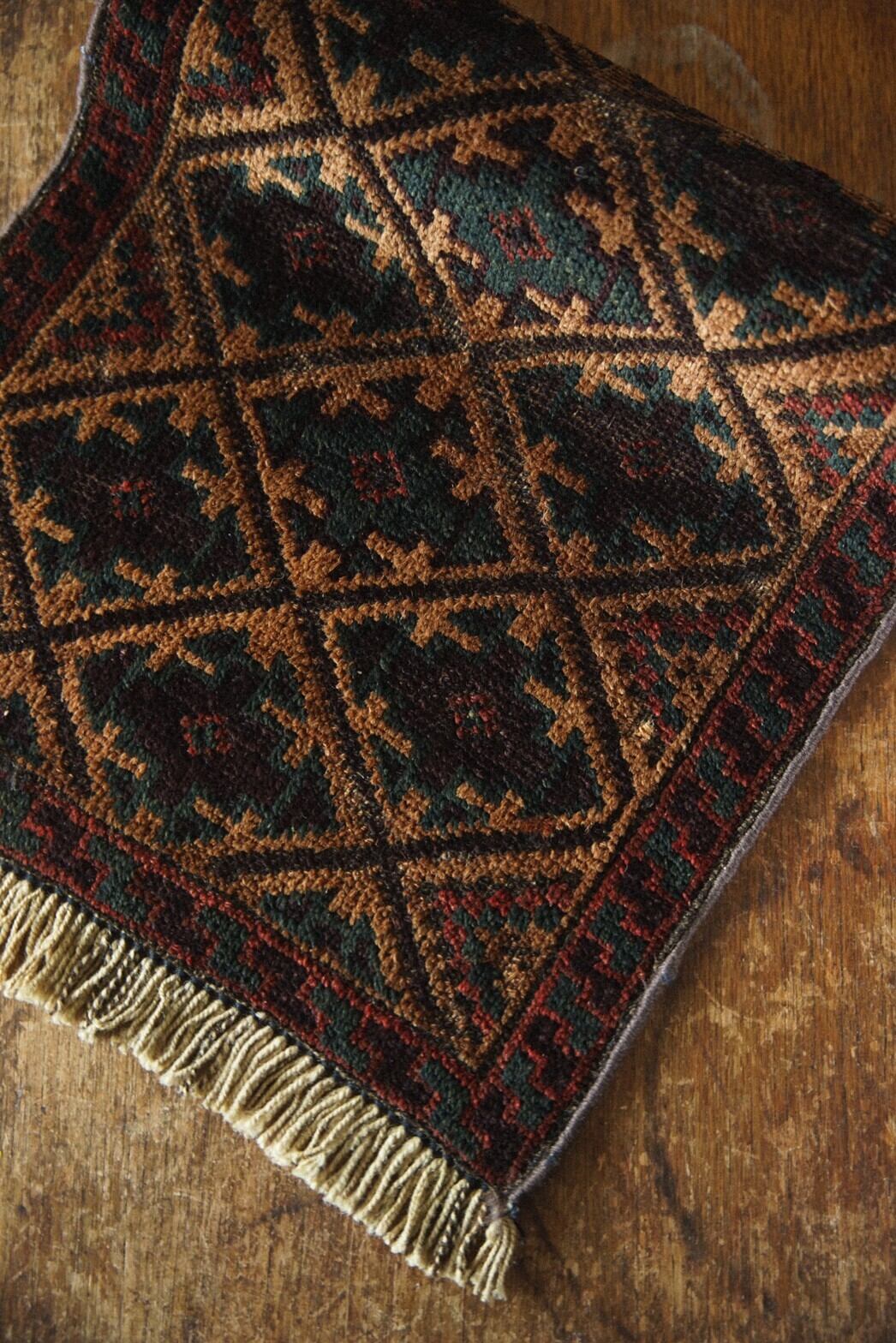 キャメル、ボルドー、レッド、そして深みのあるグリーンの配色がとても渋くてかっこいいバルーチラグ。