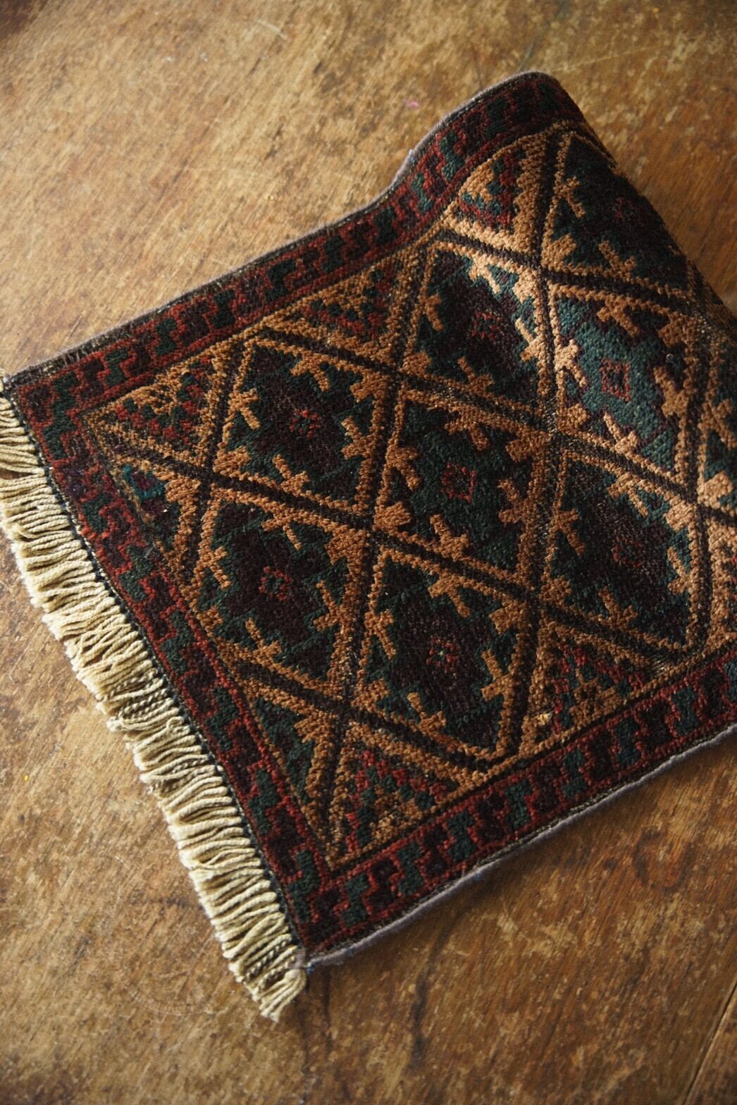 パイルは低めの薄手タイプで、古いラグならではの風合いやクタクタ感もたまらない一枚です。